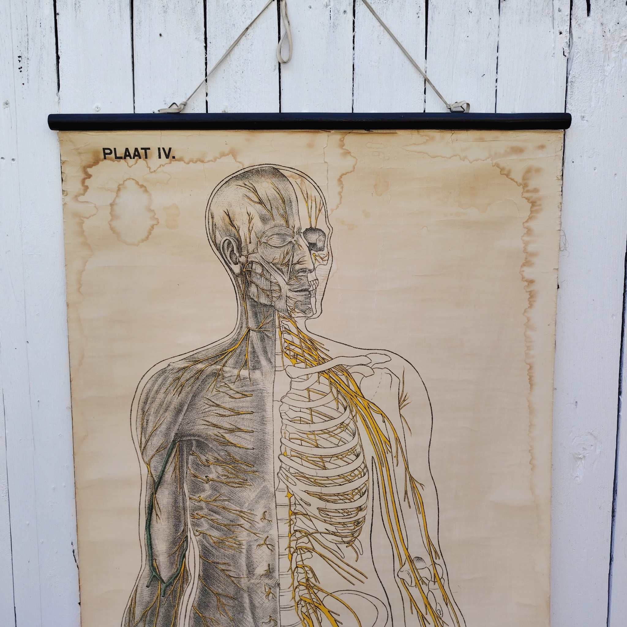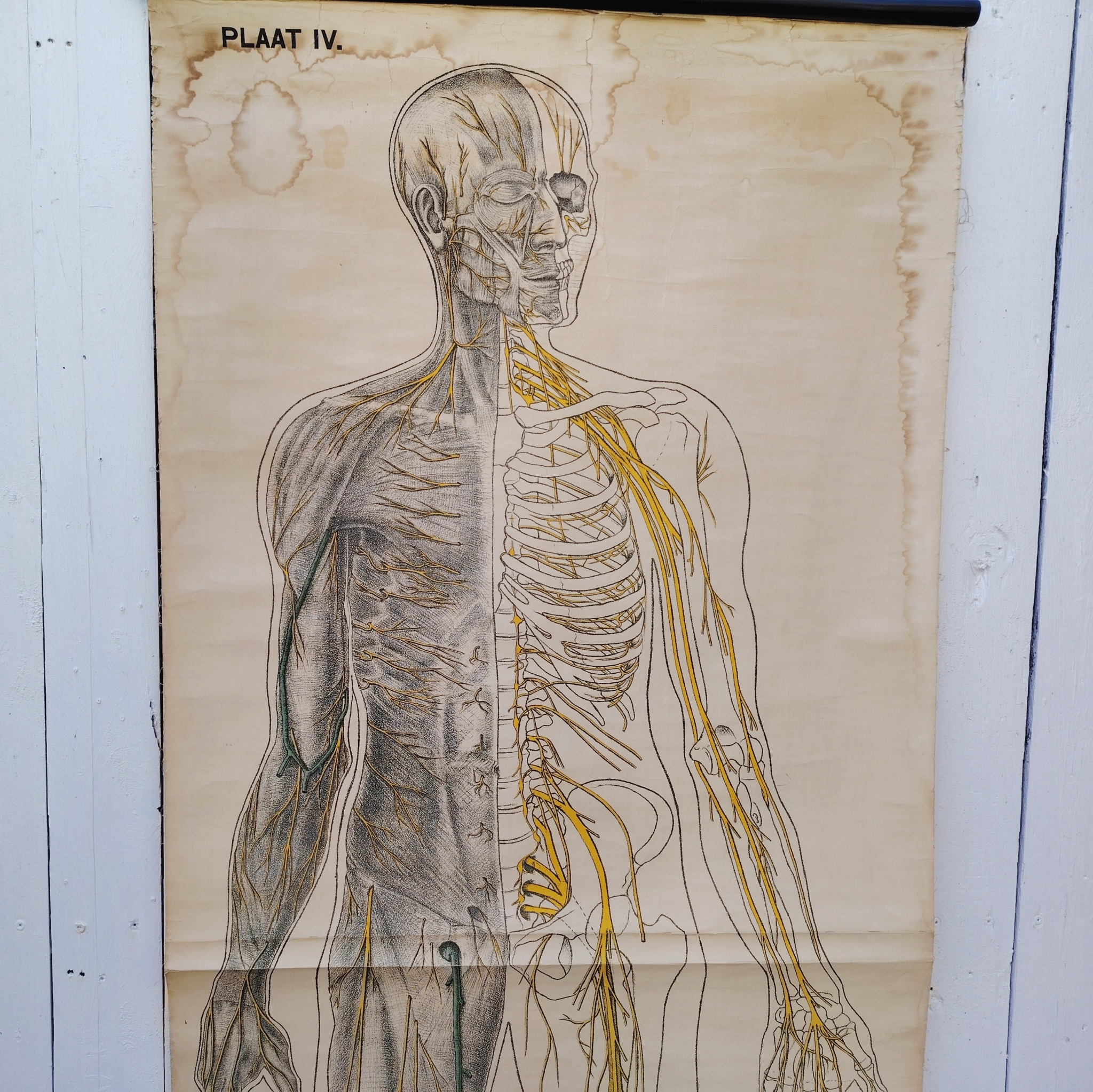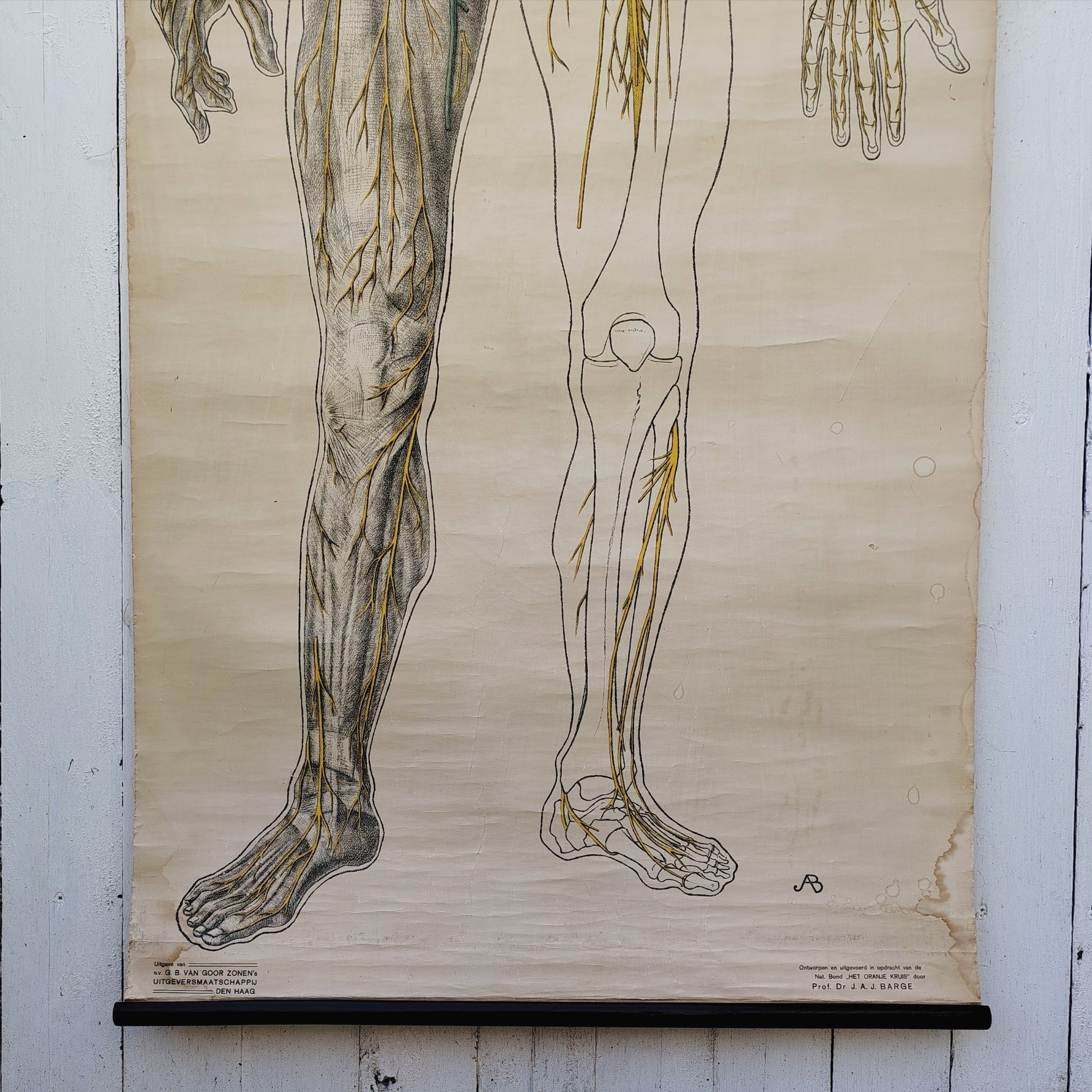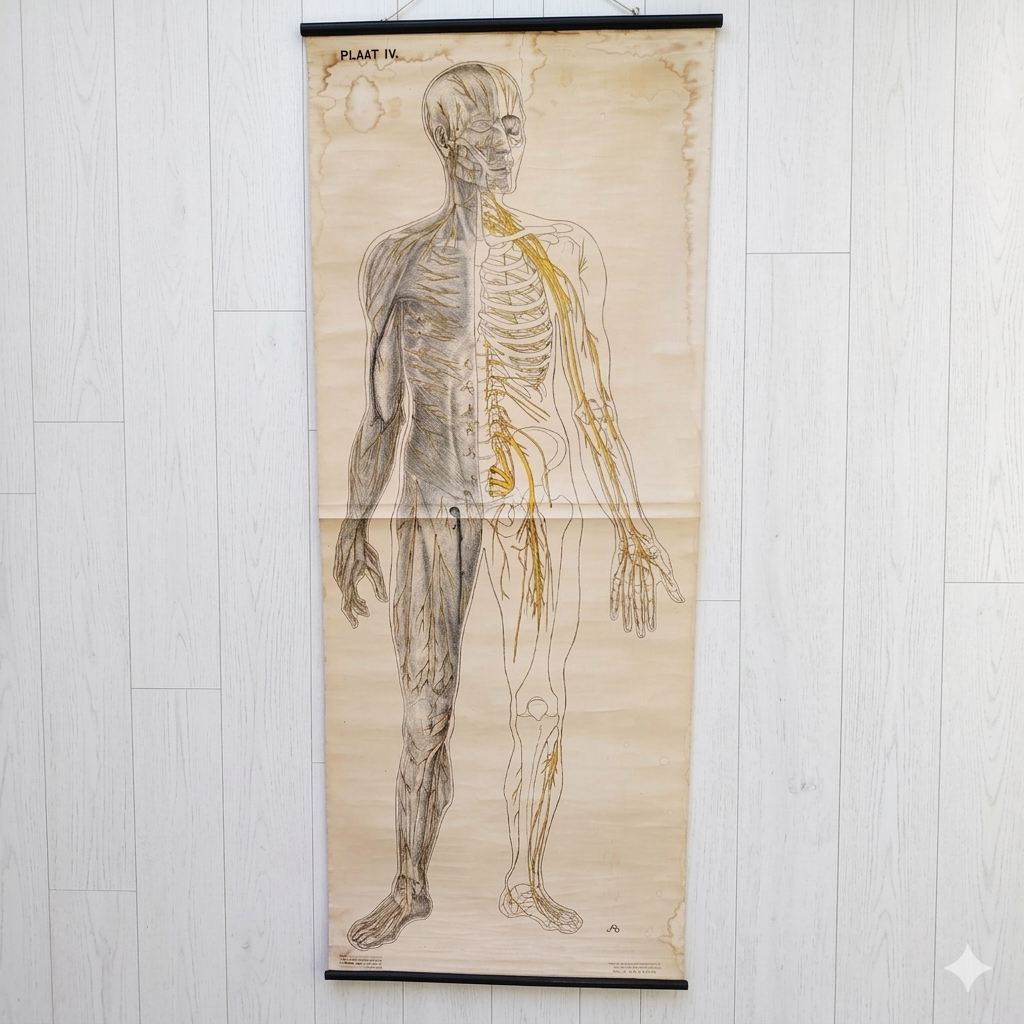 Très belle et grande planche scolaireen toile du corps humain, centrée sur le système nerveux, Provenant des Pays-bas. Publiée par N.V. G.B. Van Goor Zonen’s Uitgeversmaatschappij de La Haye, cette planche a été conçue sur commande pour l’association nationale « HET ORANJE KRUIS » par le professeur J.A.J. Barge.