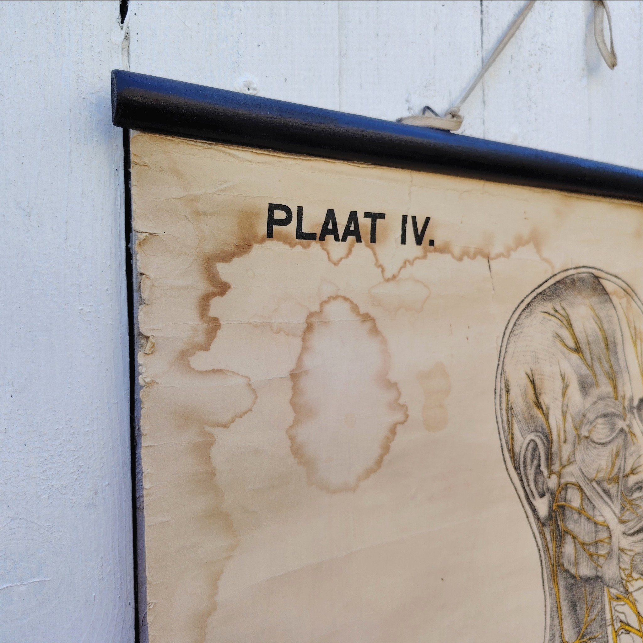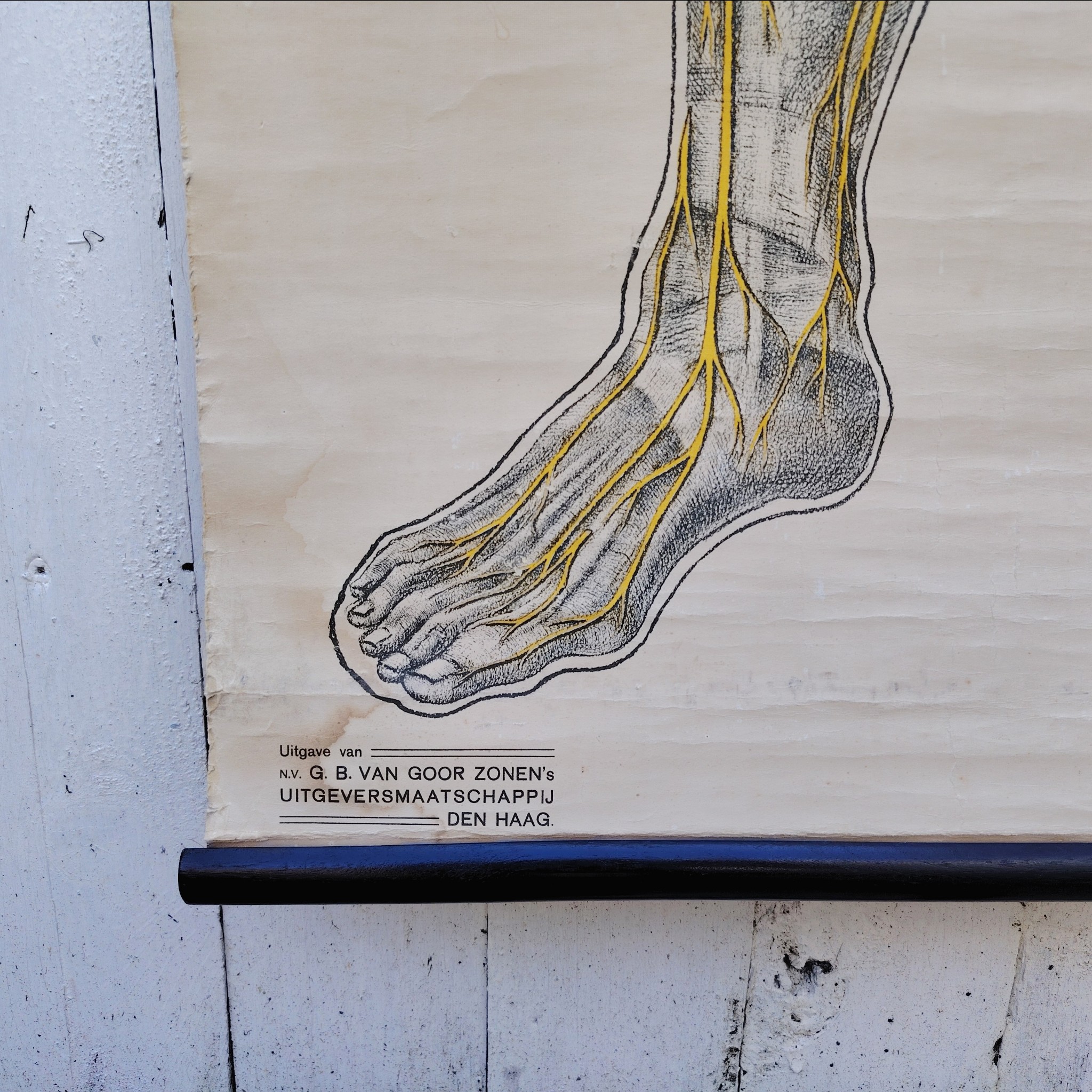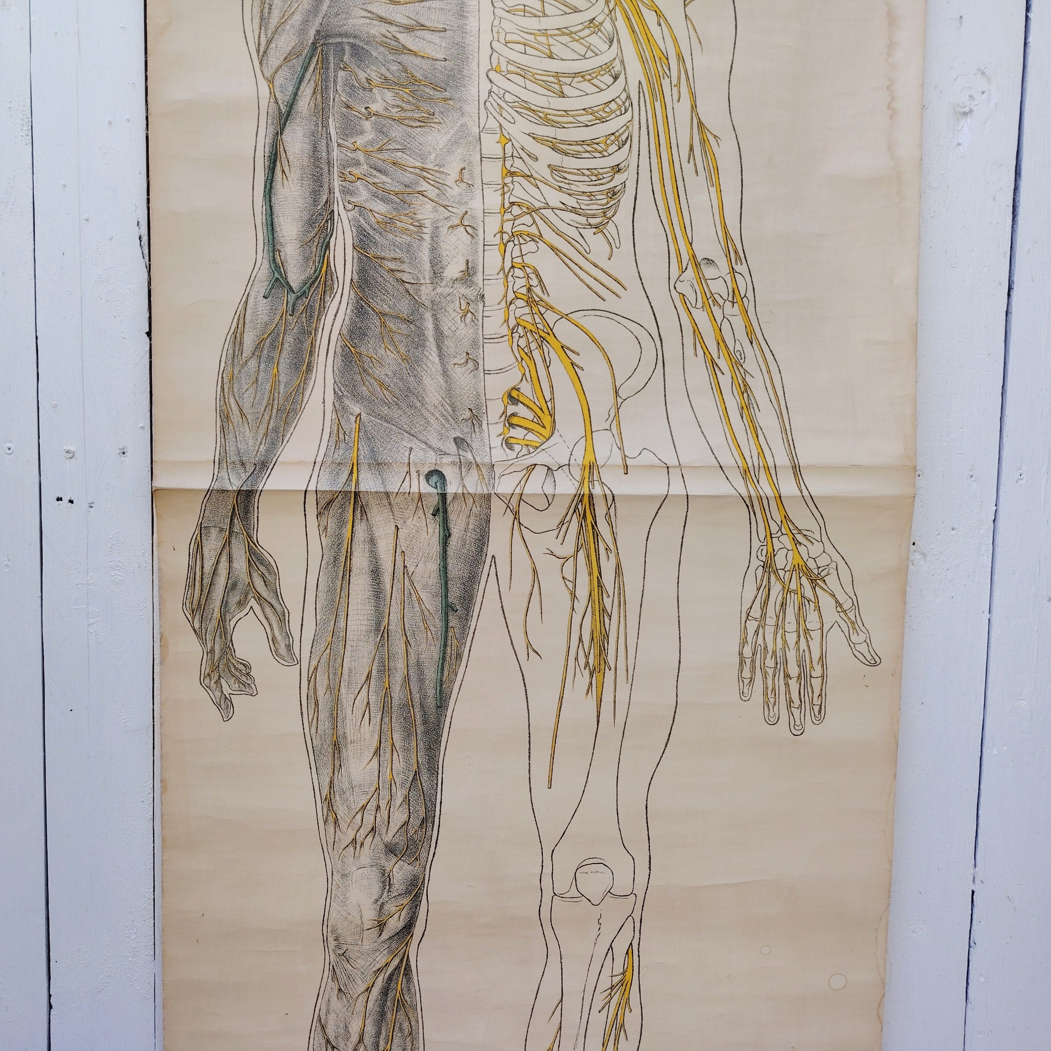 Très belle et grande planche scolaireen toile du corps humain, centrée sur le système nerveux, Provenant des Pays-bas. Publiée par N.V. G.B. Van Goor Zonen’s Uitgeversmaatschappij de La Haye, cette planche a été conçue sur commande pour l’association nationale « HET ORANJE KRUIS » par le professeur J.A.J. Barge.