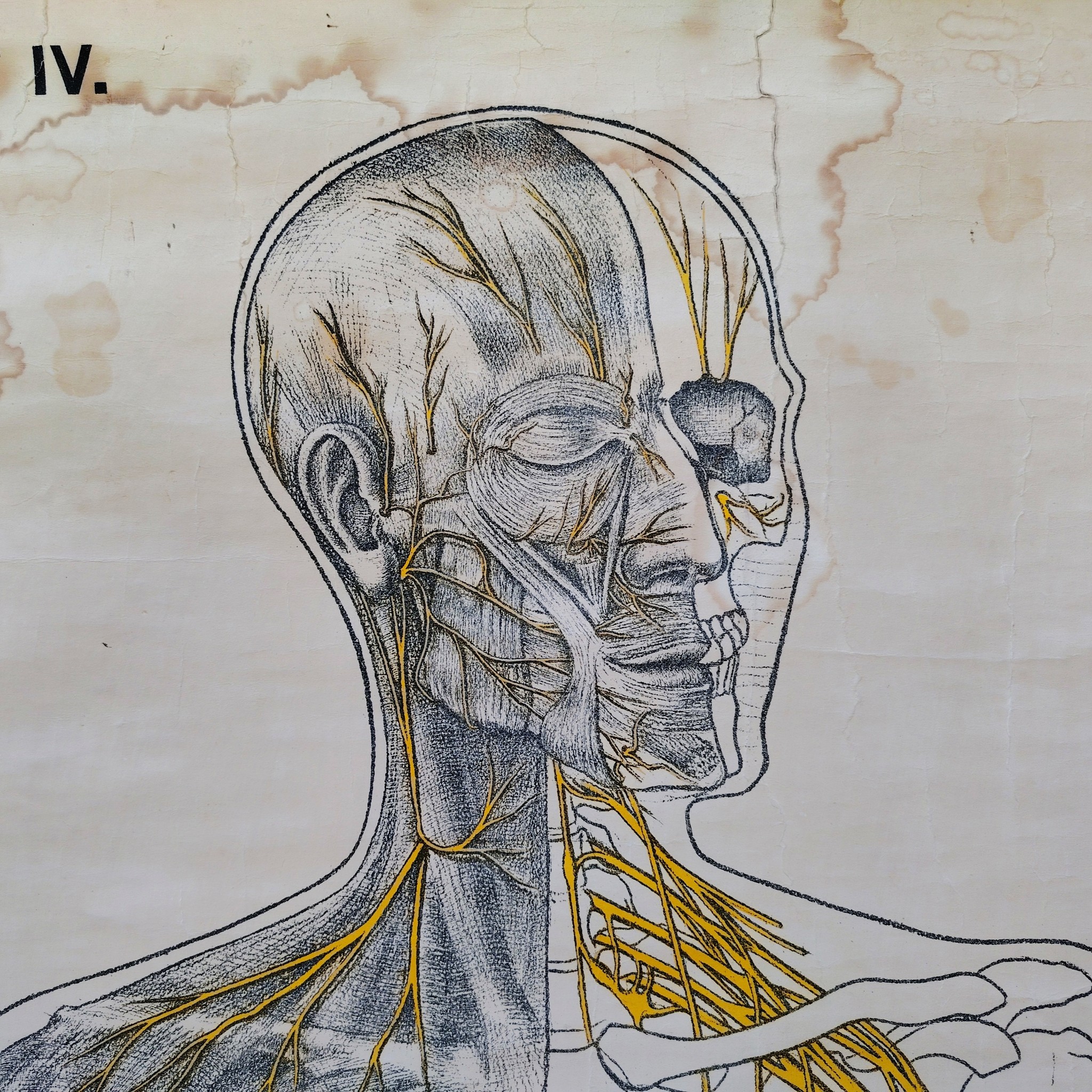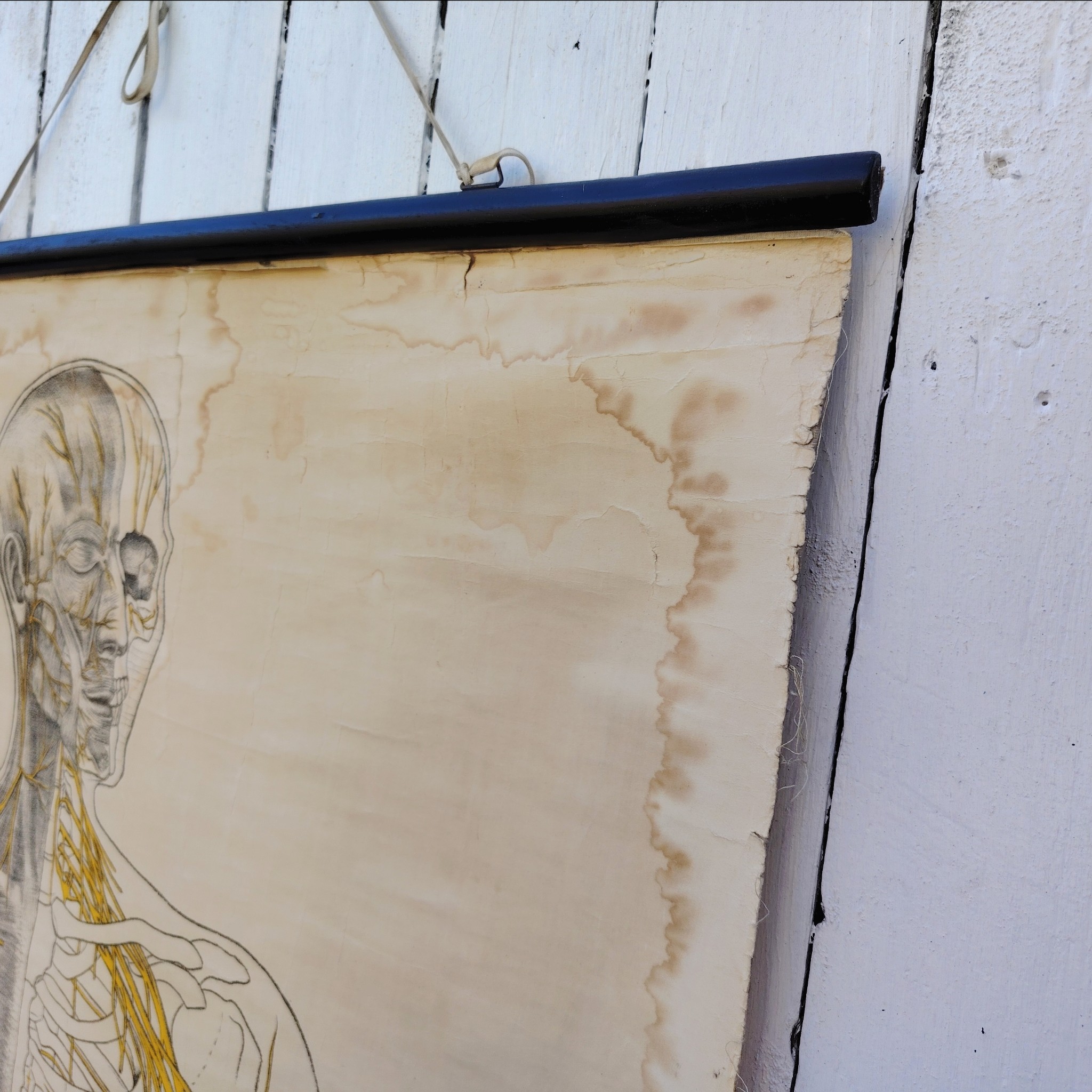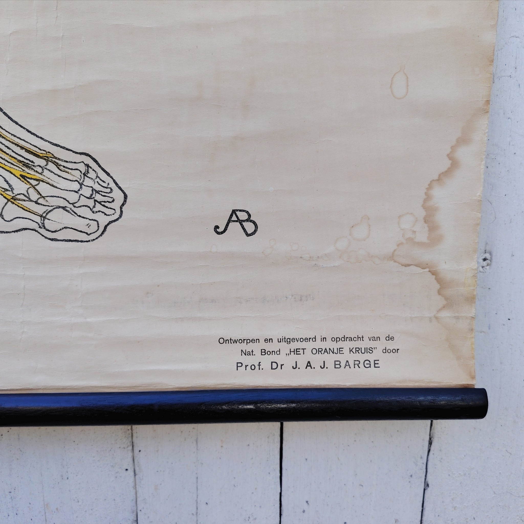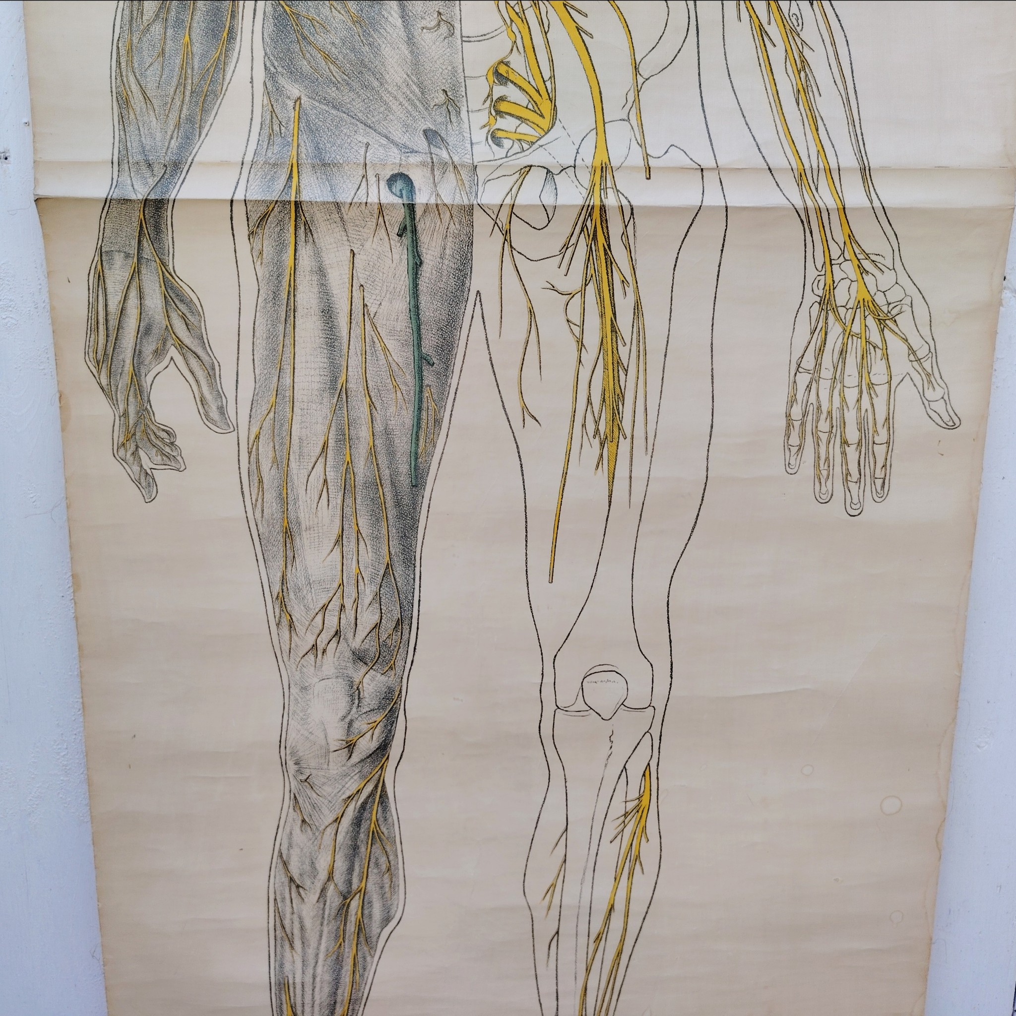 Très belle et grande planche scolaireen toile du corps humain, centrée sur le système nerveux, Provenant des Pays-bas. Publiée par N.V. G.B. Van Goor Zonen’s Uitgeversmaatschappij de La Haye, cette planche a été conçue sur commande pour l’association nationale « HET ORANJE KRUIS » par le professeur J.A.J. Barge.