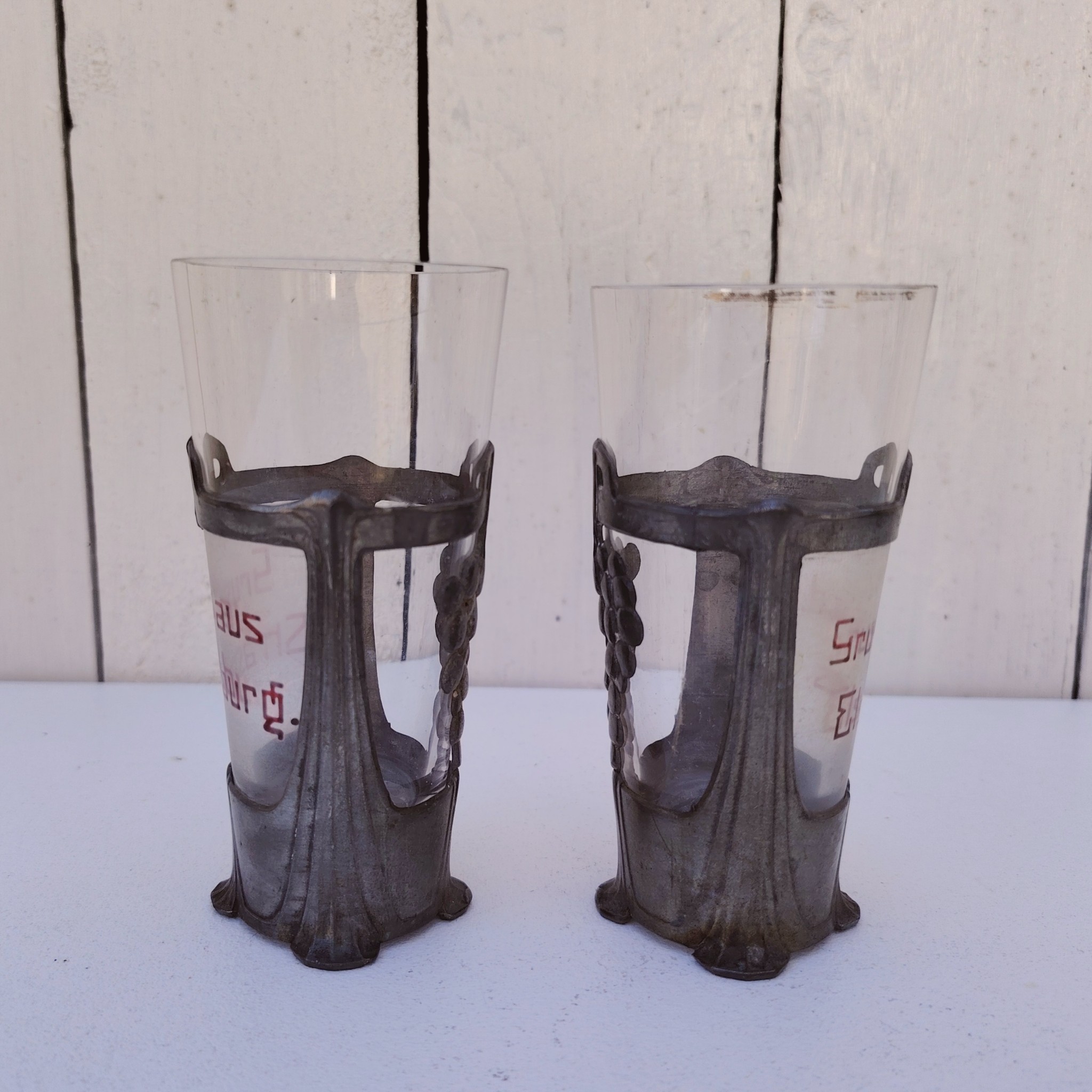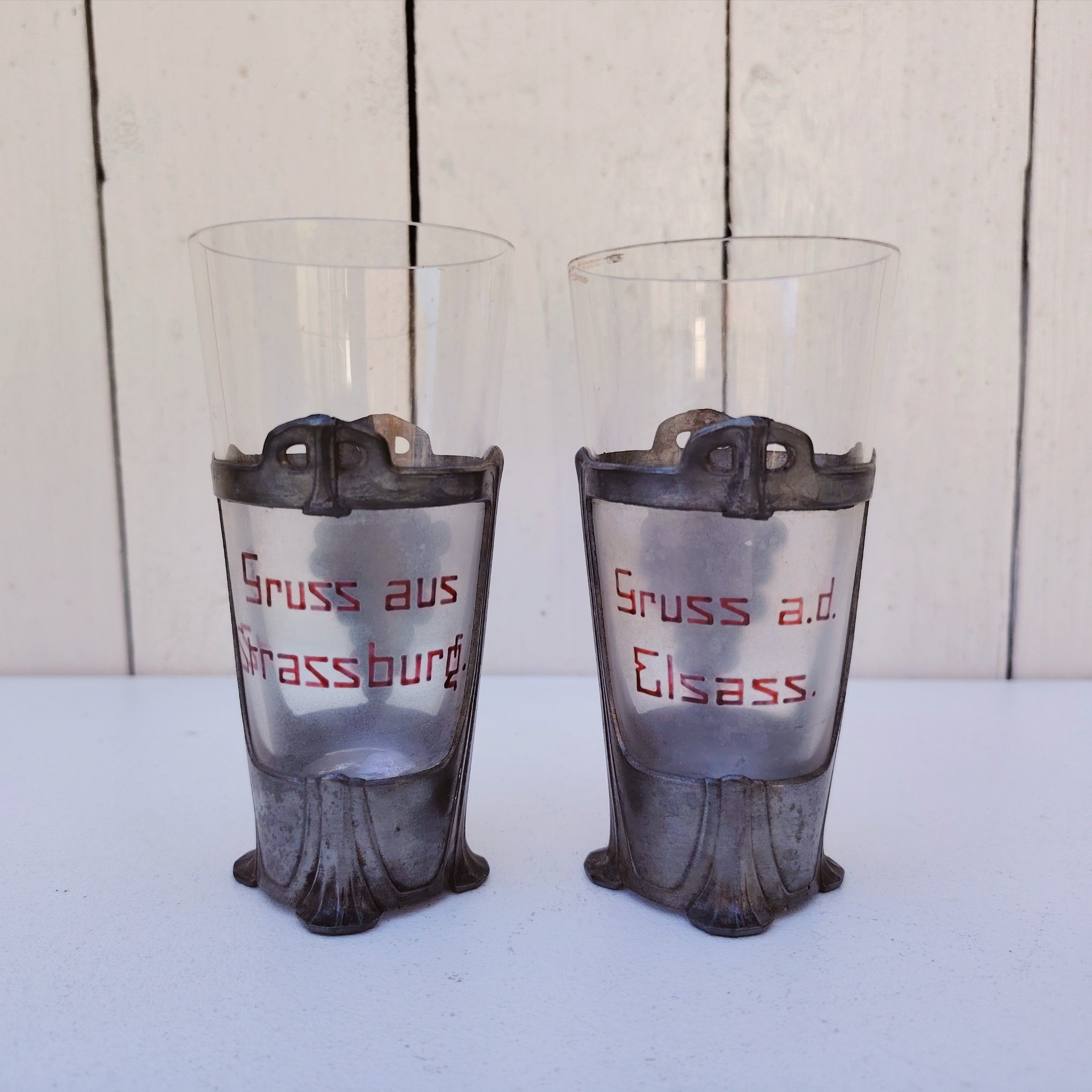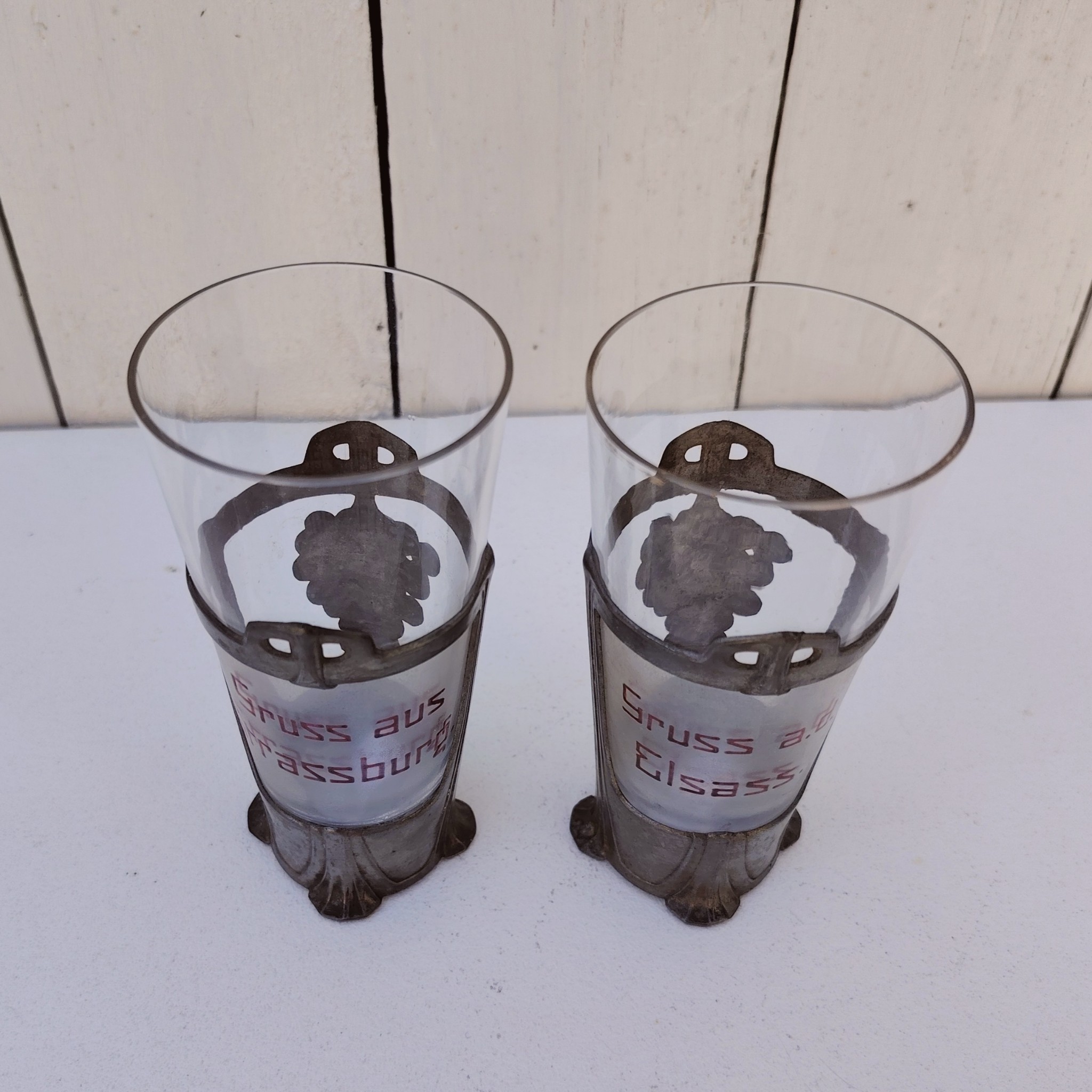 Paire d’anciens verres à Riesling souvenir d’Alsace de style art nouveau, cerclés d’étain et écriture émaillée. Décor de grappes de raisin en étain. L’un noté » Gruss aus Strasburg » et l’autre » Gruss a.d Elsass »