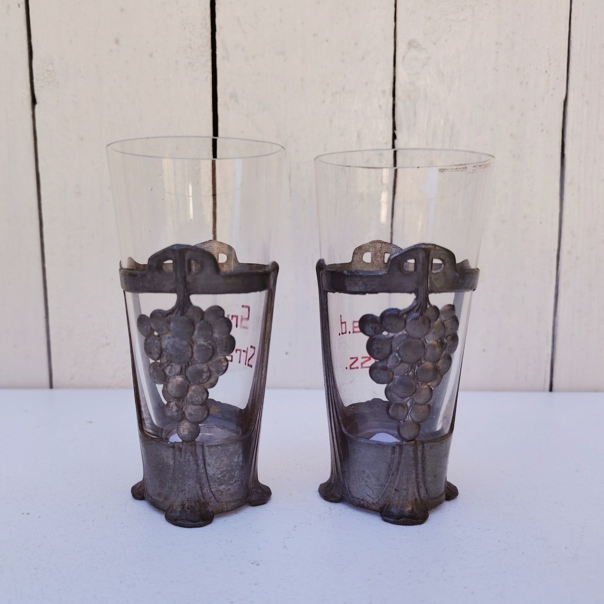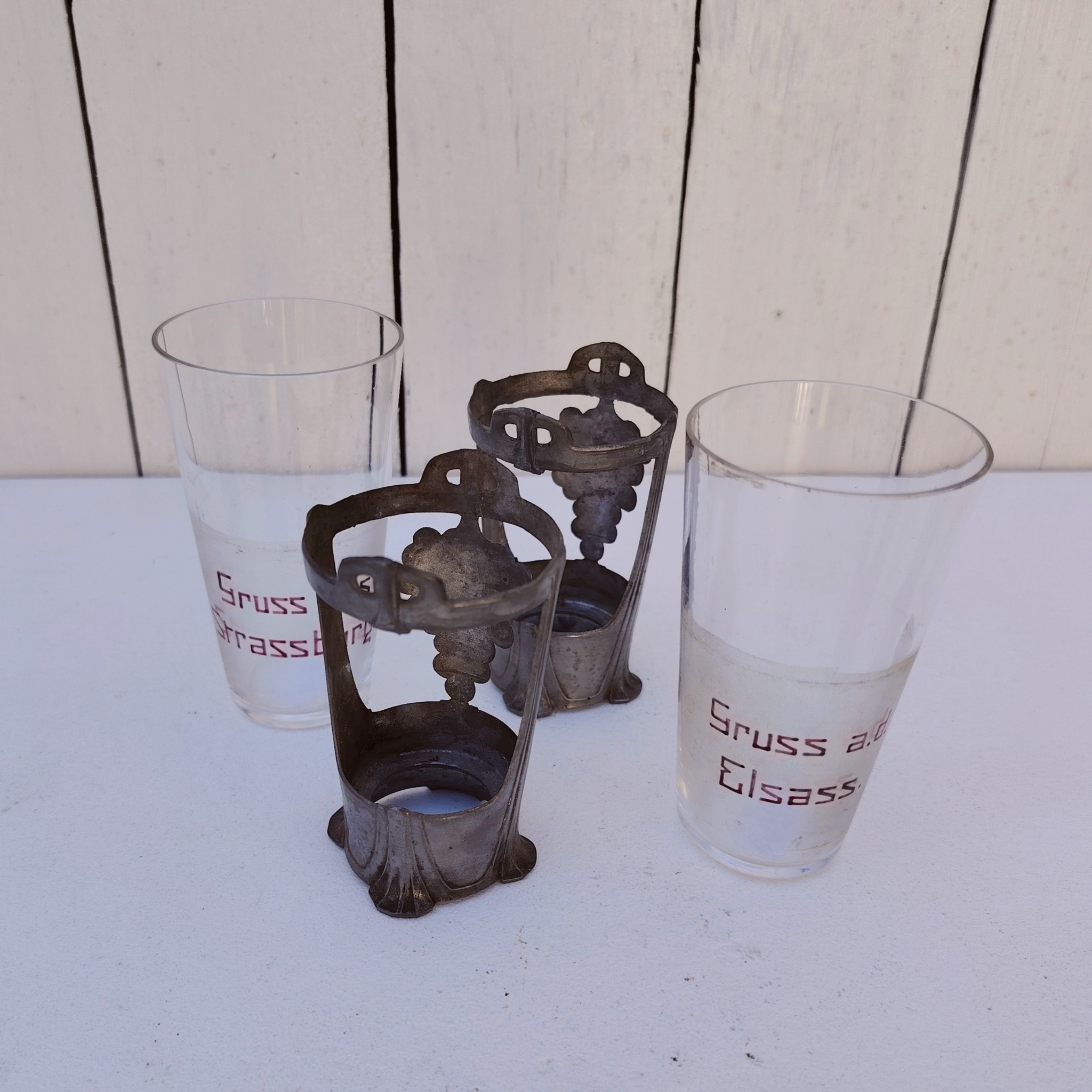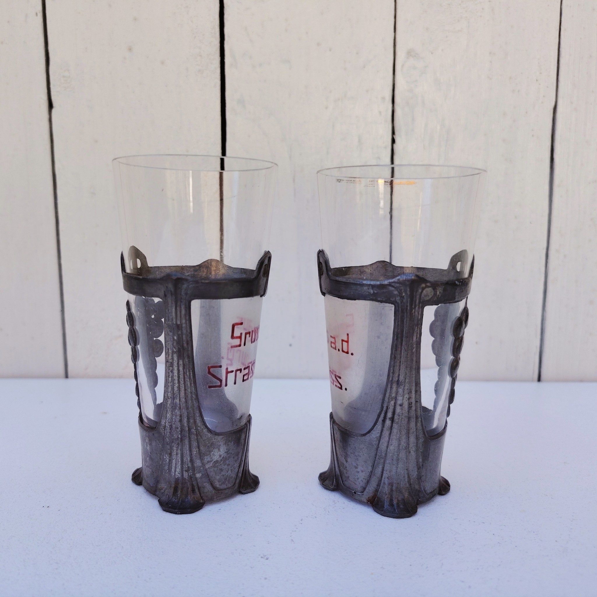 Paire d’anciens verres à Riesling souvenir d’Alsace de style art nouveau, cerclés d’étain et écriture émaillée. Décor de grappes de raisin en étain. L’un noté » Gruss aus Strasburg » et l’autre » Gruss a.d Elsass »