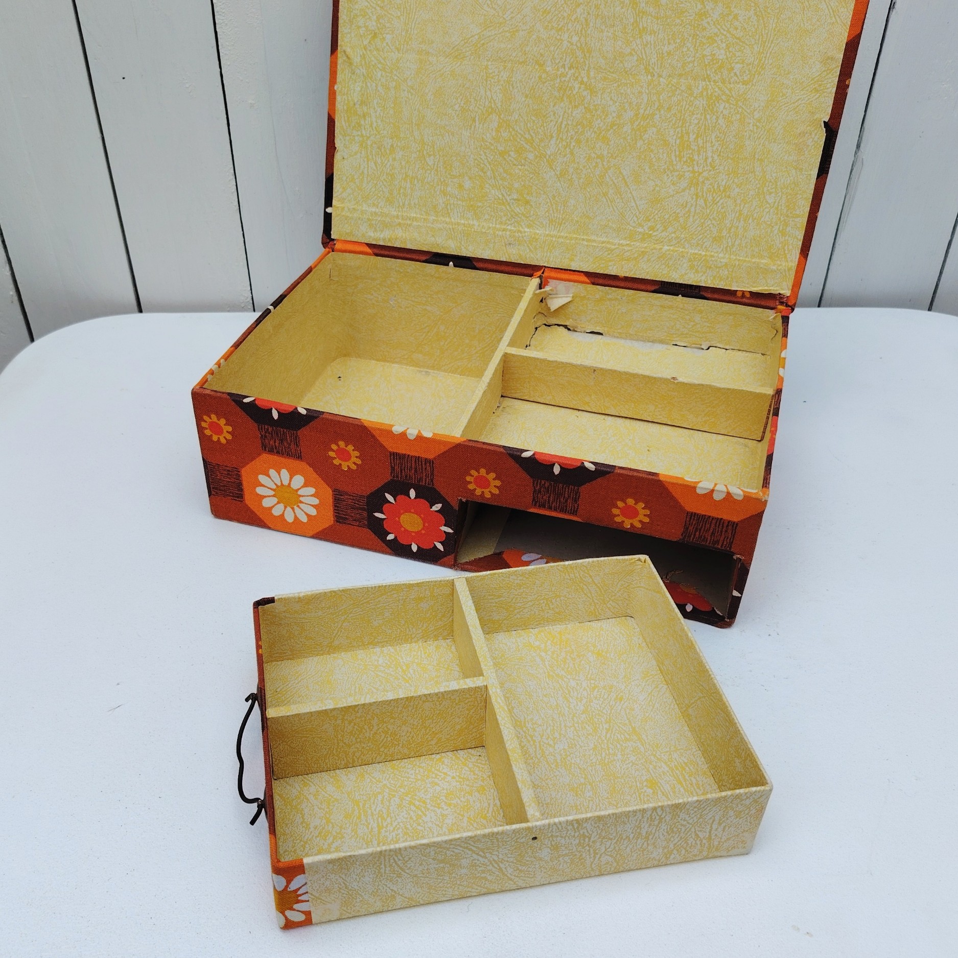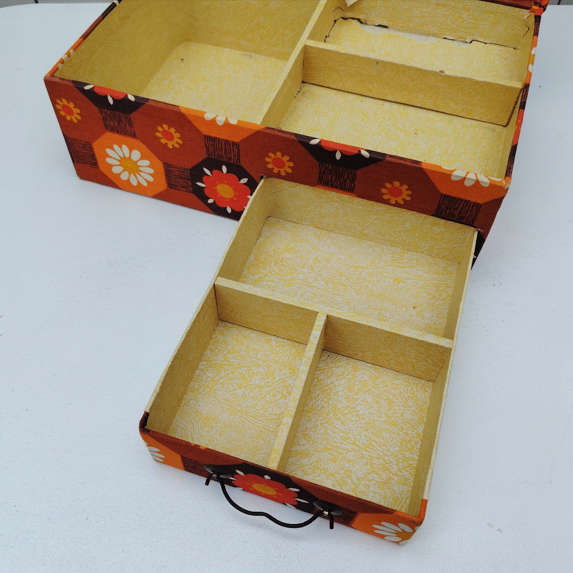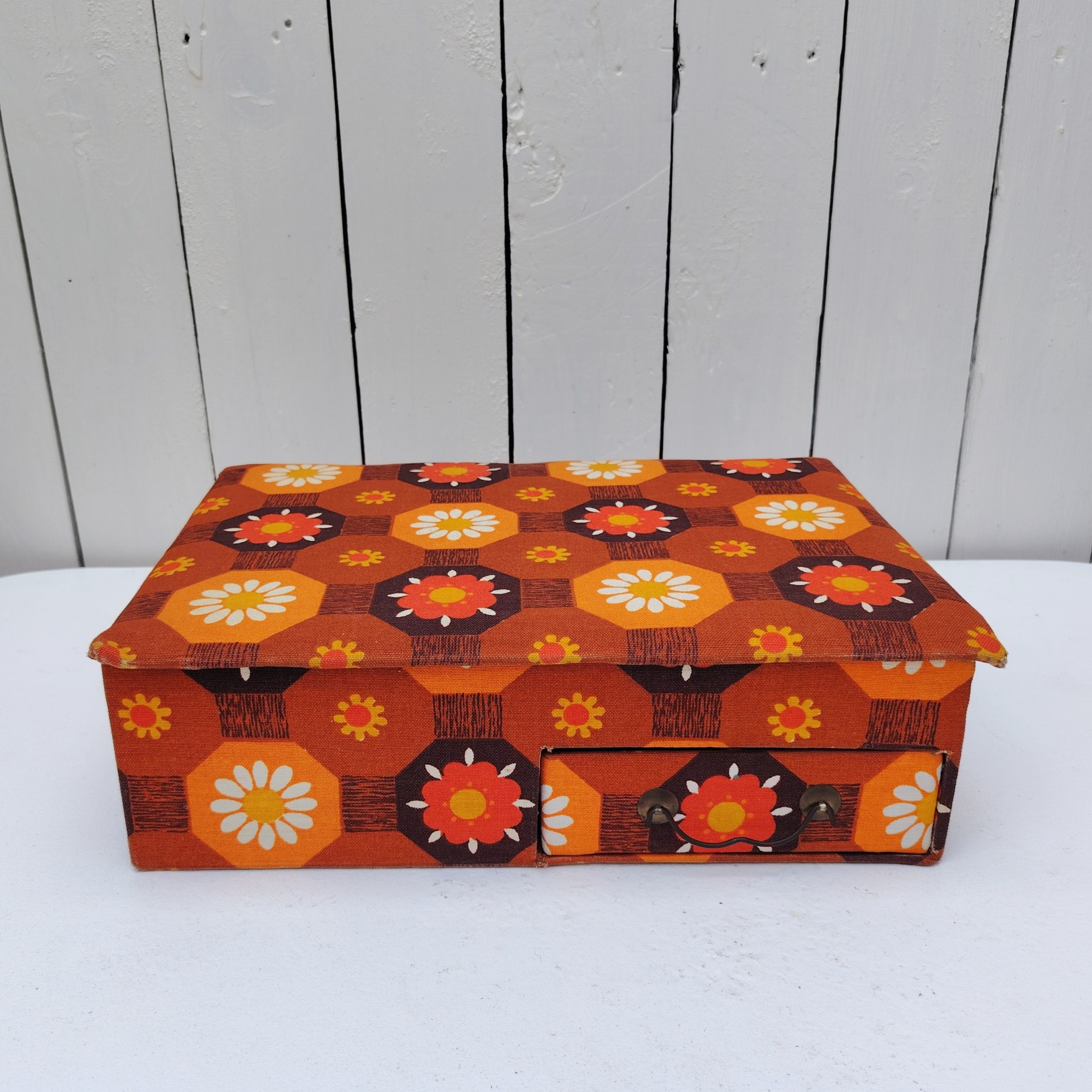Boite à ouvrage ou couture datant des années 60-70 . Recouverte de tissu fleuri typique de cette époque. compartimentée en trois casiers à l’intérieur et d’un tiroir sur le devant