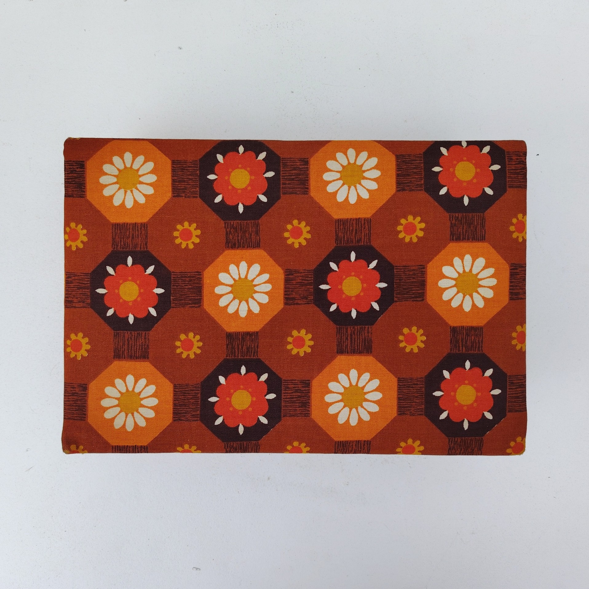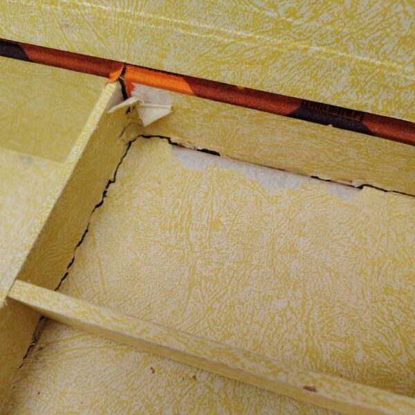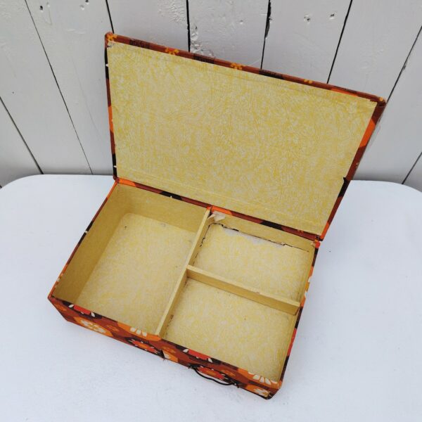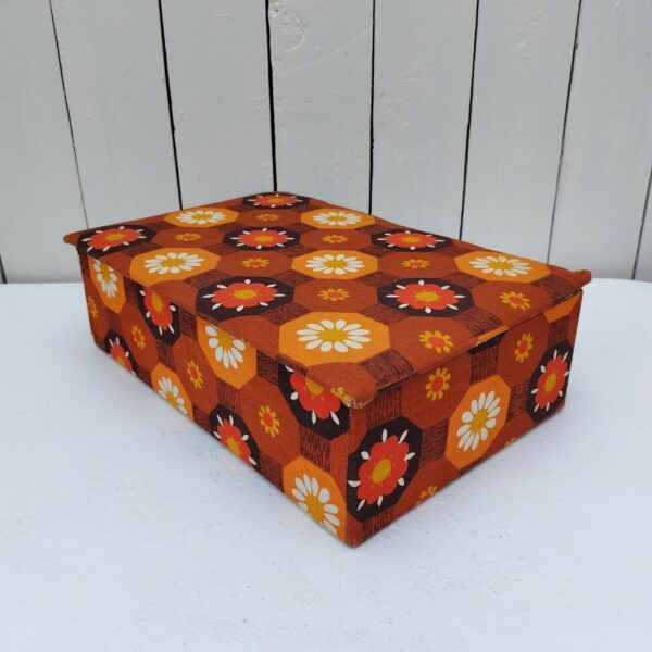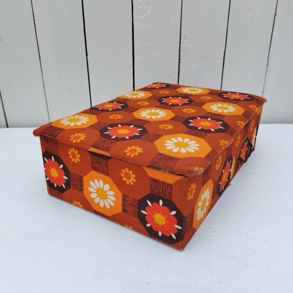Boite à ouvrage ou couture datant des années 60-70 . Recouverte de tissu fleuri typique de cette époque. compartimentée en trois casiers à l’intérieur et d’un tiroir sur le devant