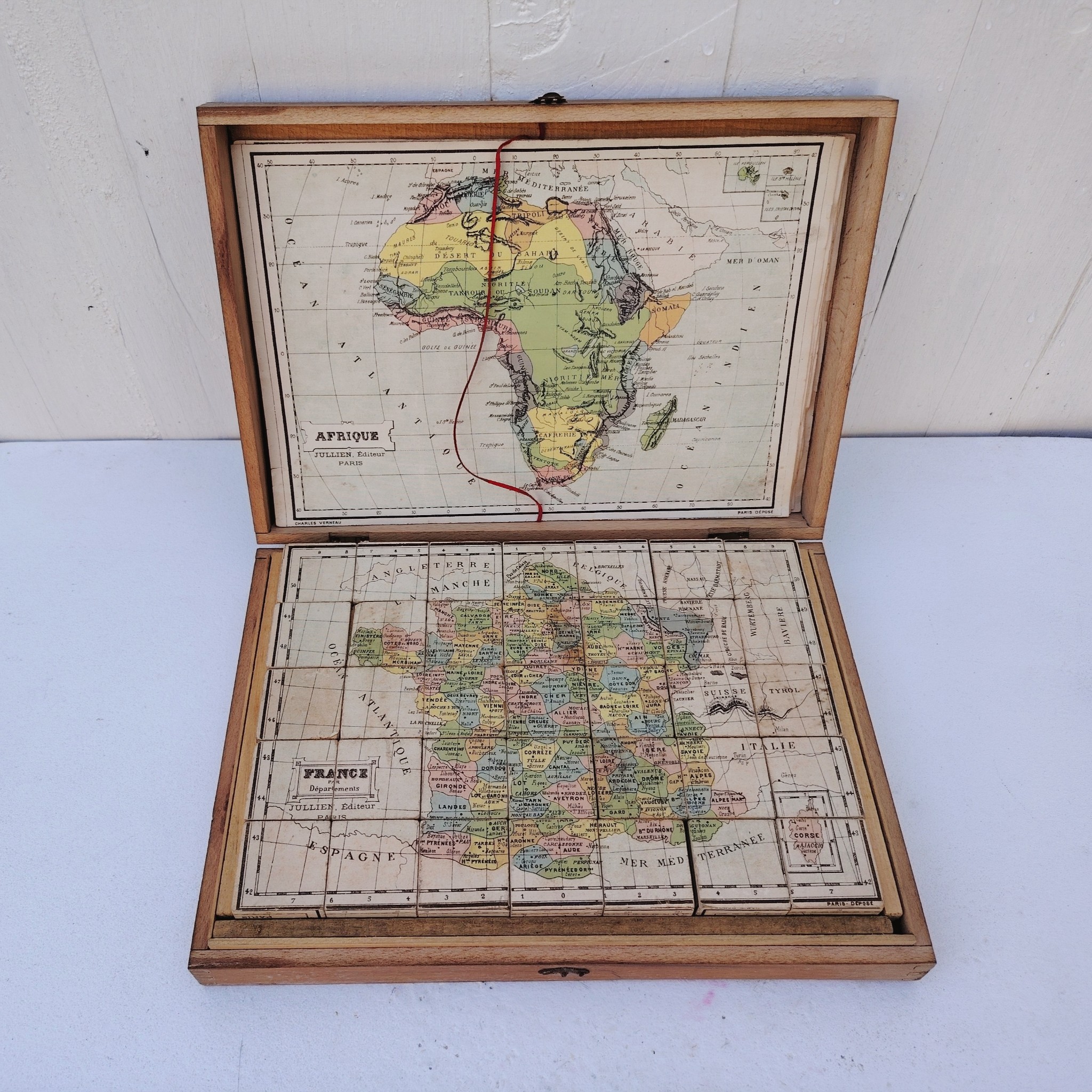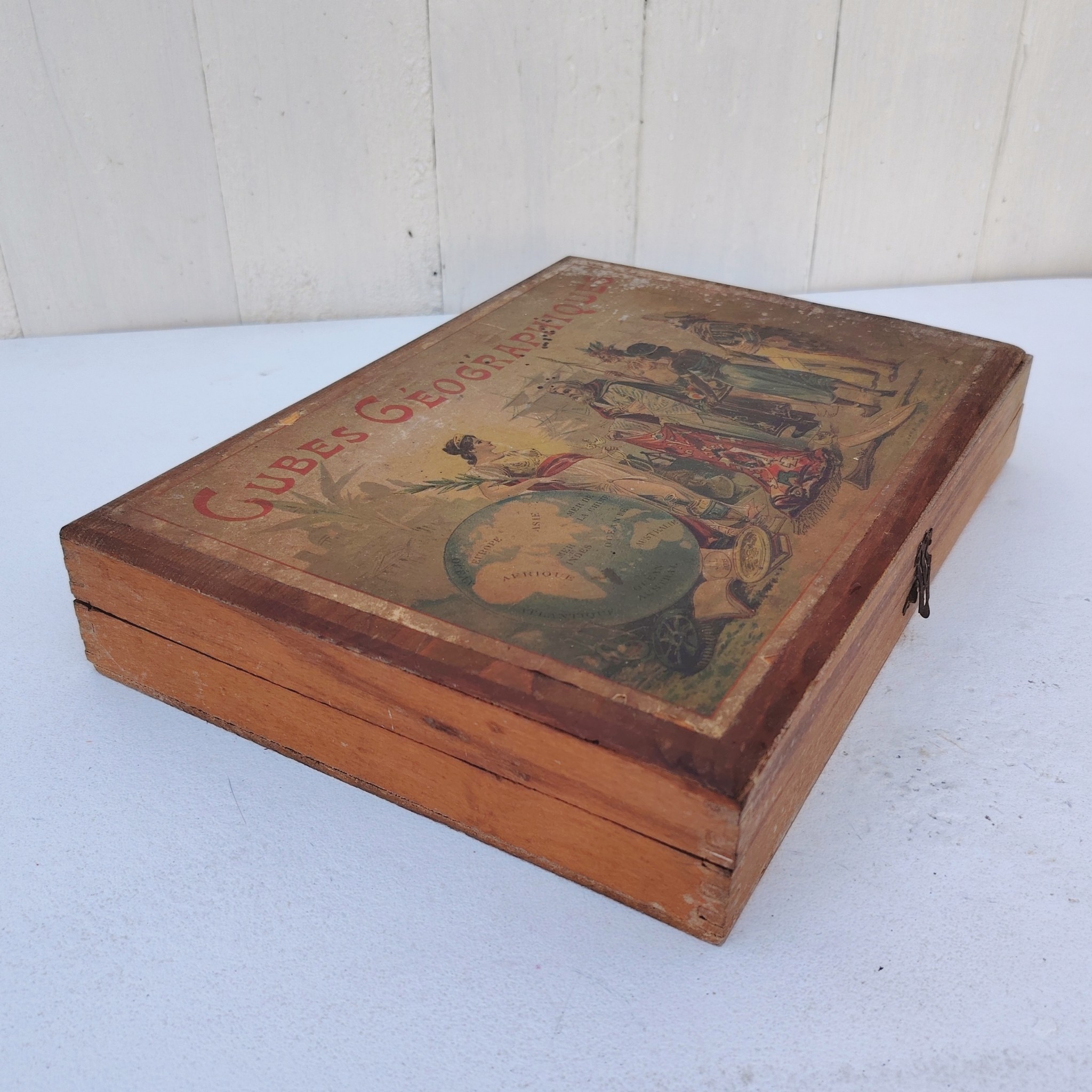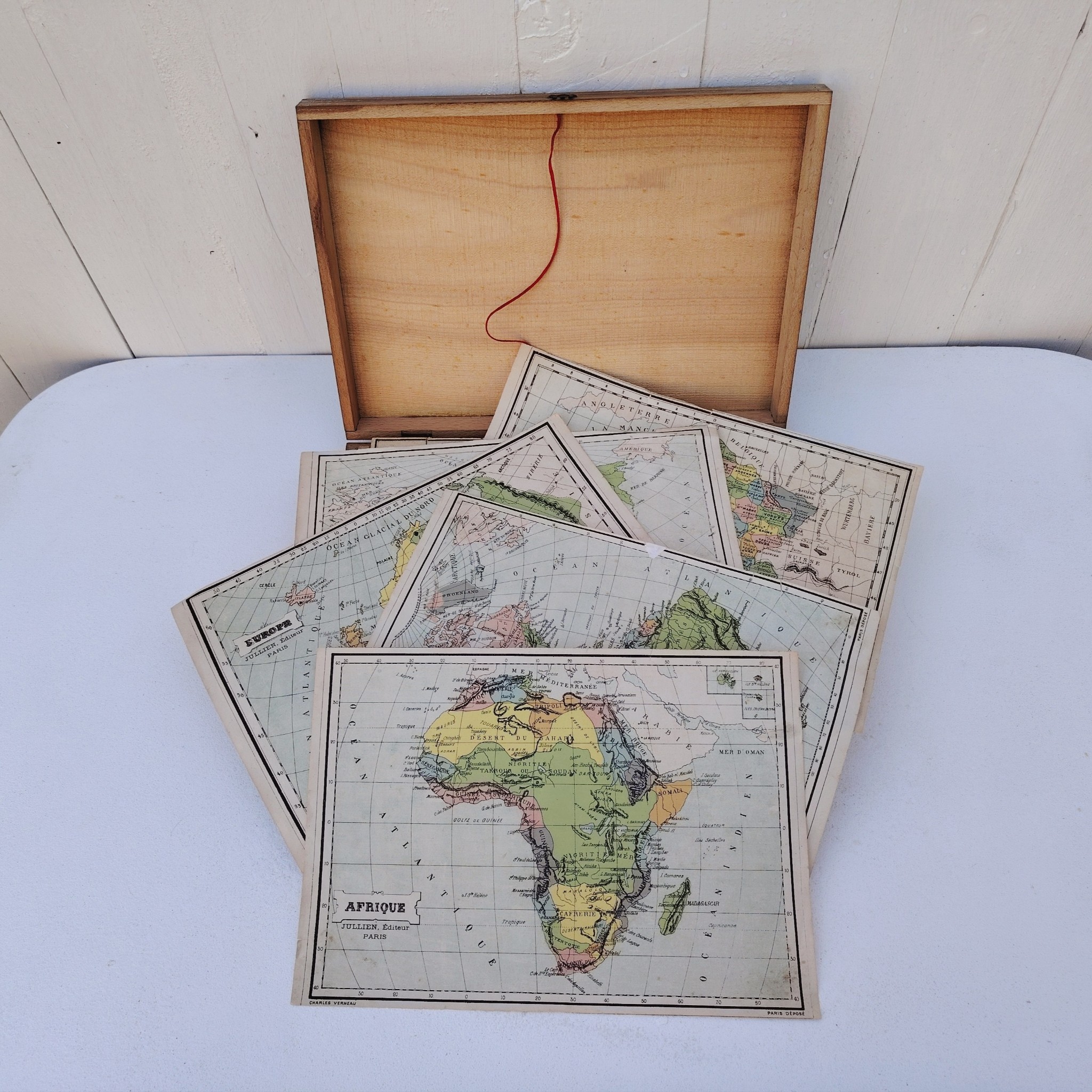 Ancienne boite de cubes géographique datant des années 50-60. 6 cartes à refaire en se basant sur l’exemple des feuillets, manque un feuillet.
