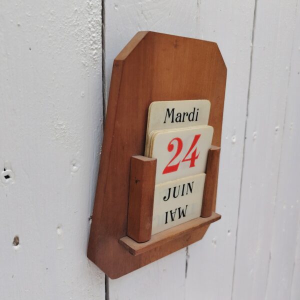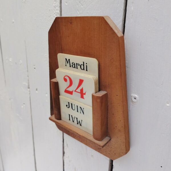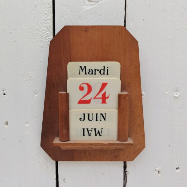 Calendrier perpétuel en bois et plaquettes des jours,mois et nombre en plastique. Datant des années 60.