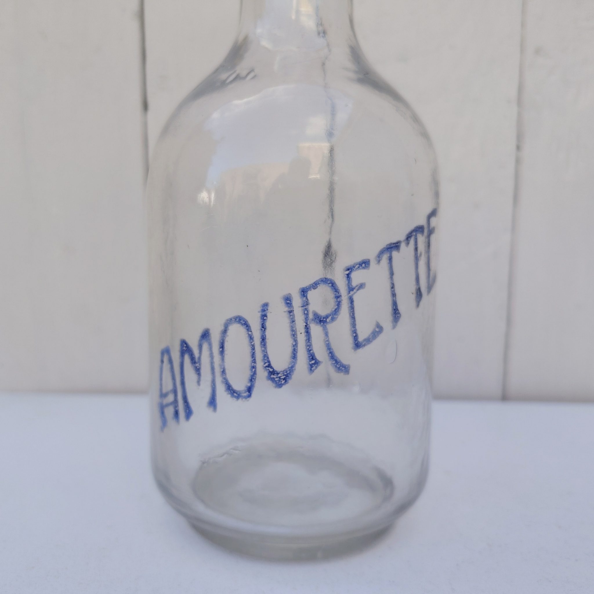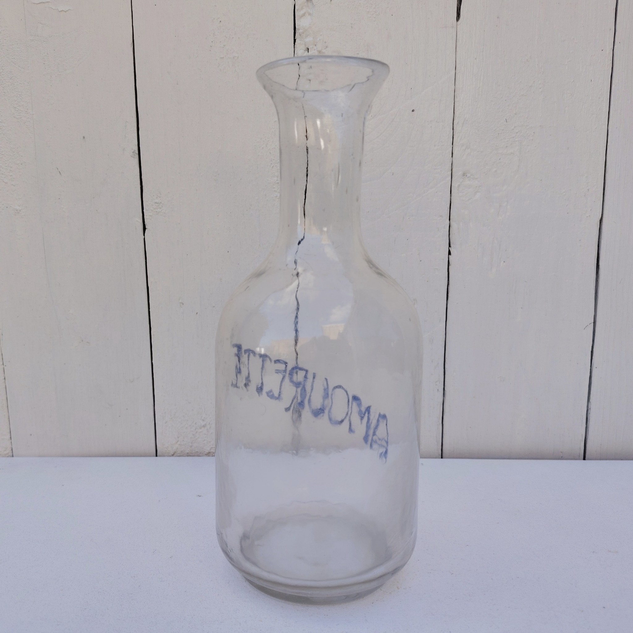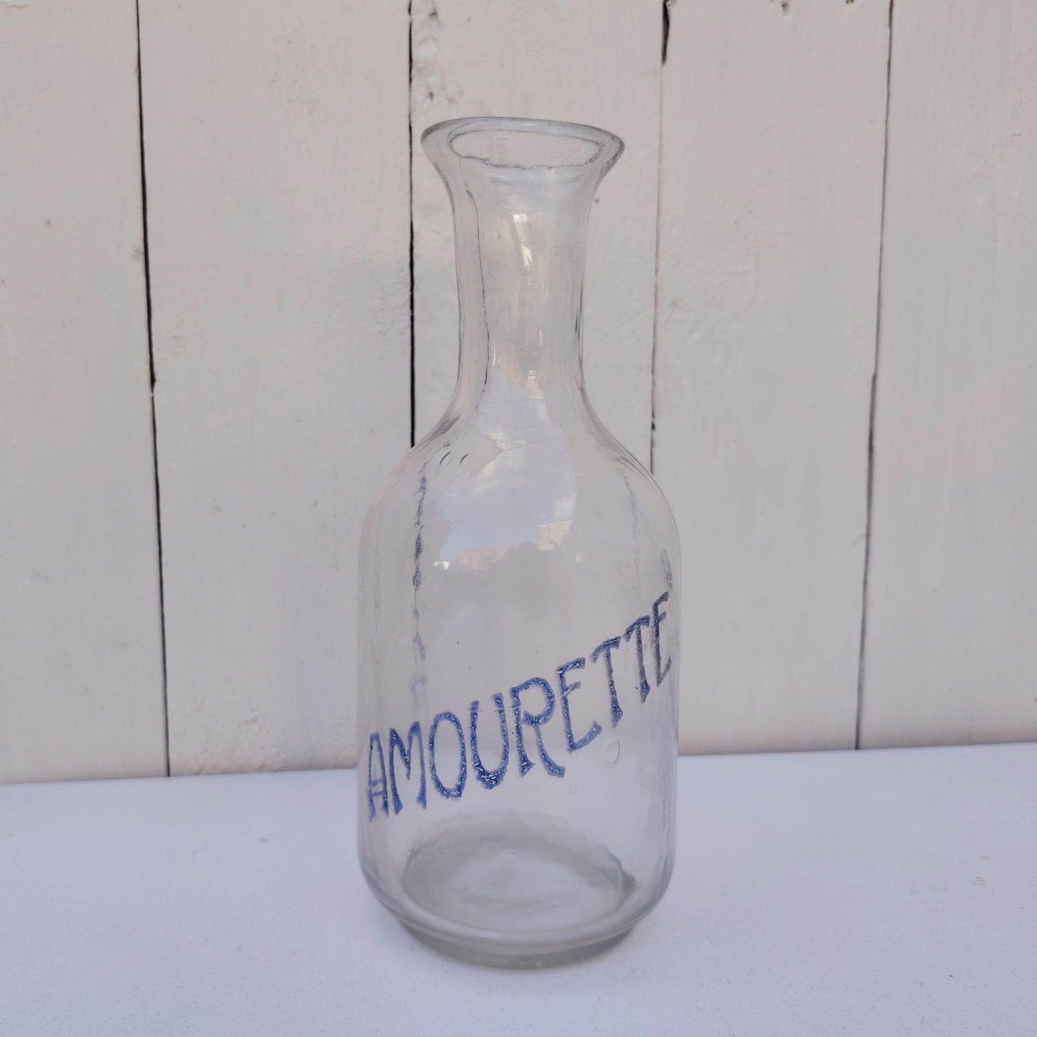 Ancienne carafe en verre soufflé publicitaire pour la marque d’anis Amourette.