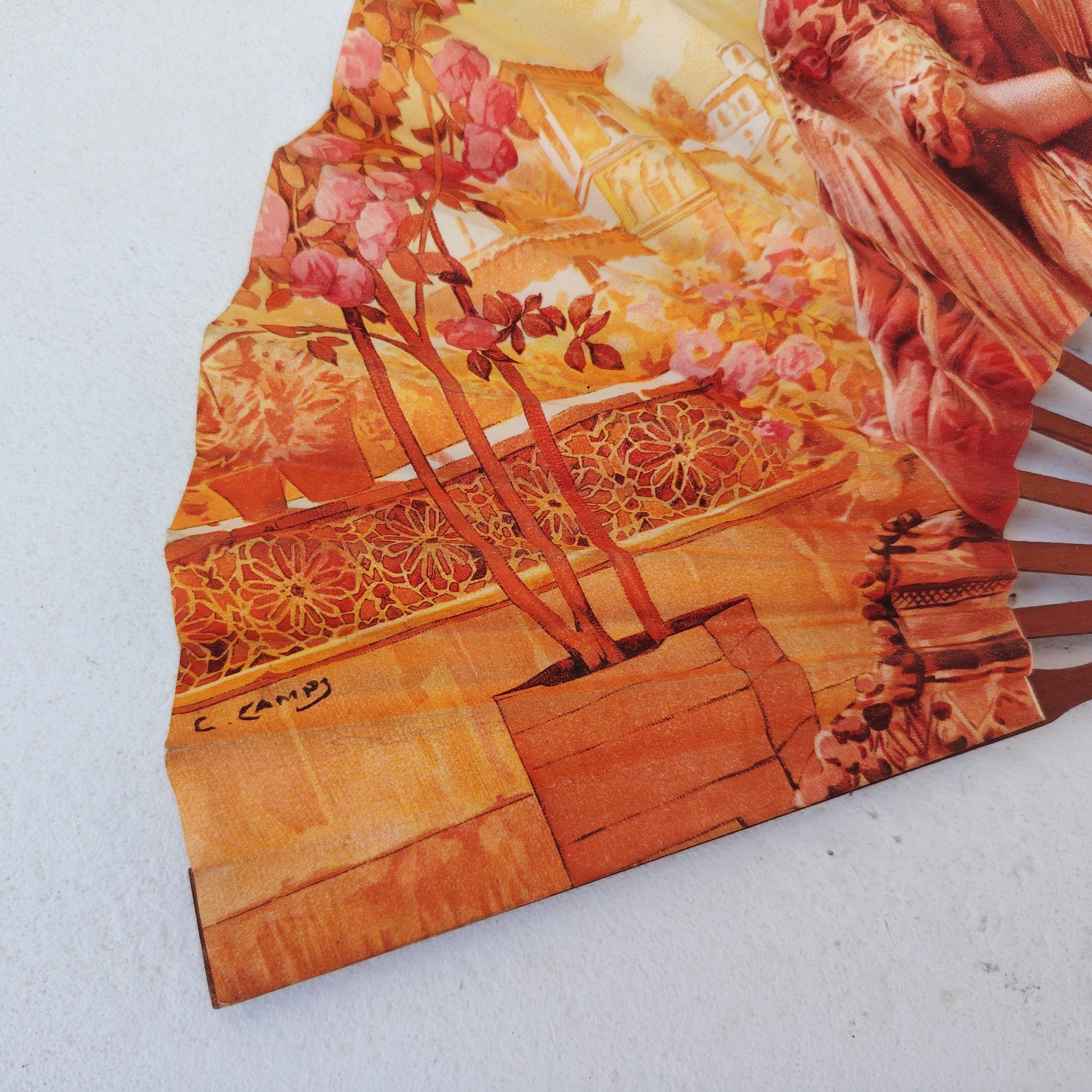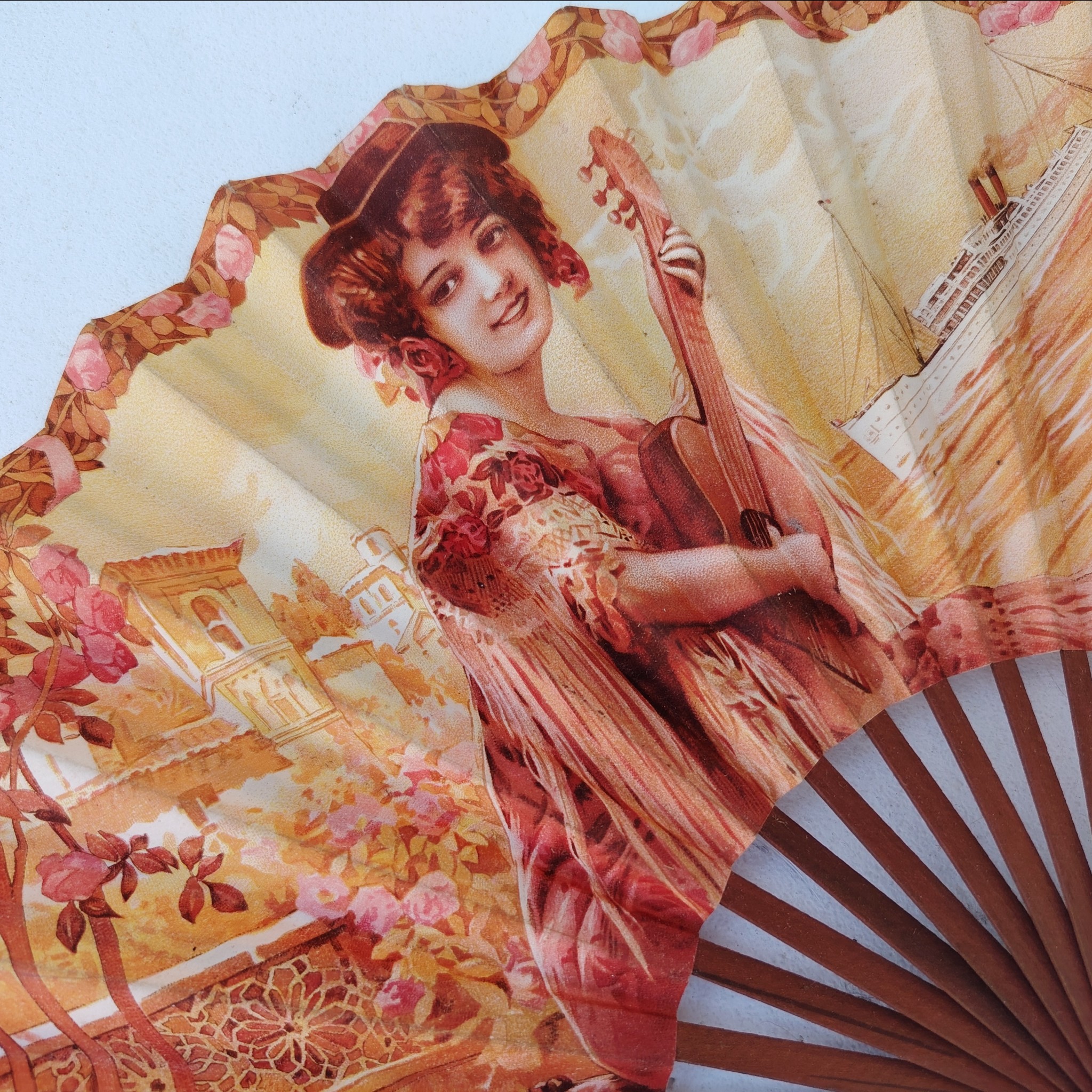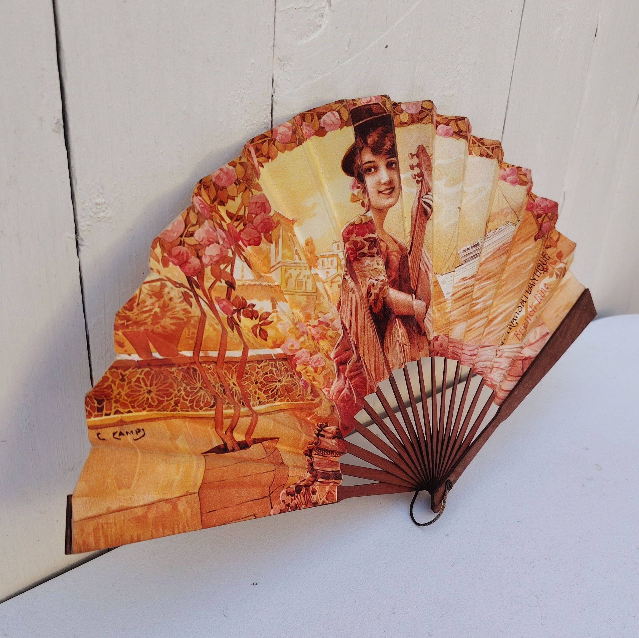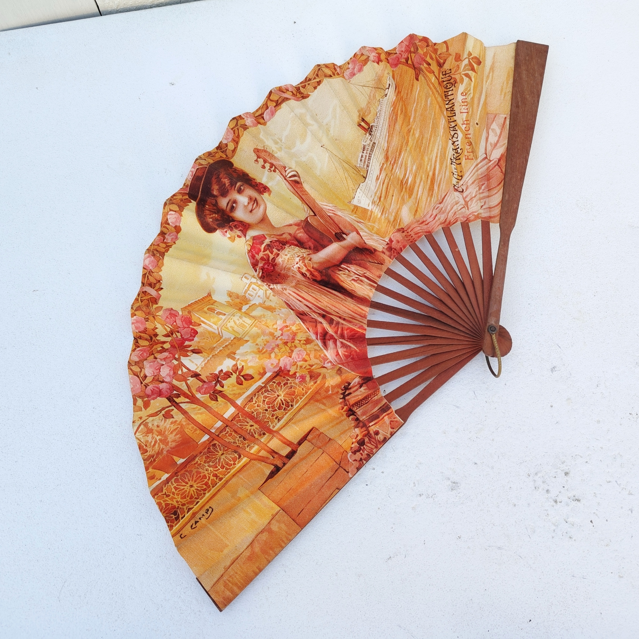 Eventail en bois et papier. Petites rousseurs sur le papier sans gravité.