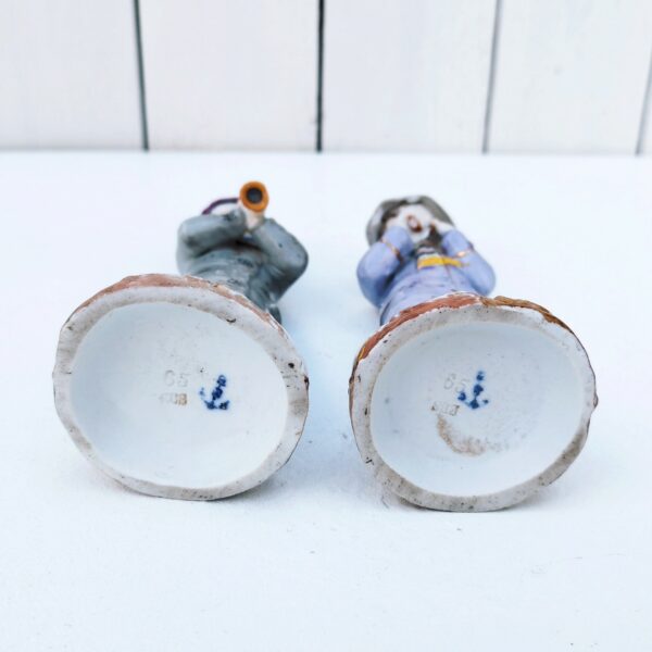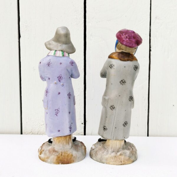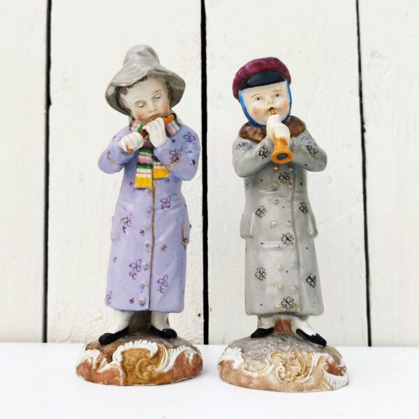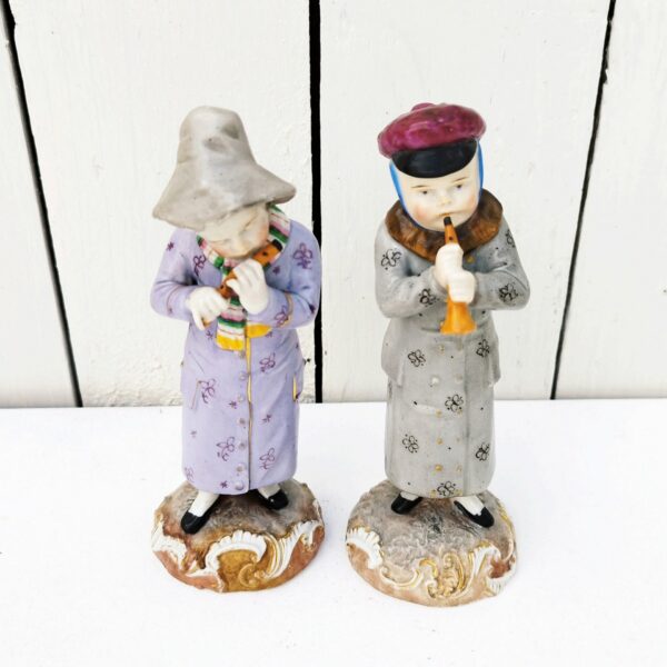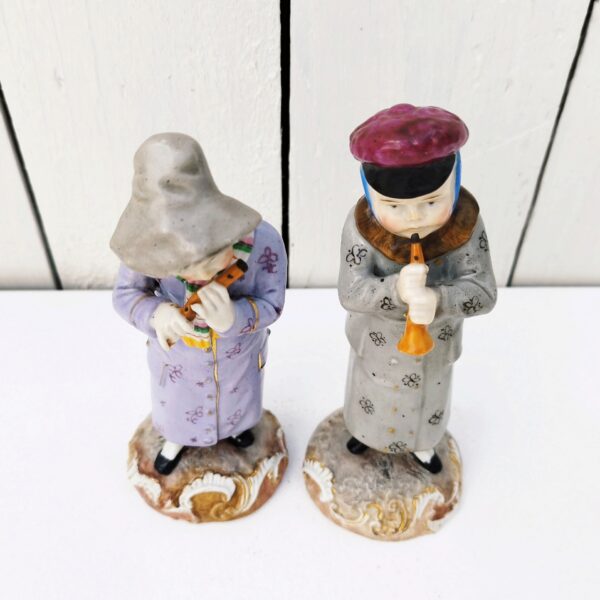 Paire de figurines en porcelaine de Saxe en Allemagne, représentant des musiciens joueurs de flûtes, pipeau.