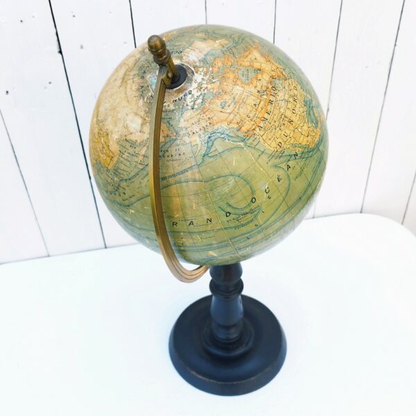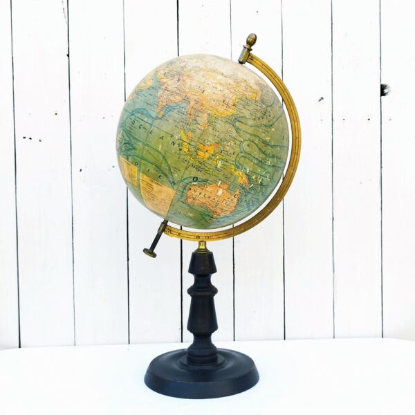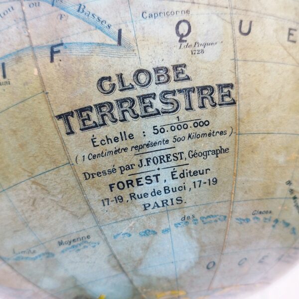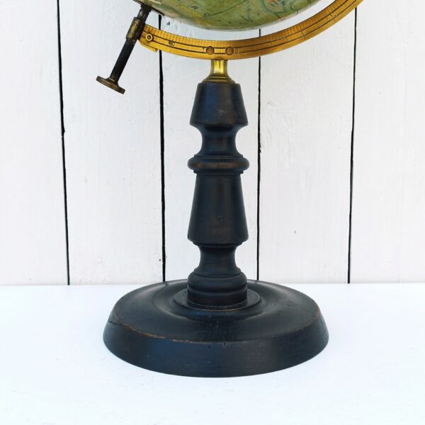 Grand globe Napoléon III en carton recouvert de la carte du monde en papier, pivotant sur un pied en bois noirci , entouré d’une réglette en laiton crée par J.Forest et édité par lui même.