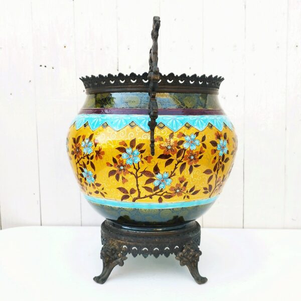 Grand cache-pot ou jardinière en céramique de Sarreguemines numéro 2048. Cerclé d’une couronne en bronze aux prises formant des lions. Pied quadripode en bronze. Couleurs bien vives.