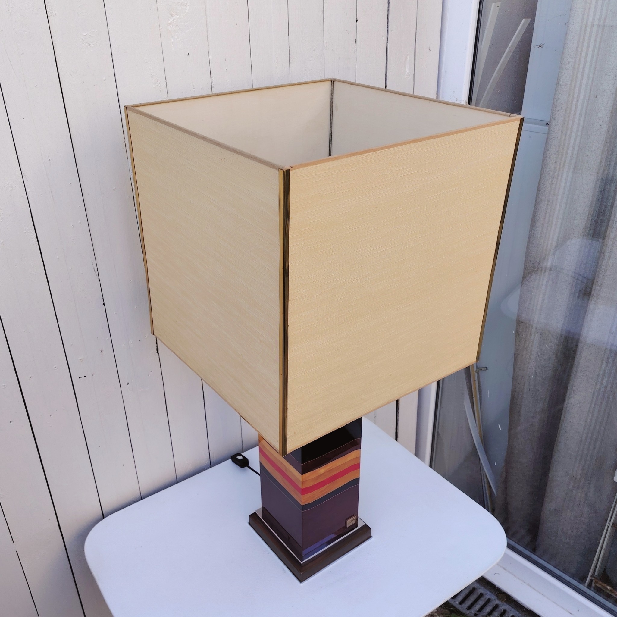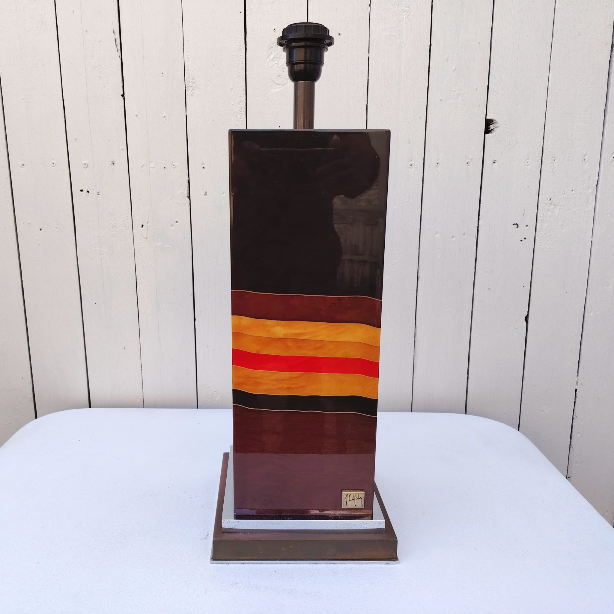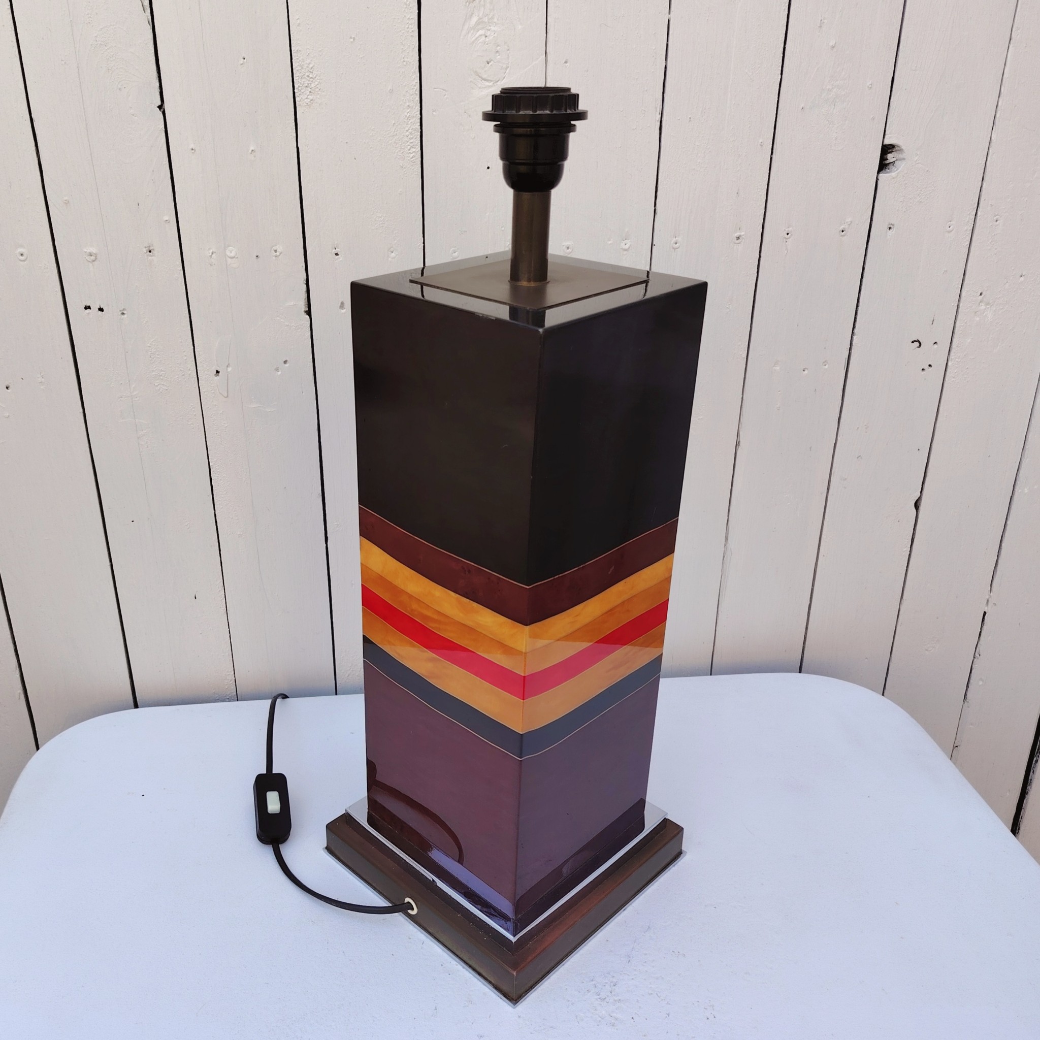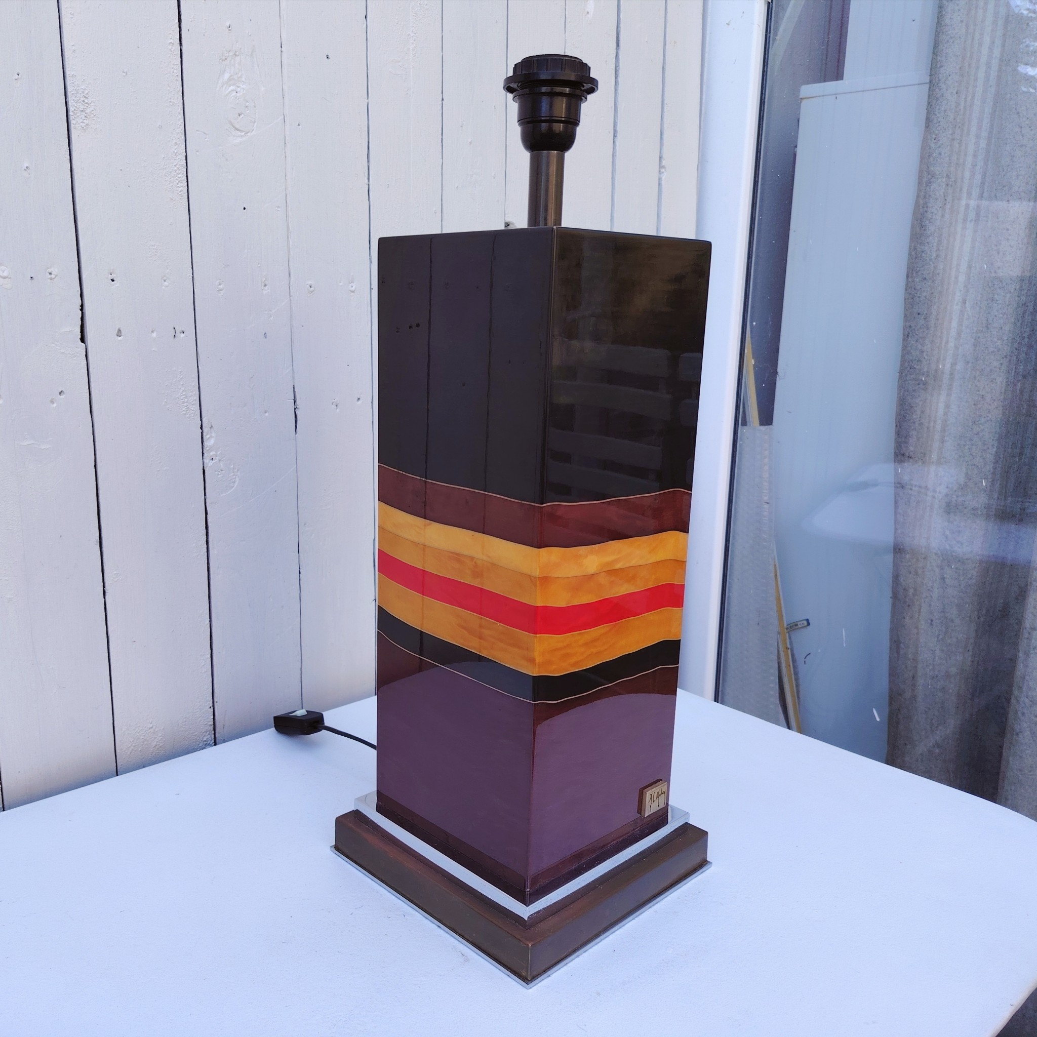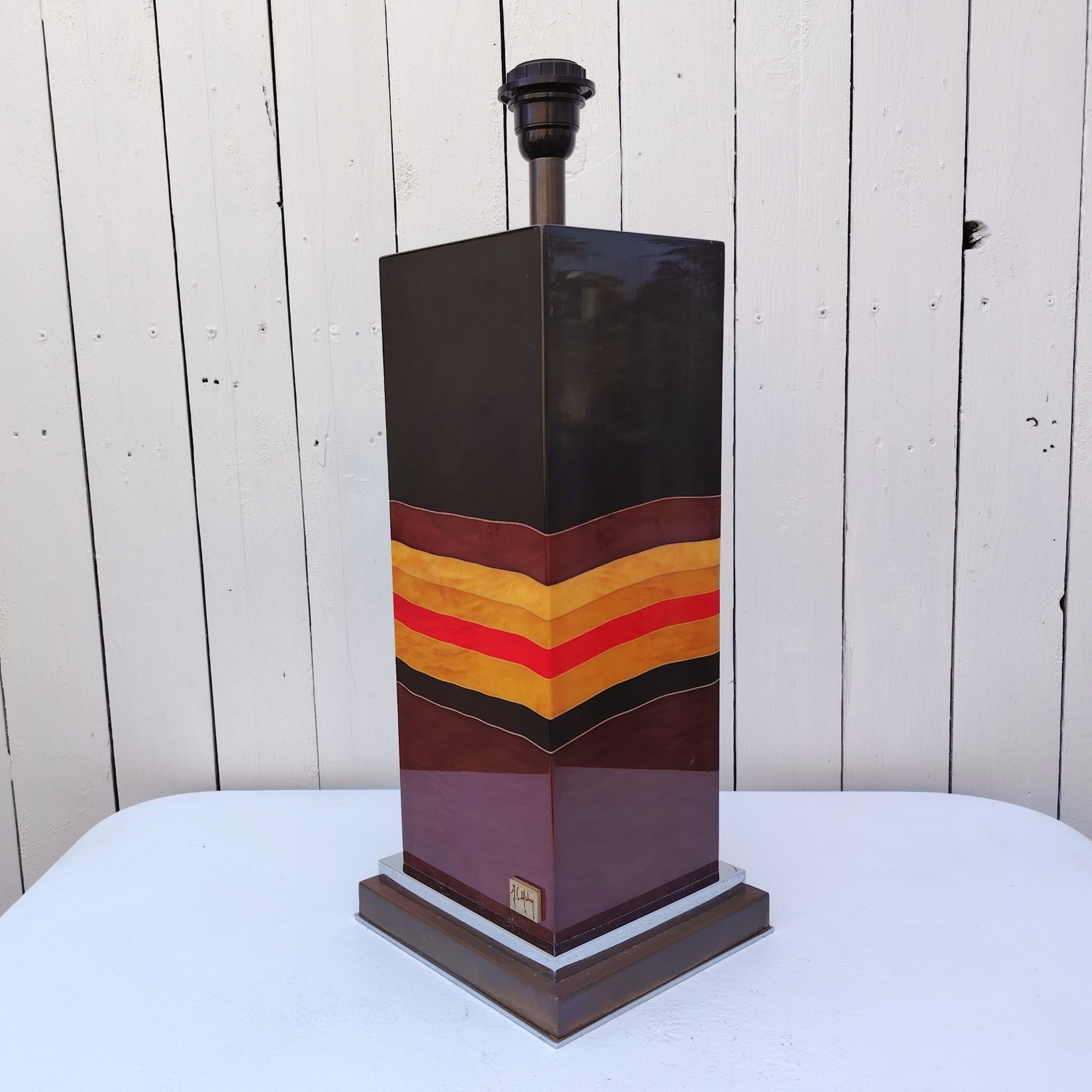 Grande lampe rectangulaire en marqueterie de bois exotique teinté verni par Jean-claude Mahey, reposant un socle gradin en métal argenté et laiton.
