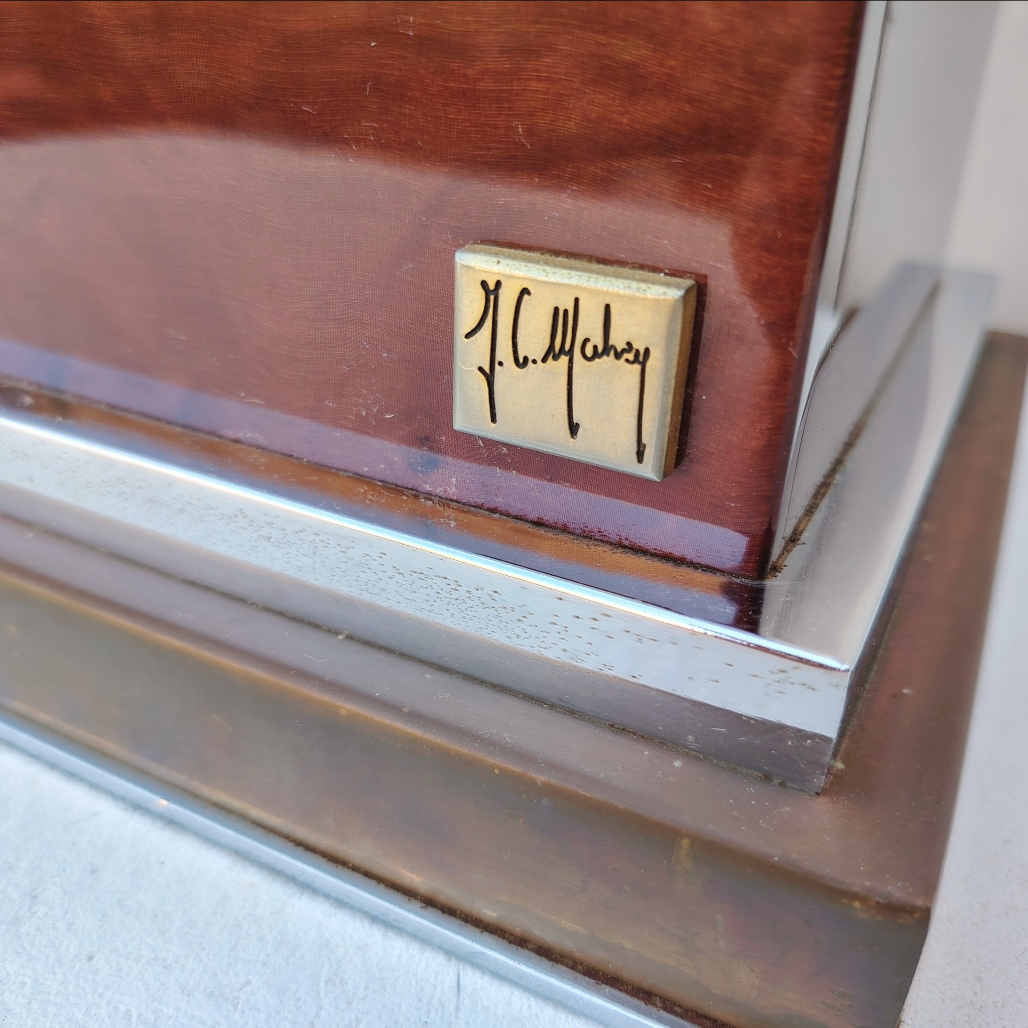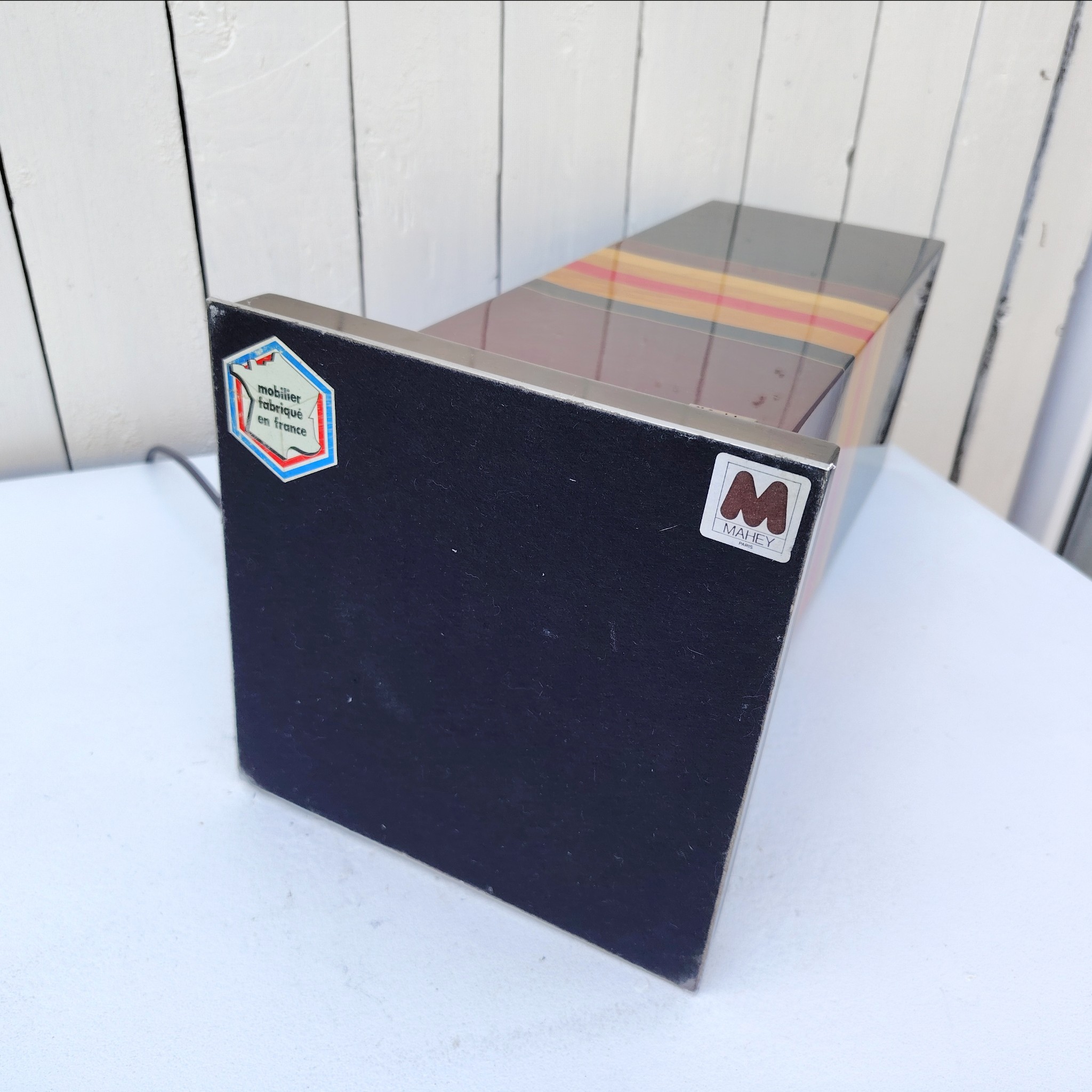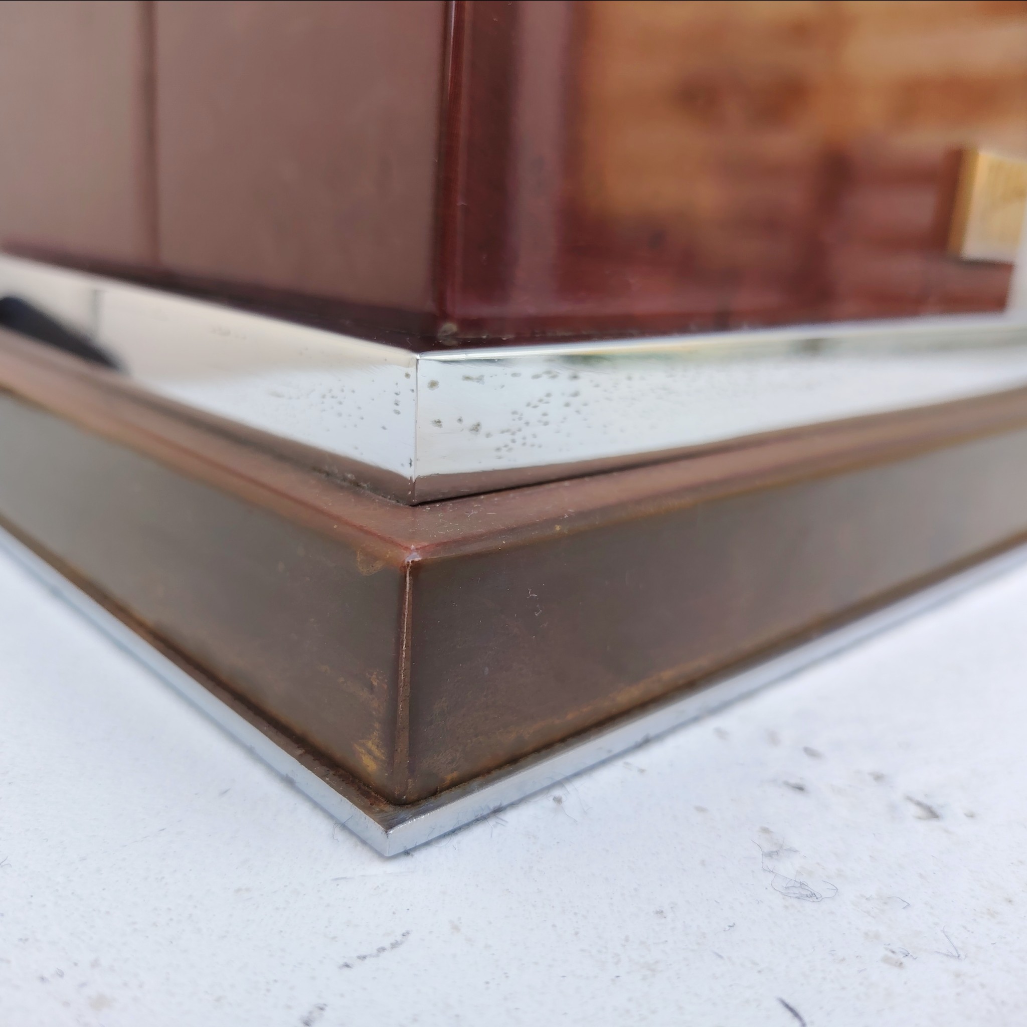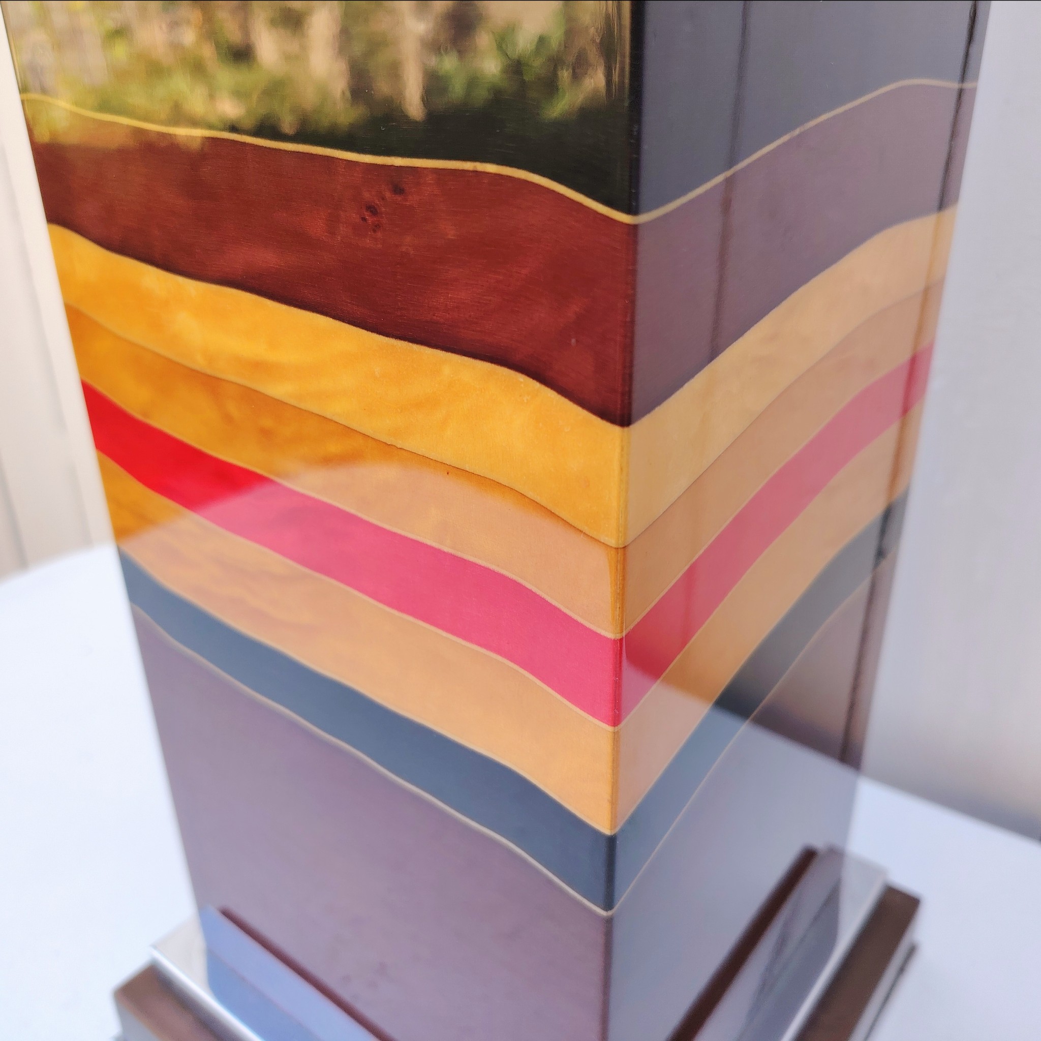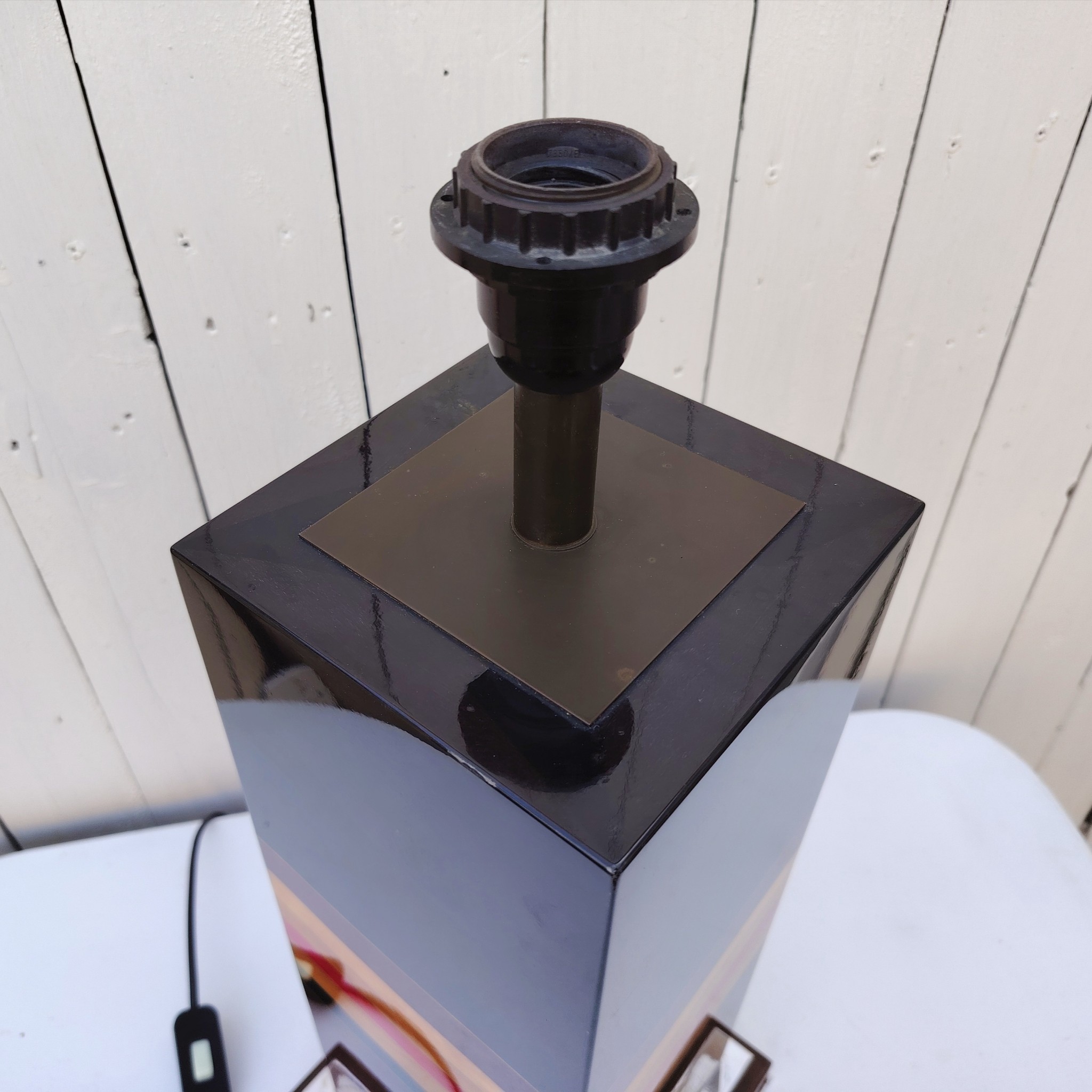 Grande lampe rectangulaire en marqueterie de bois exotique teinté verni par Jean-claude Mahey, reposant un socle gradin en métal argenté et laiton.