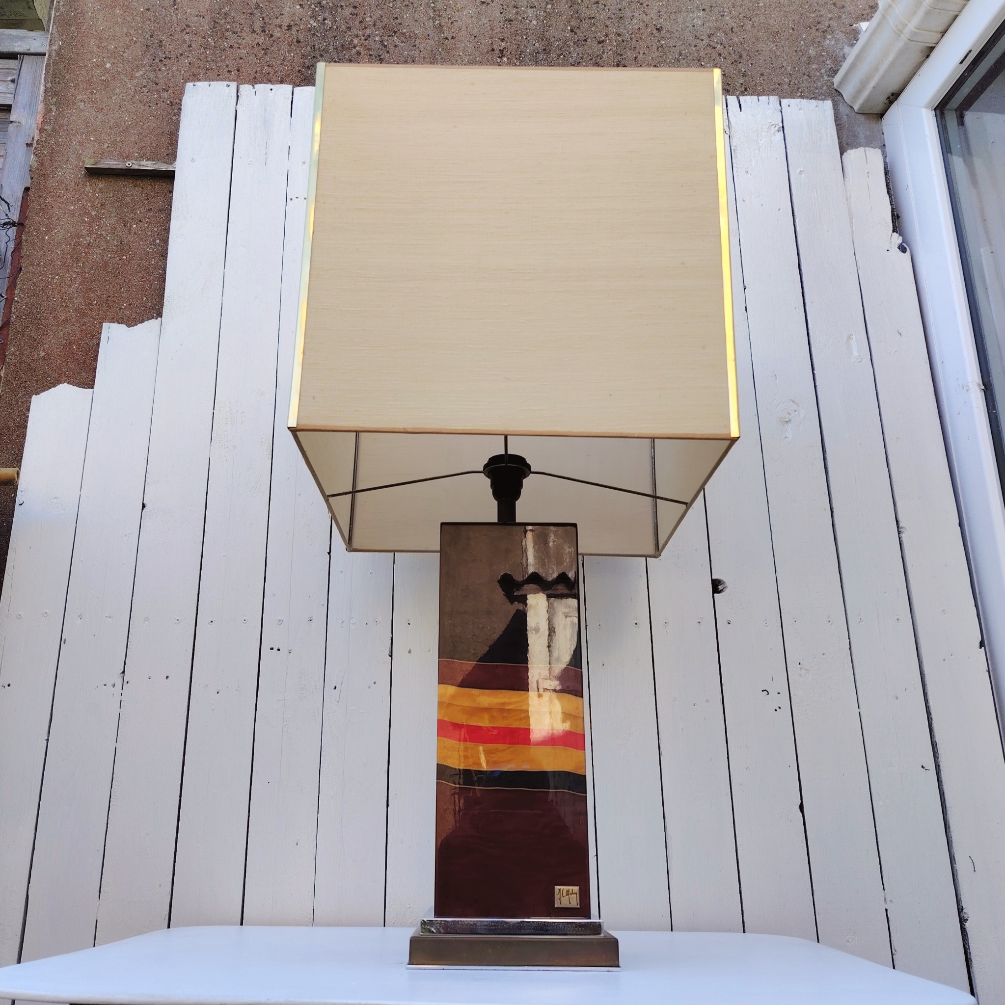 signée sur une plaque sur le bas de du pied . Abat-jour d’origine. Petites rayures sans gravité. Petites taches sur l’abat-jour