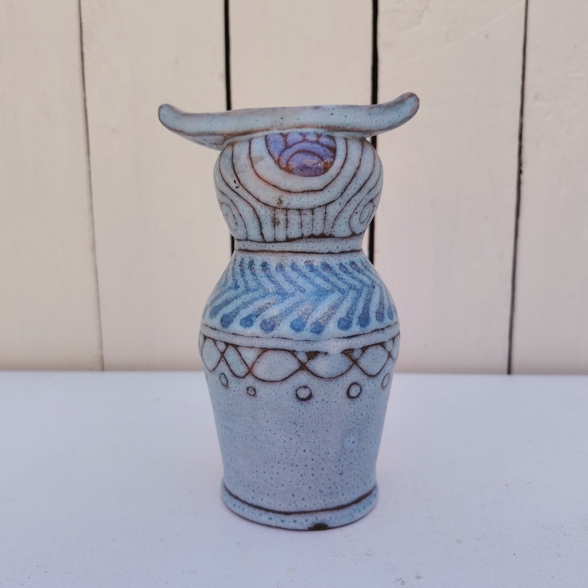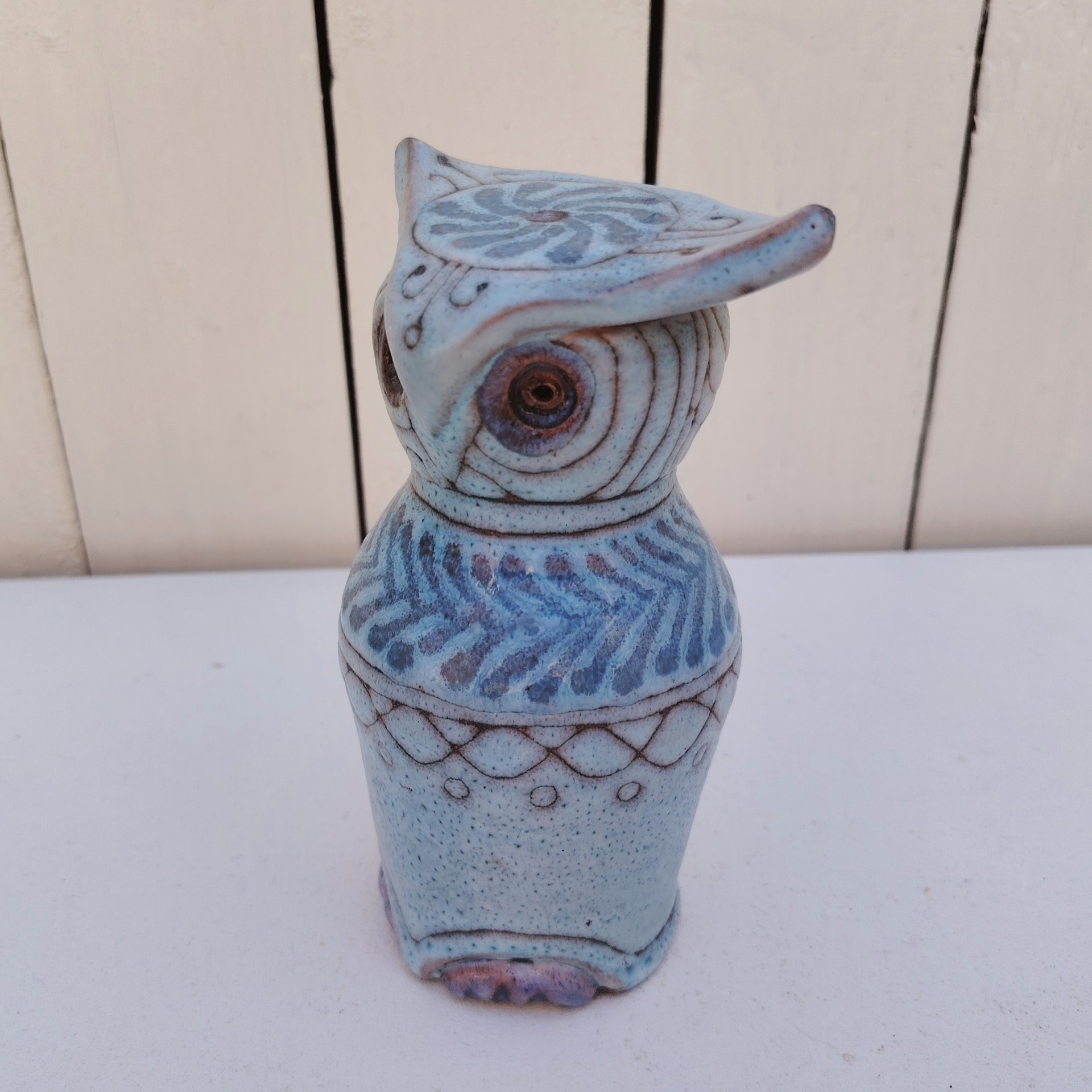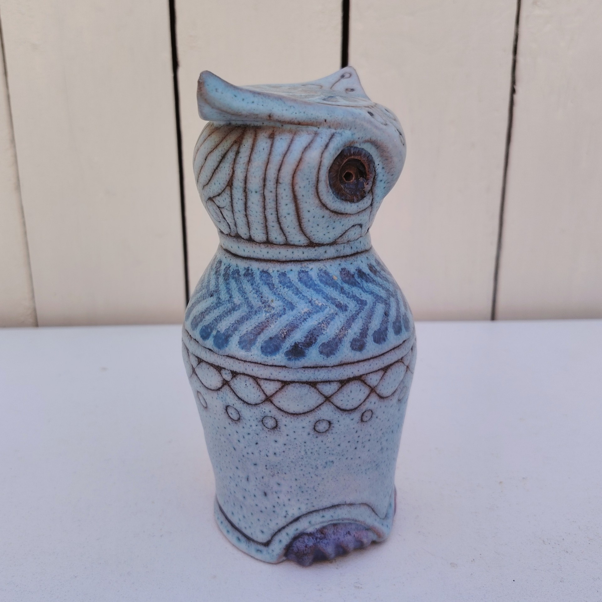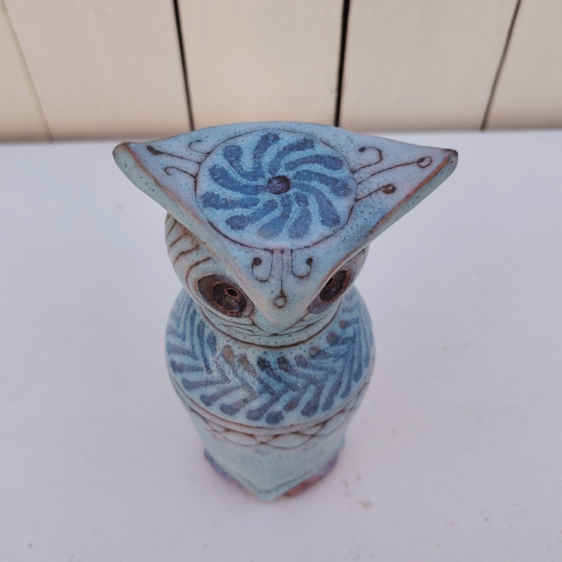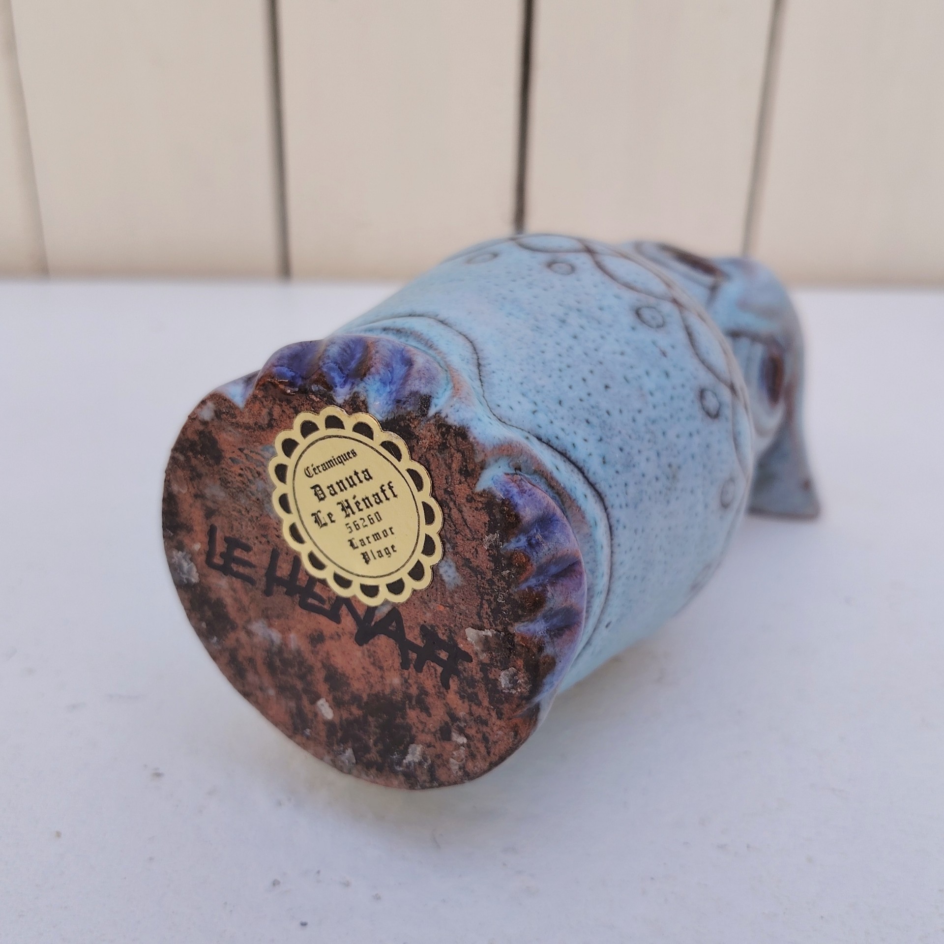 Hibou en céramique créé par Danuta le Hénaff, dans les tons de bleus turquoise.Etiquette sur le dessous. Signé Le Henaff.