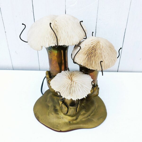 exceptionnelle lampe en bronze massif par Duval Brasseur. Chapeaux des champignons sont en coraux véritables. Lampe d’ambiance d’un plus bel effet.
