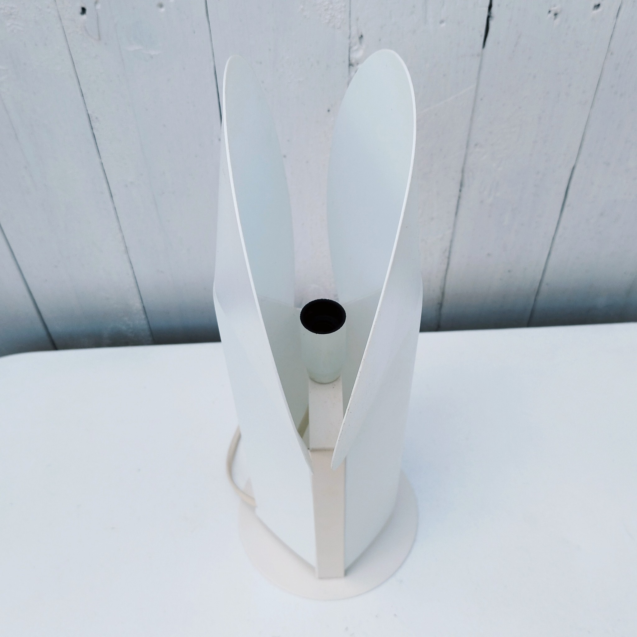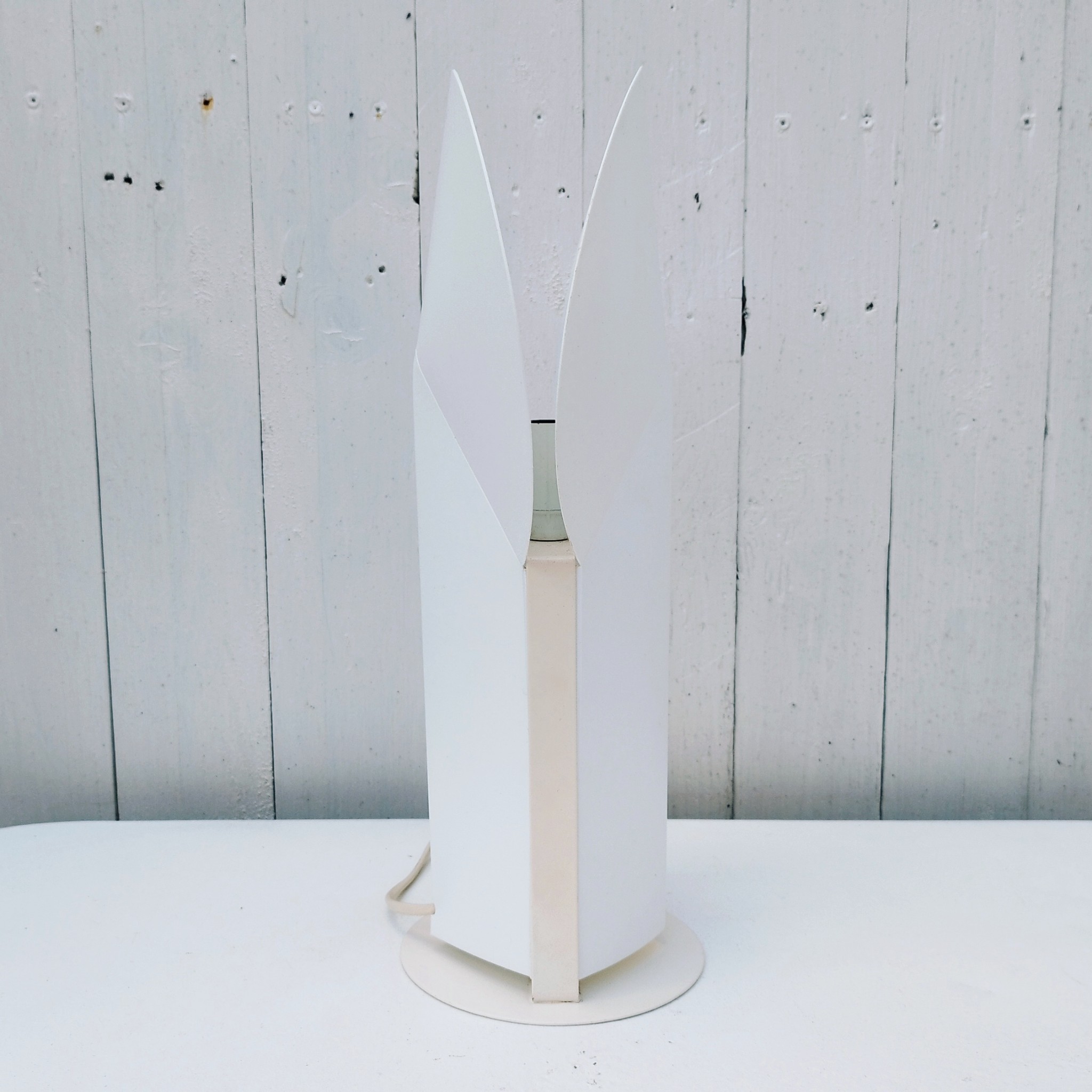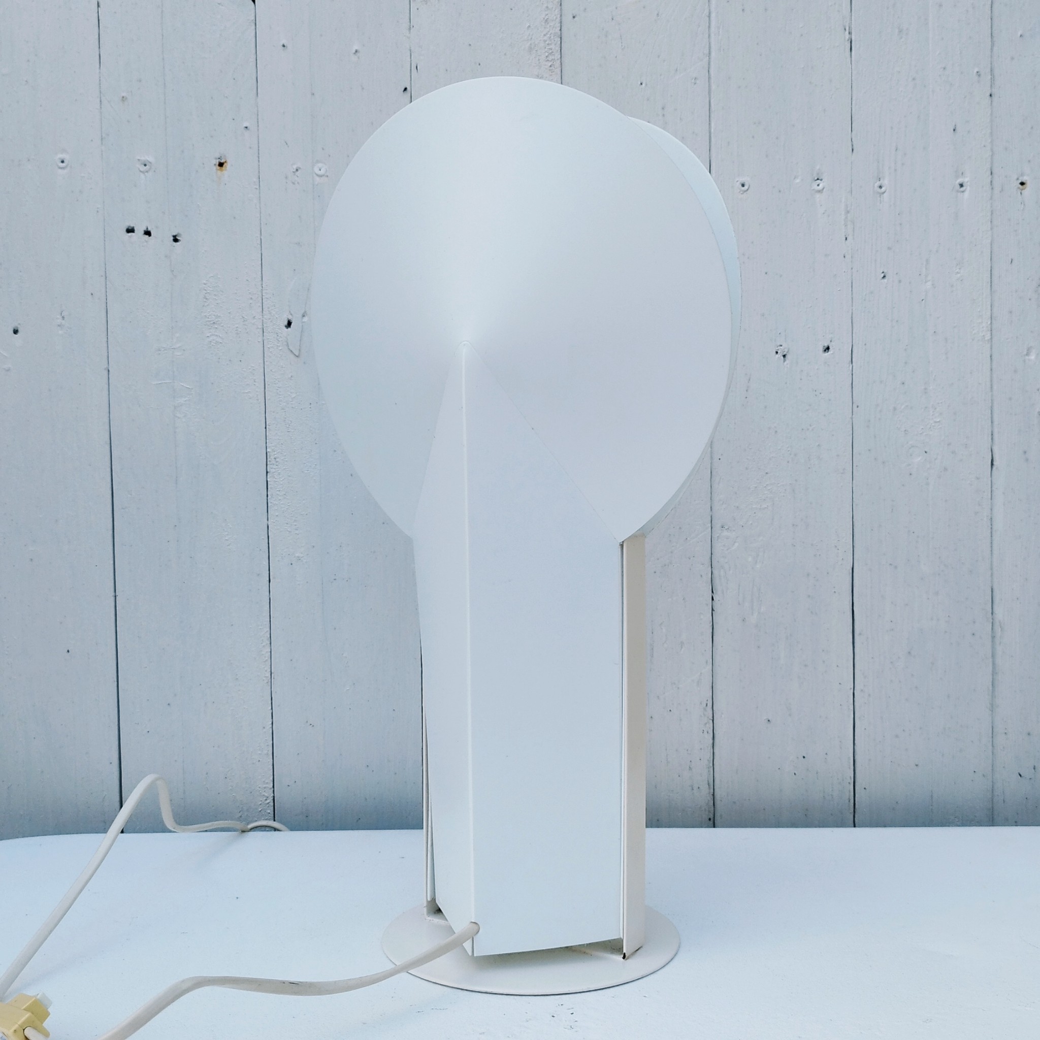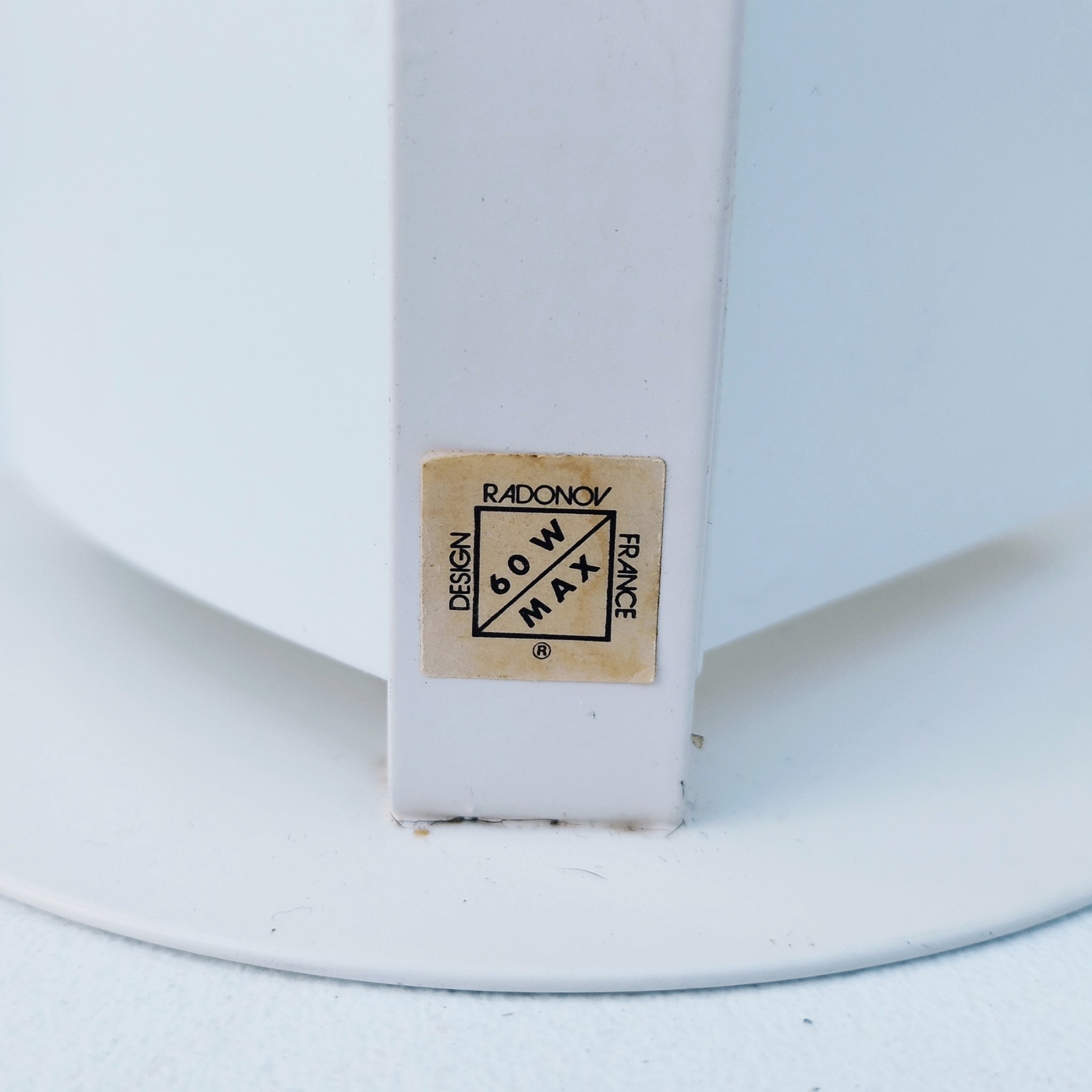Lampe à poser datant des années 80, créée par Samuel Parker pour les éditions Radonov France. En plastique souple et métal peint blanc.