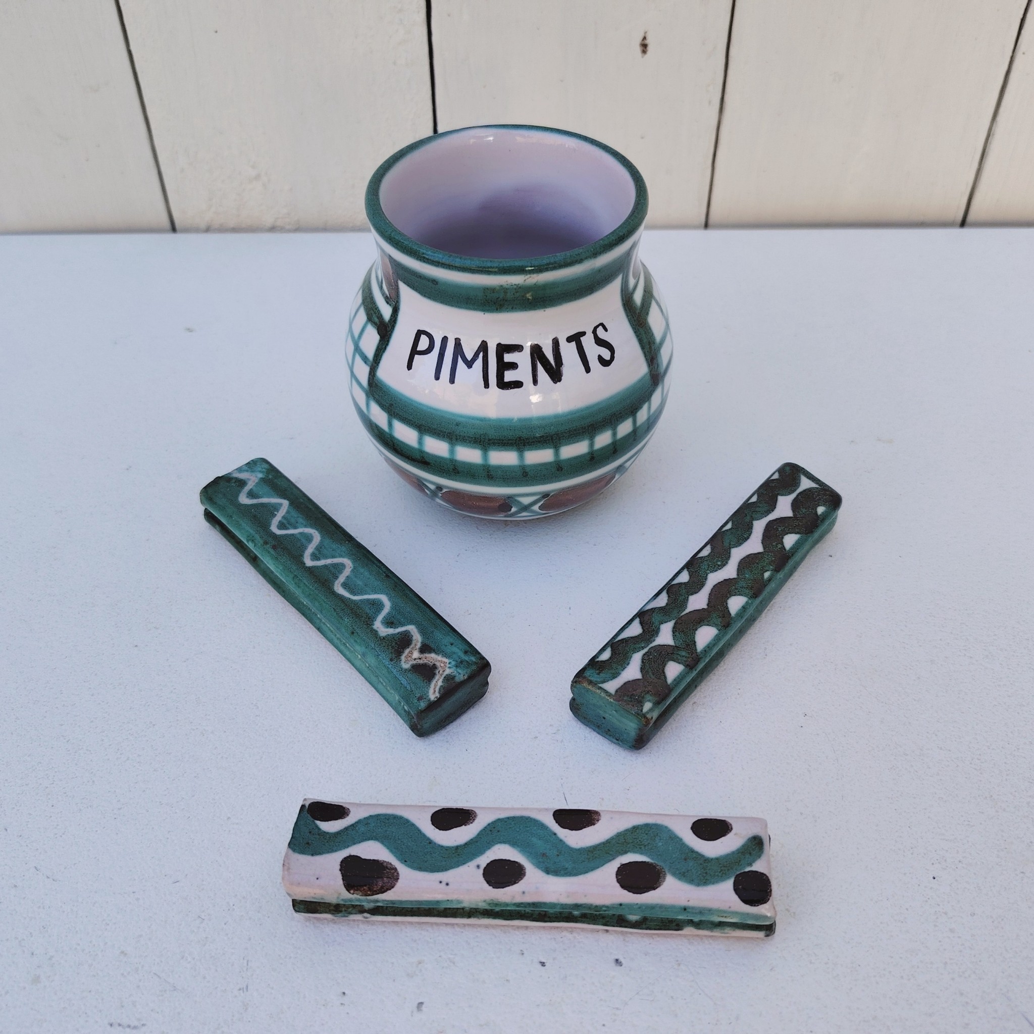 Lot en céramique de Vallauris par Robert Picault comprenant un pot à piments et trois porte-couteaux. Datant des années 60.