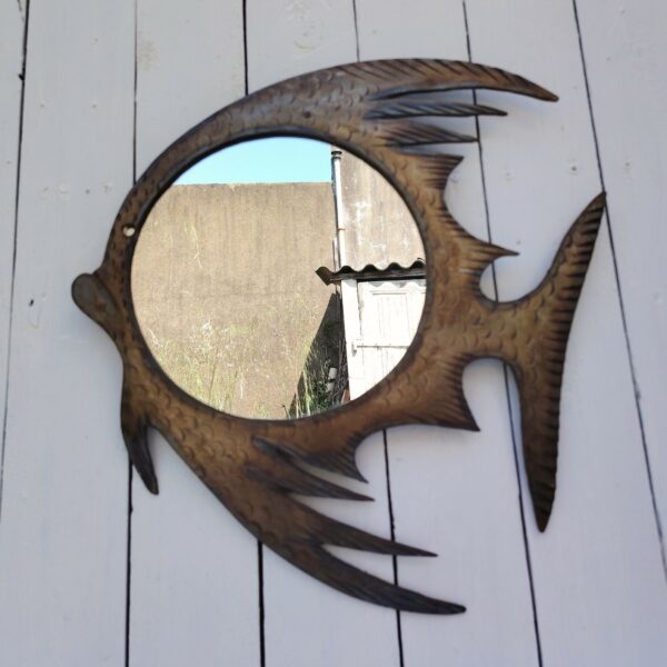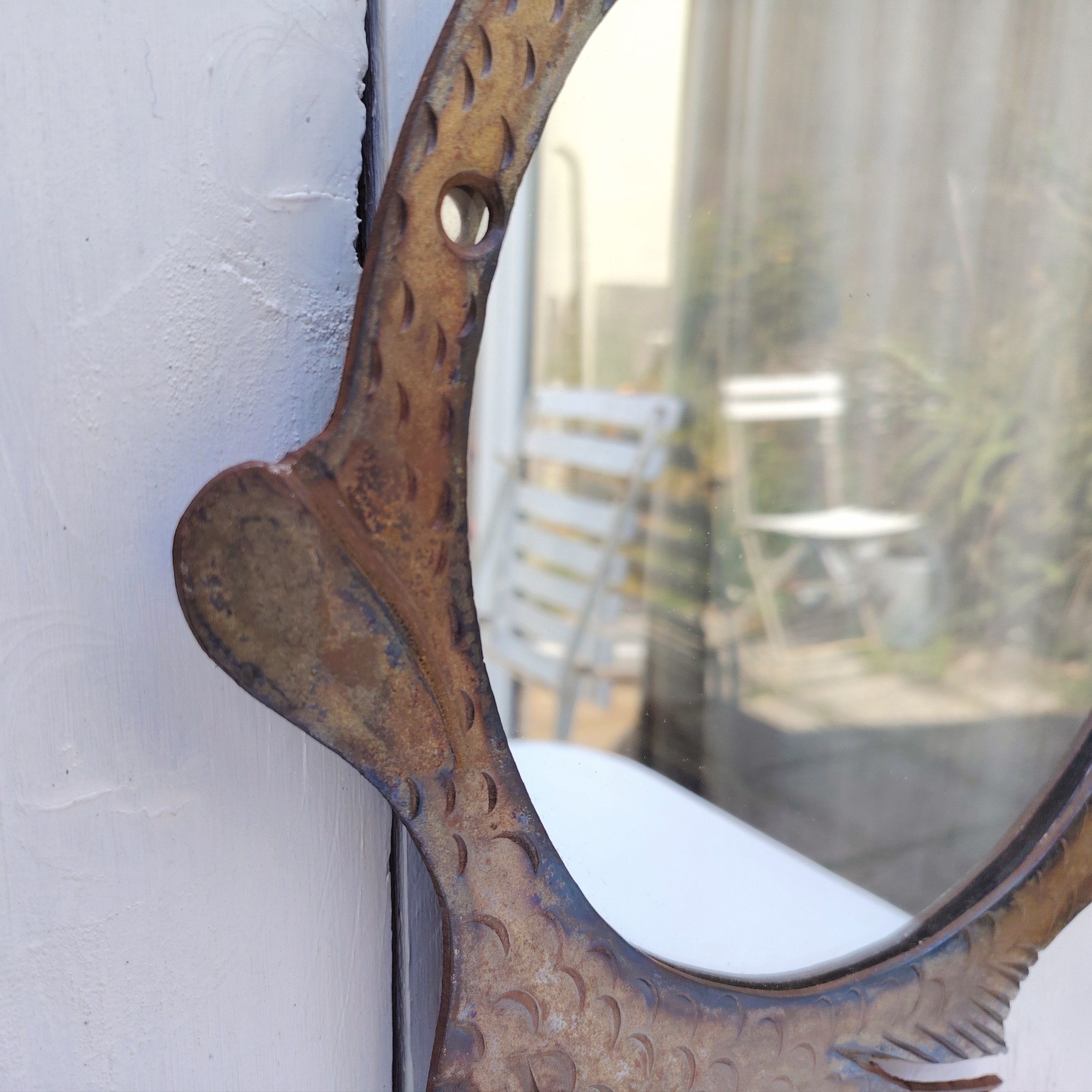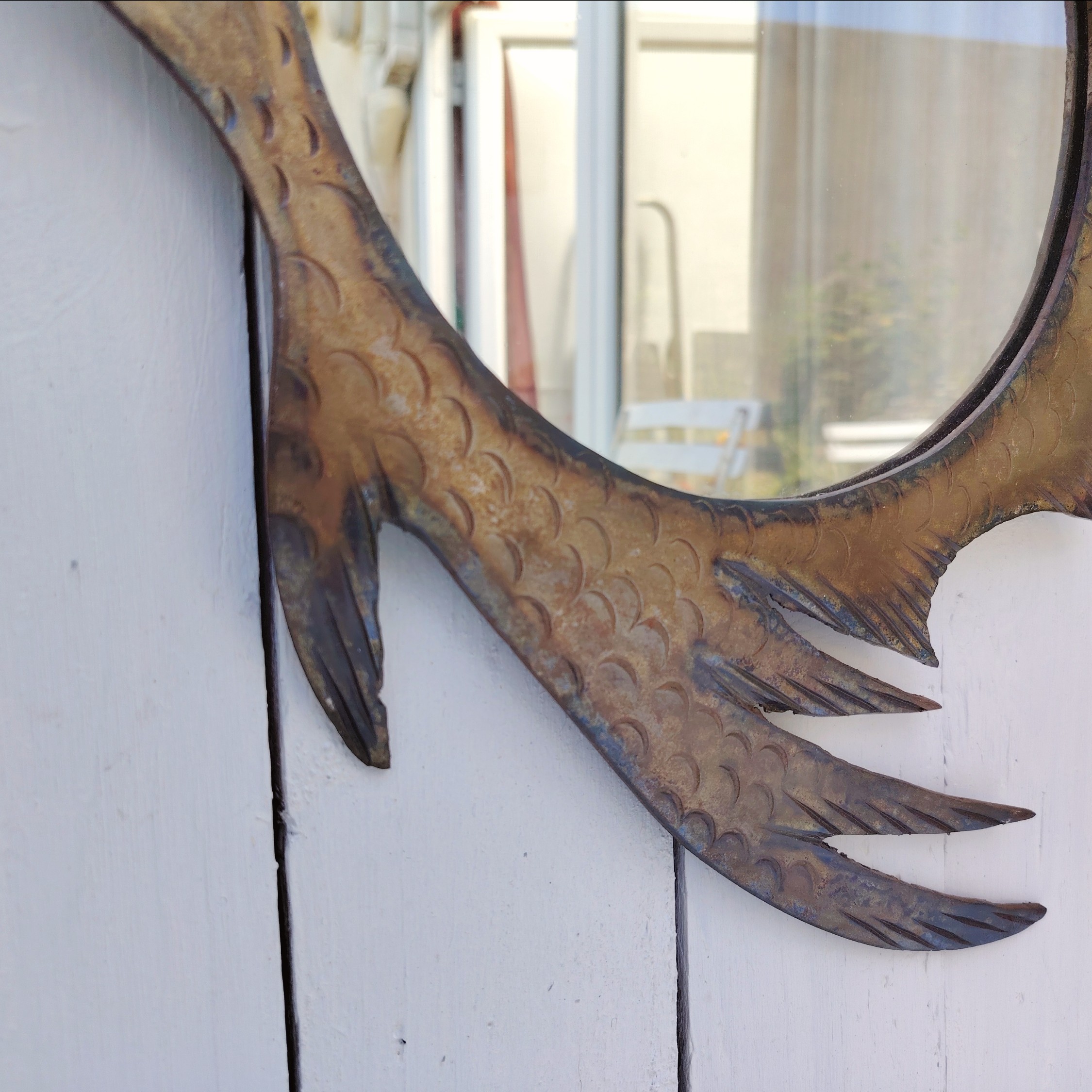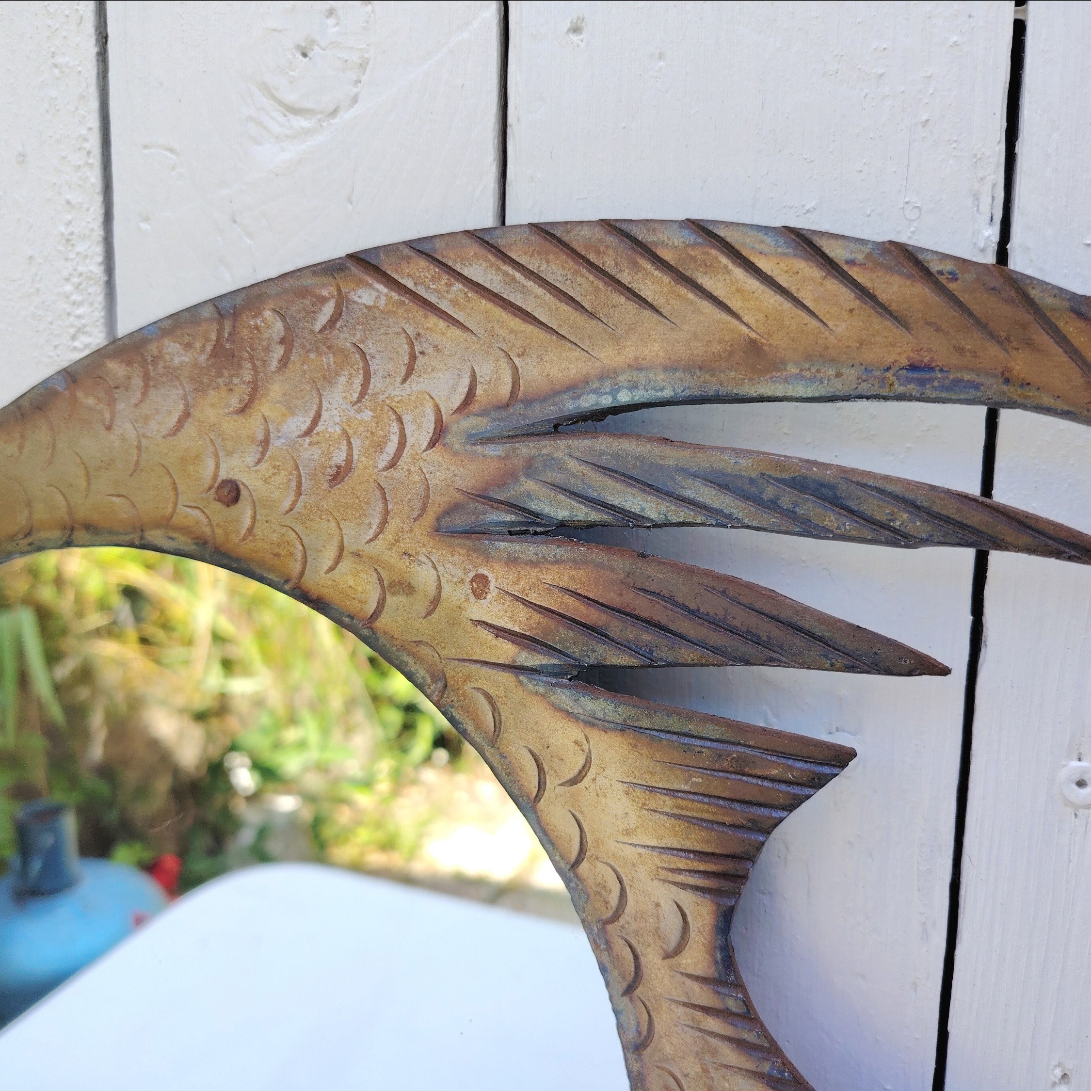Miroir à la forme de poisson en feuille d’acier découpée et martelée pour former les écailles. Décoration vintage.