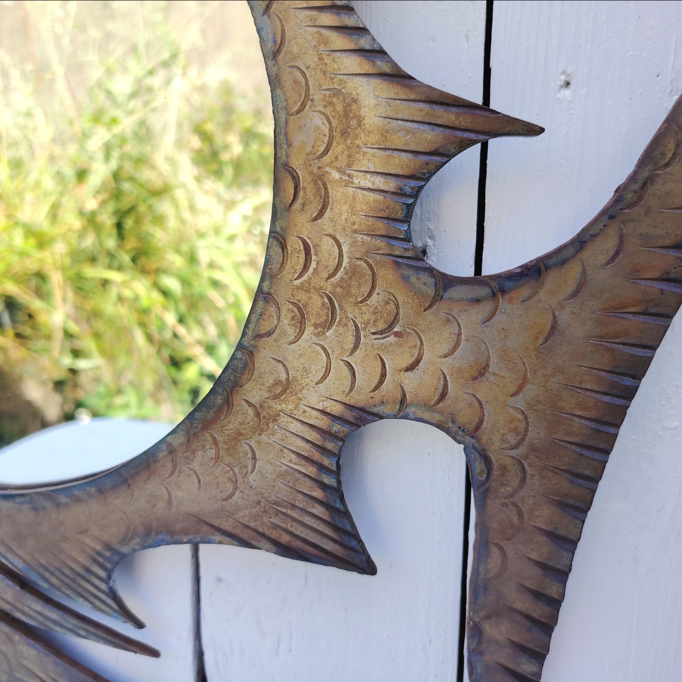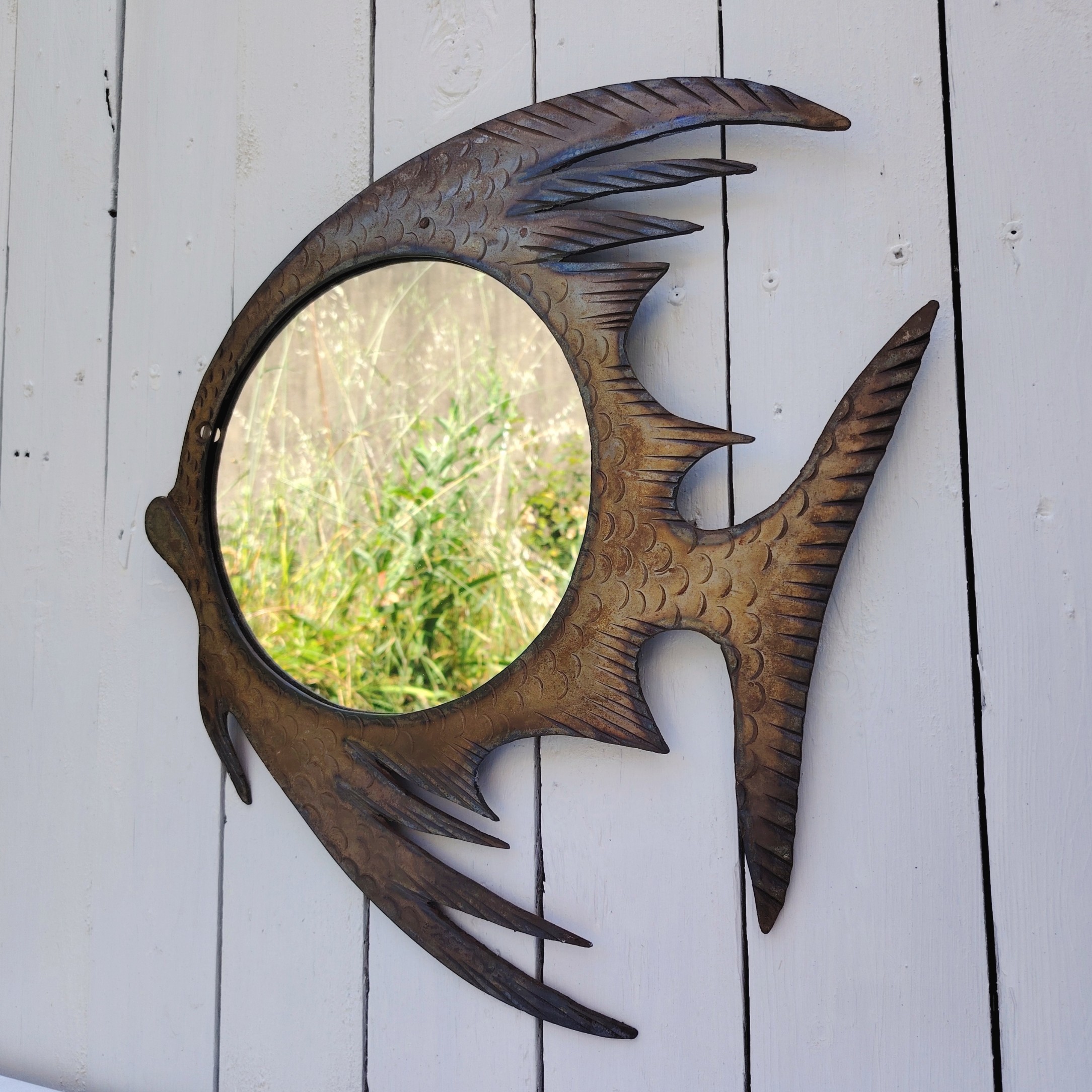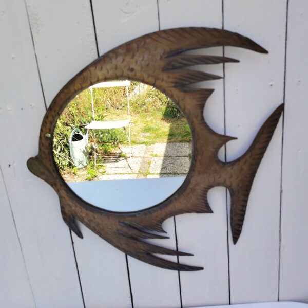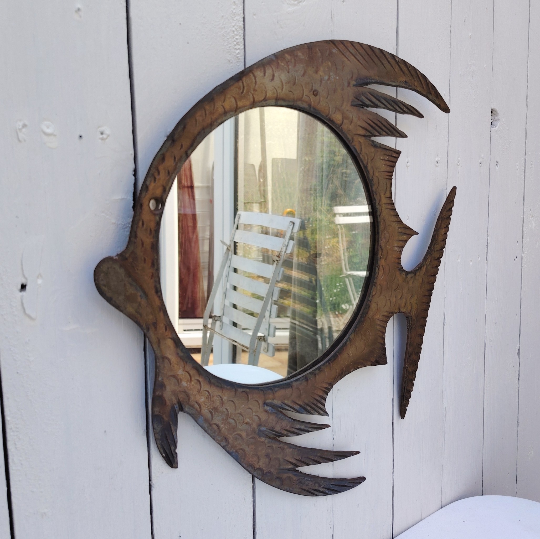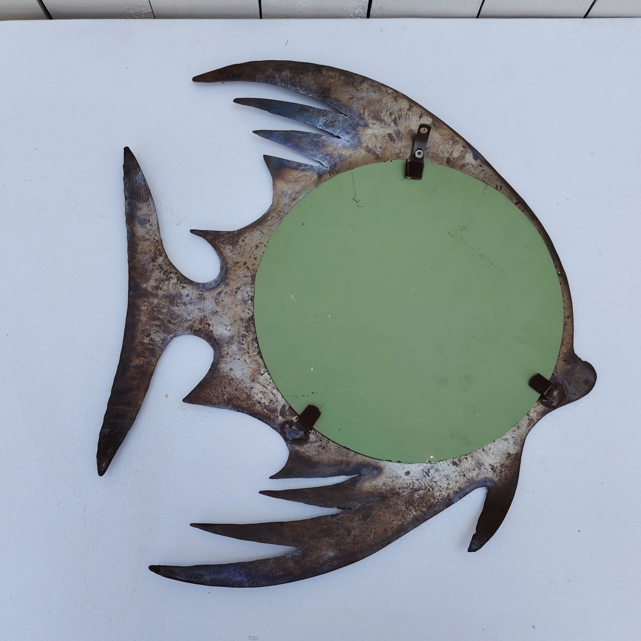 Miroir à la forme de poisson en feuille d’acier découpée et martelée pour former les écailles. Décoration vintage.