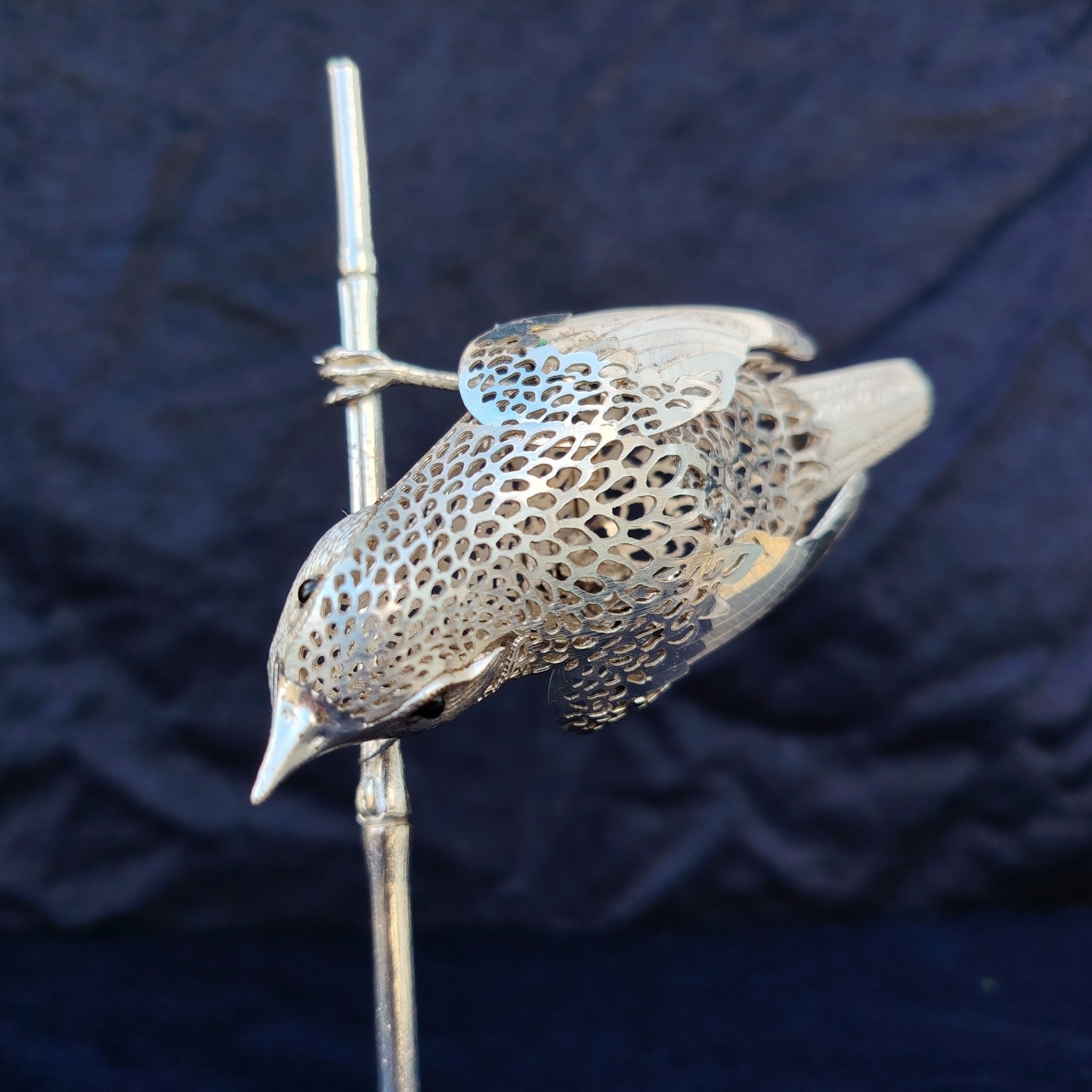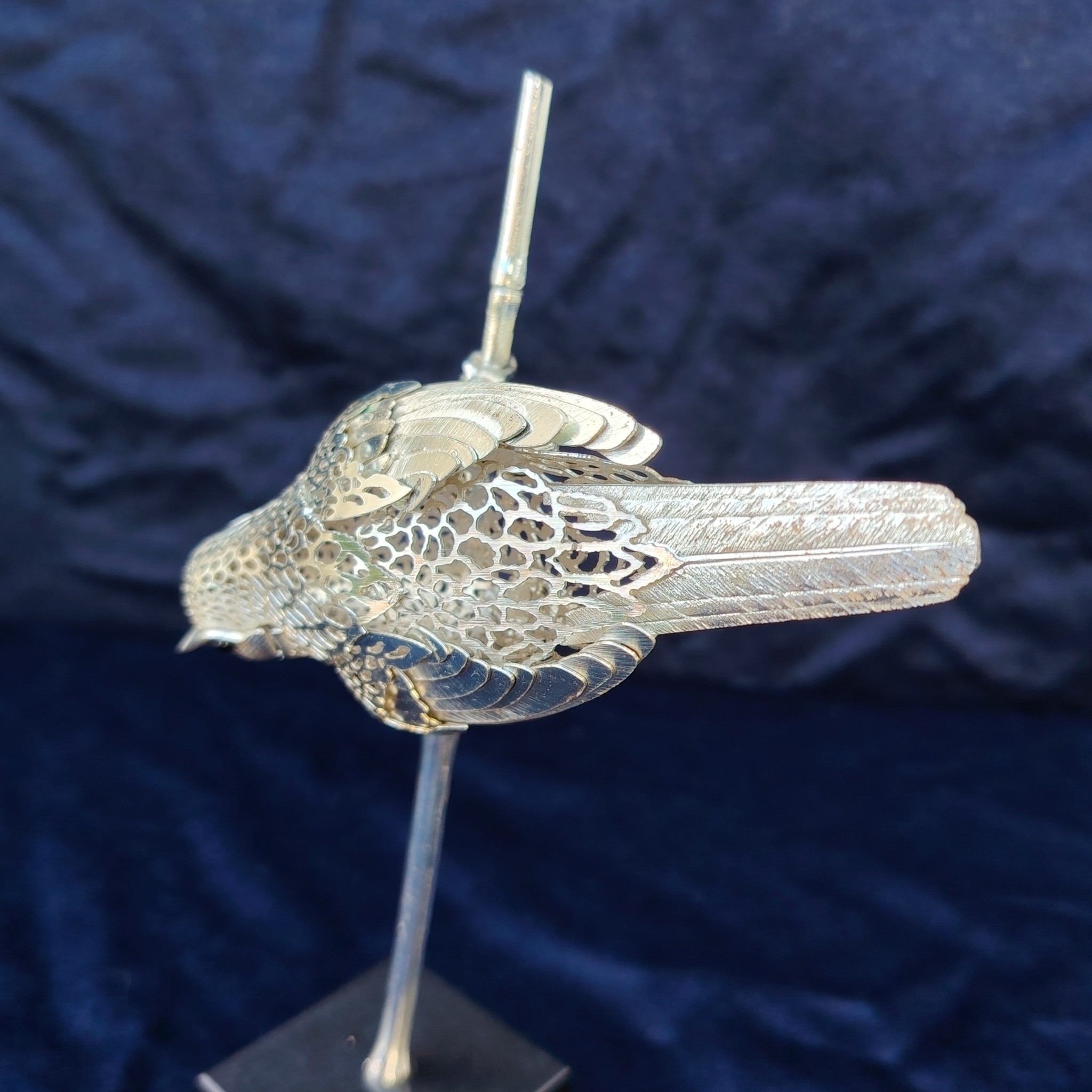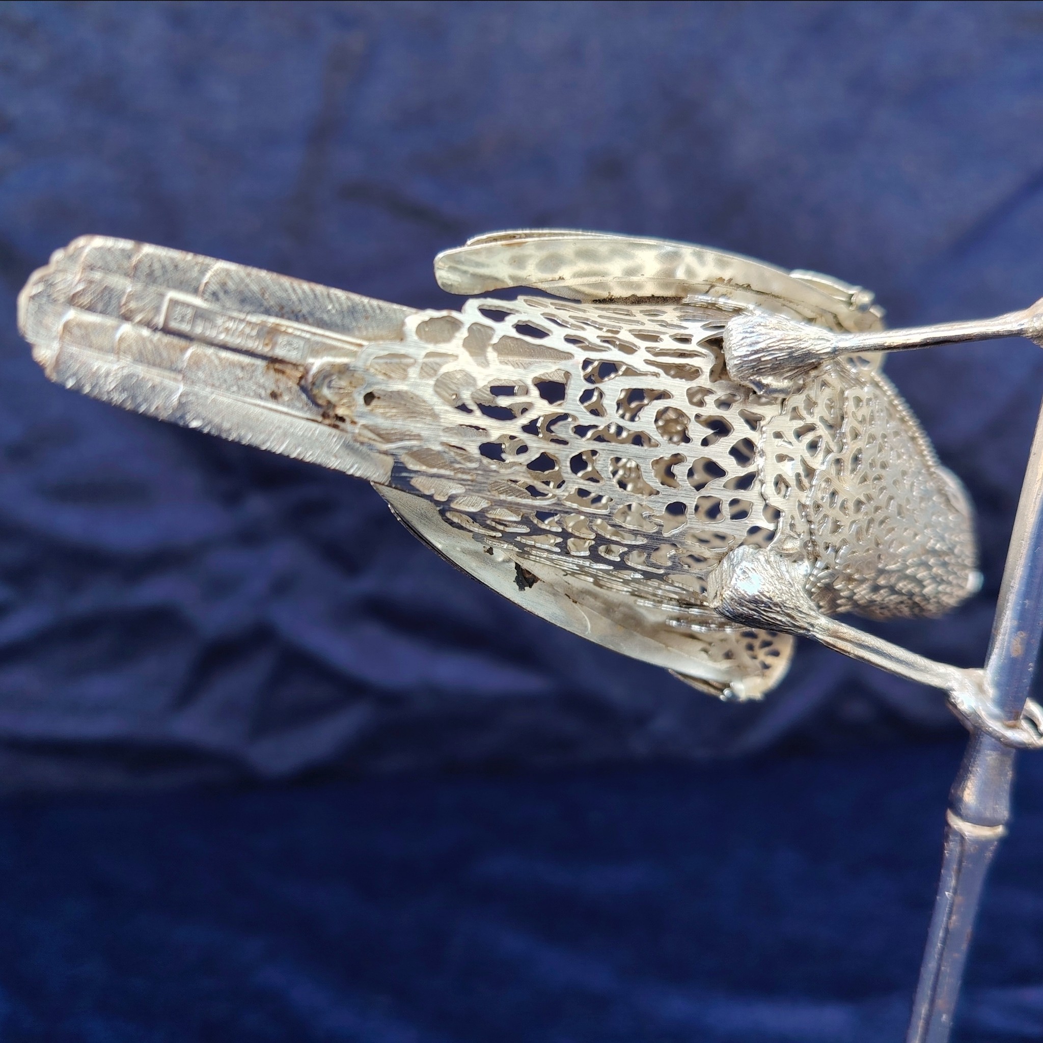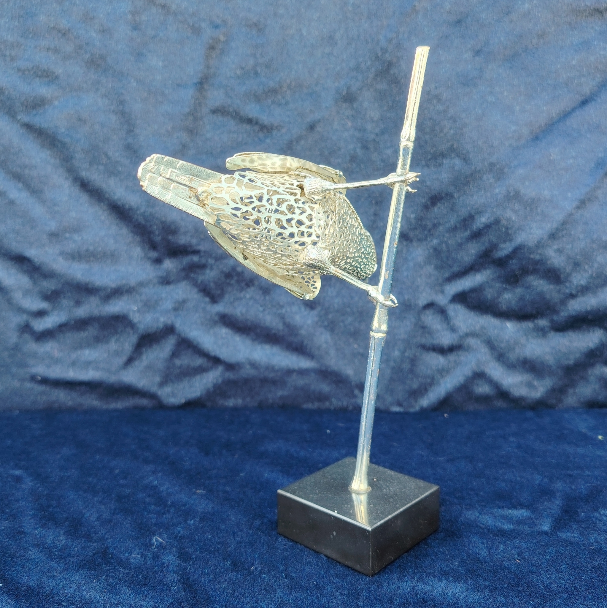 Rousserolle argenté de la collection Lumière d’argent créée par Christofle entre 1987 et 1994 dans sa manufacture de Saint-Denis. L’oiseau est agrémenté d’yeux en onyx. Oiseau agrippé sur une baguette représentant un bambou. Le tout fixé sur un socle lesté noir. Signé sur la queue.