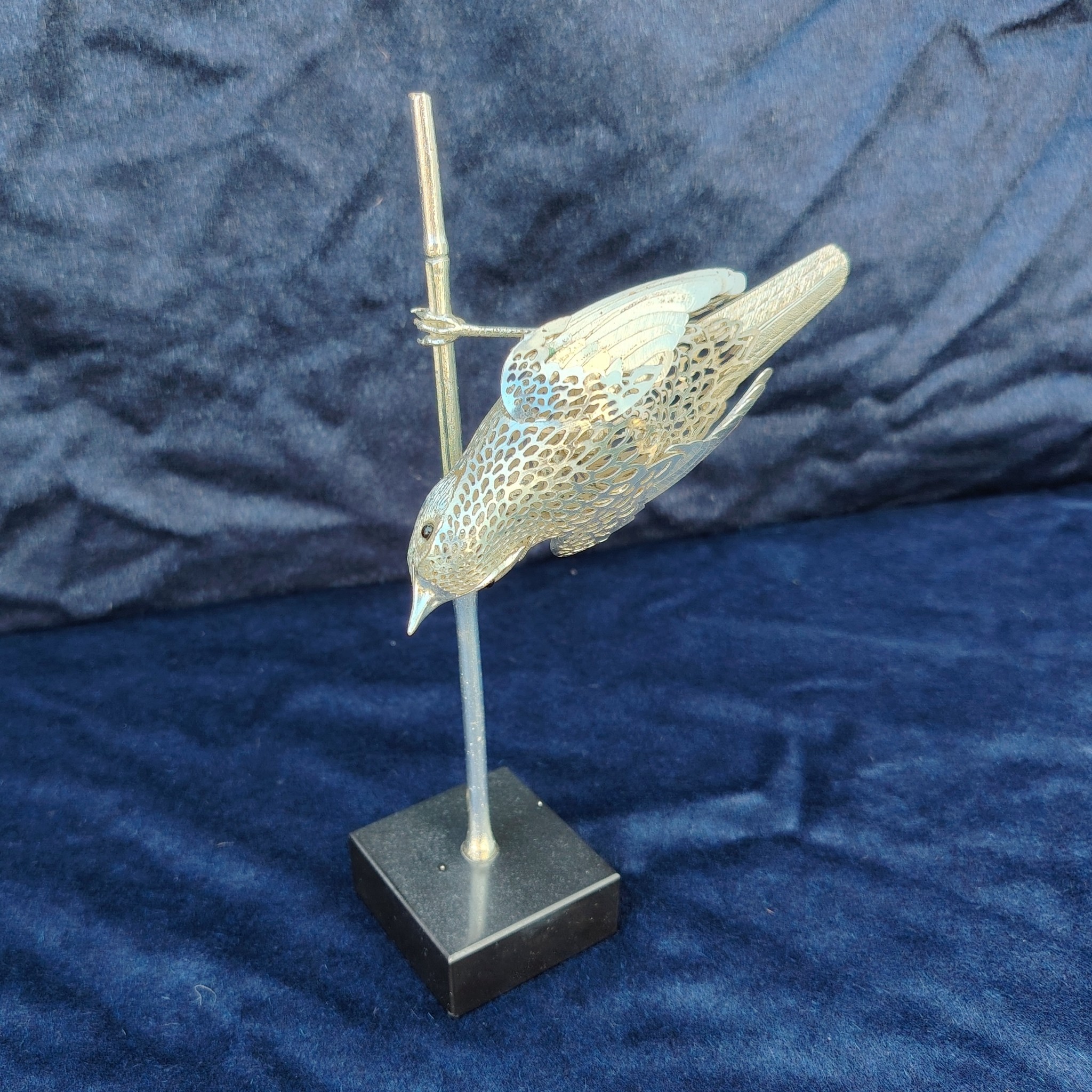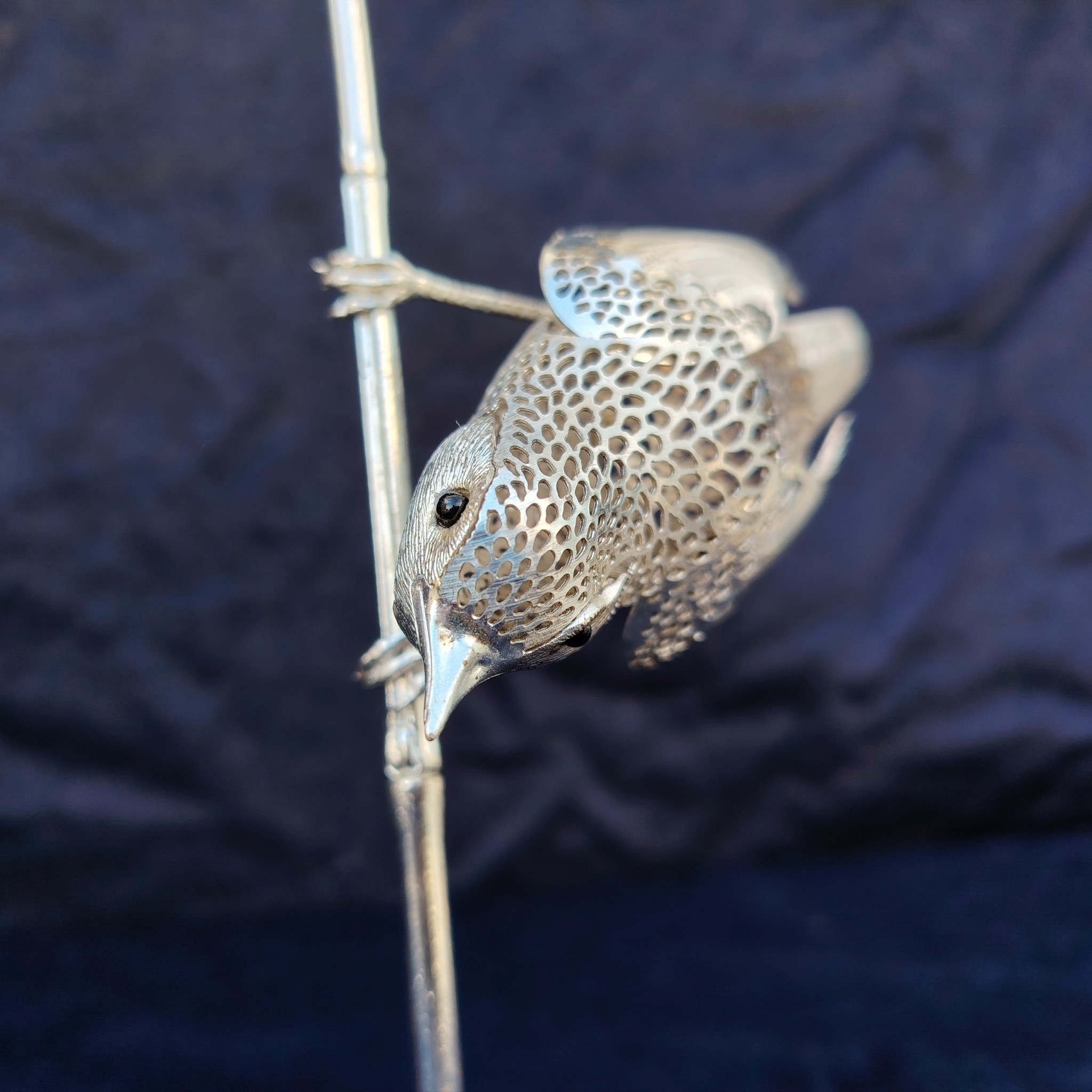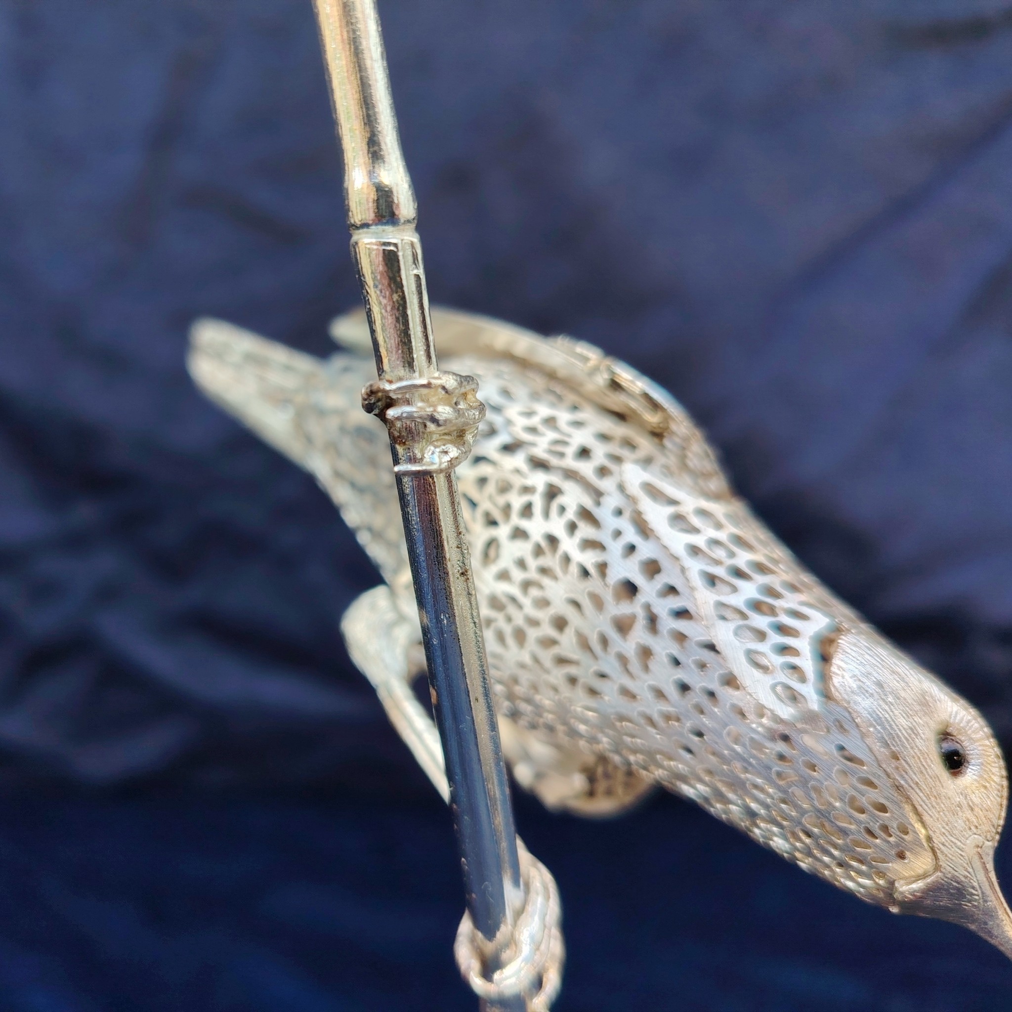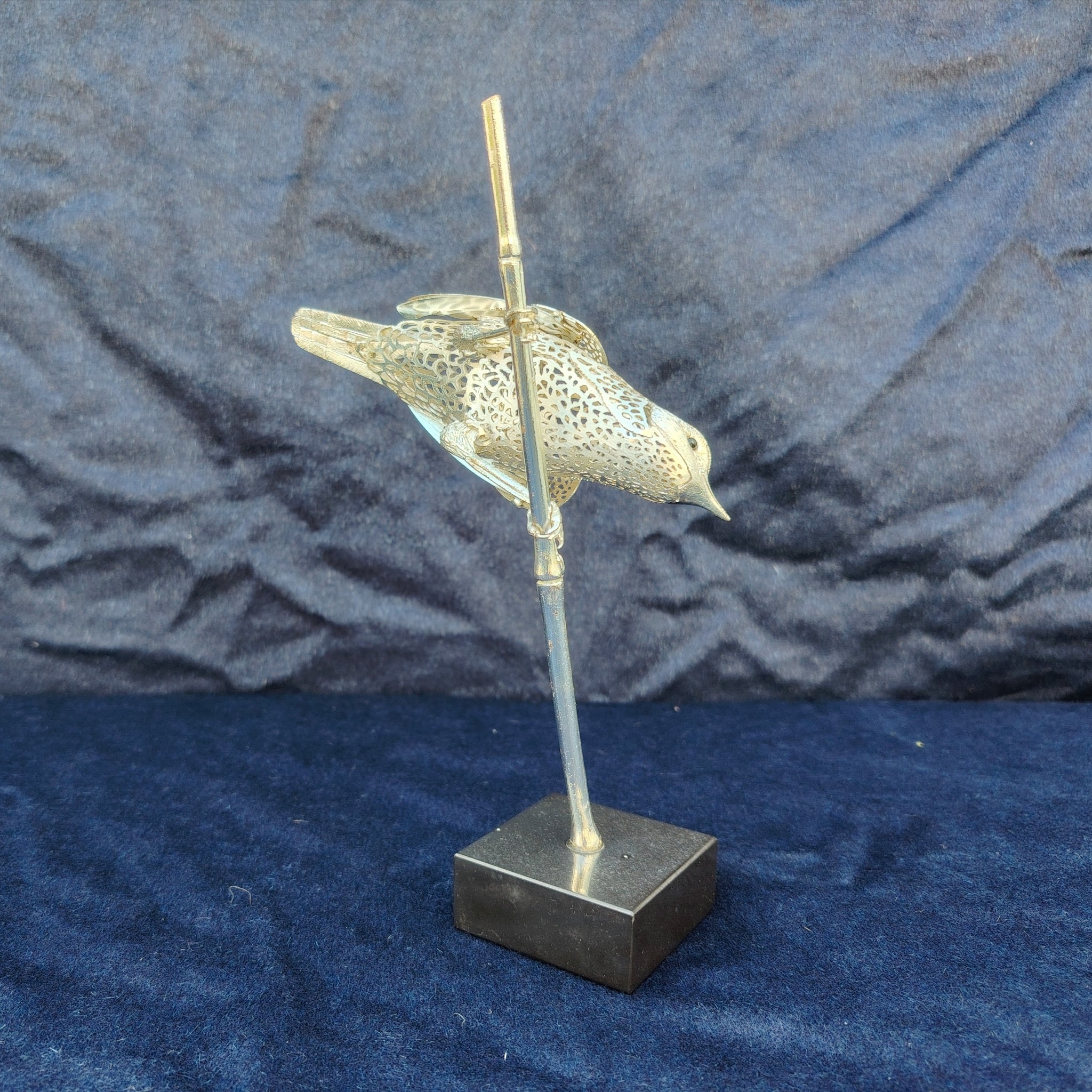 Rousserolle argenté de la collection Lumière d’argent créée par Christofle entre 1987 et 1994 dans sa manufacture de Saint-Denis. L’oiseau est agrémenté d’yeux en onyx. Oiseau agrippé sur une baguette représentant un bambou. Le tout fixé sur un socle lesté noir. Signé sur la queue.