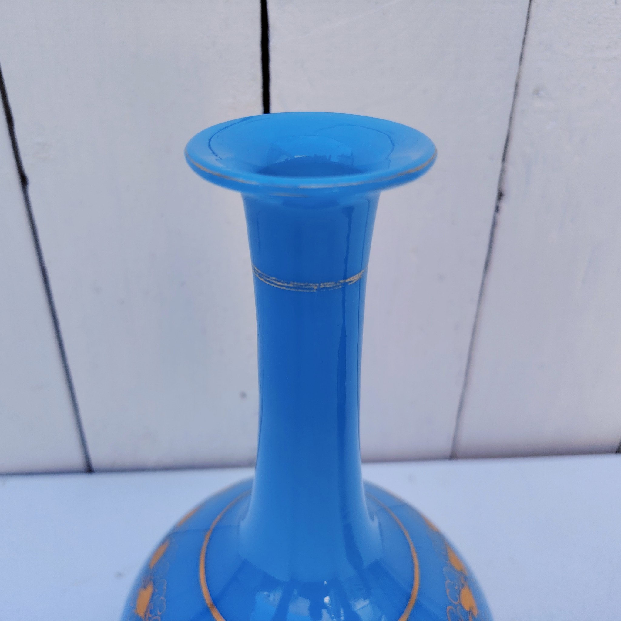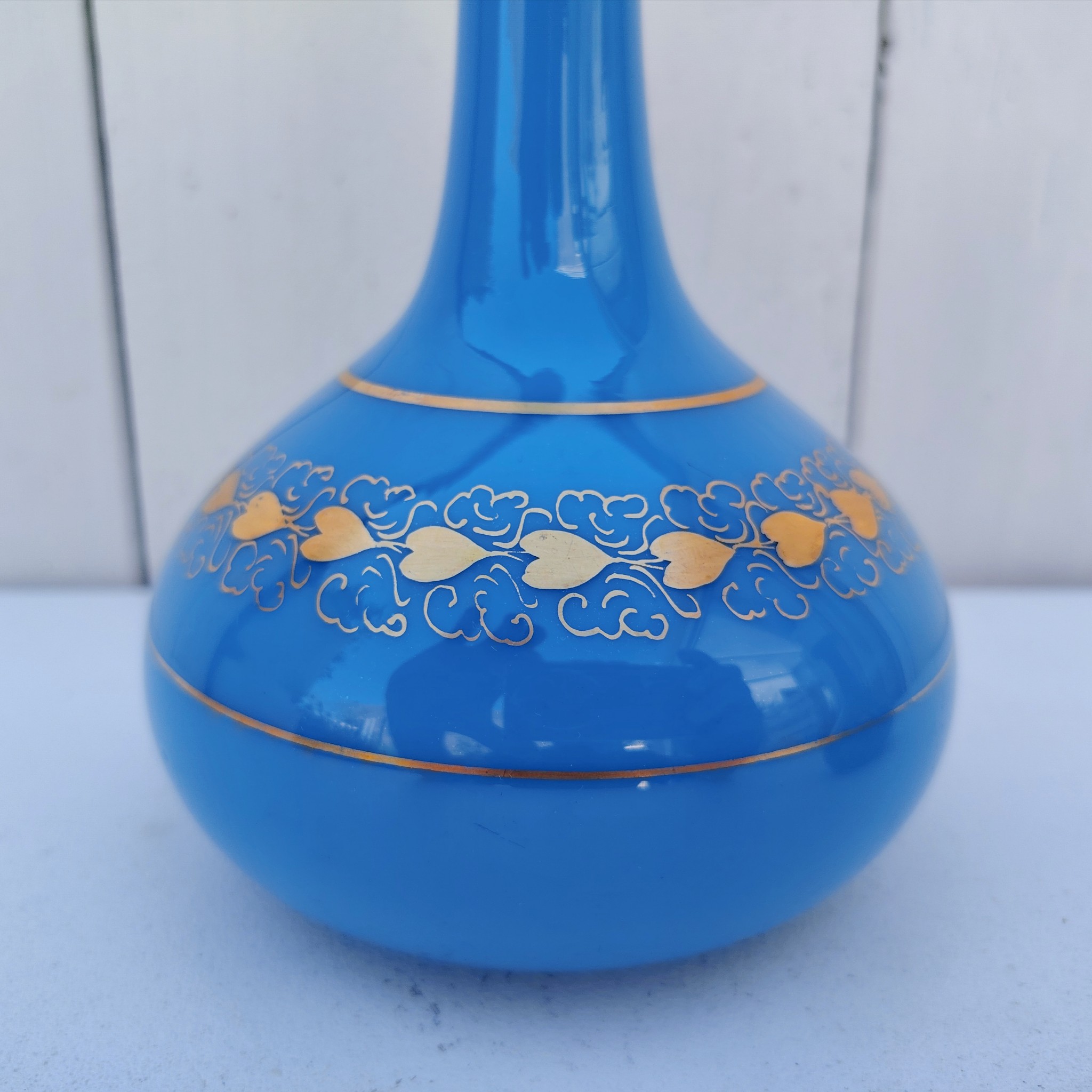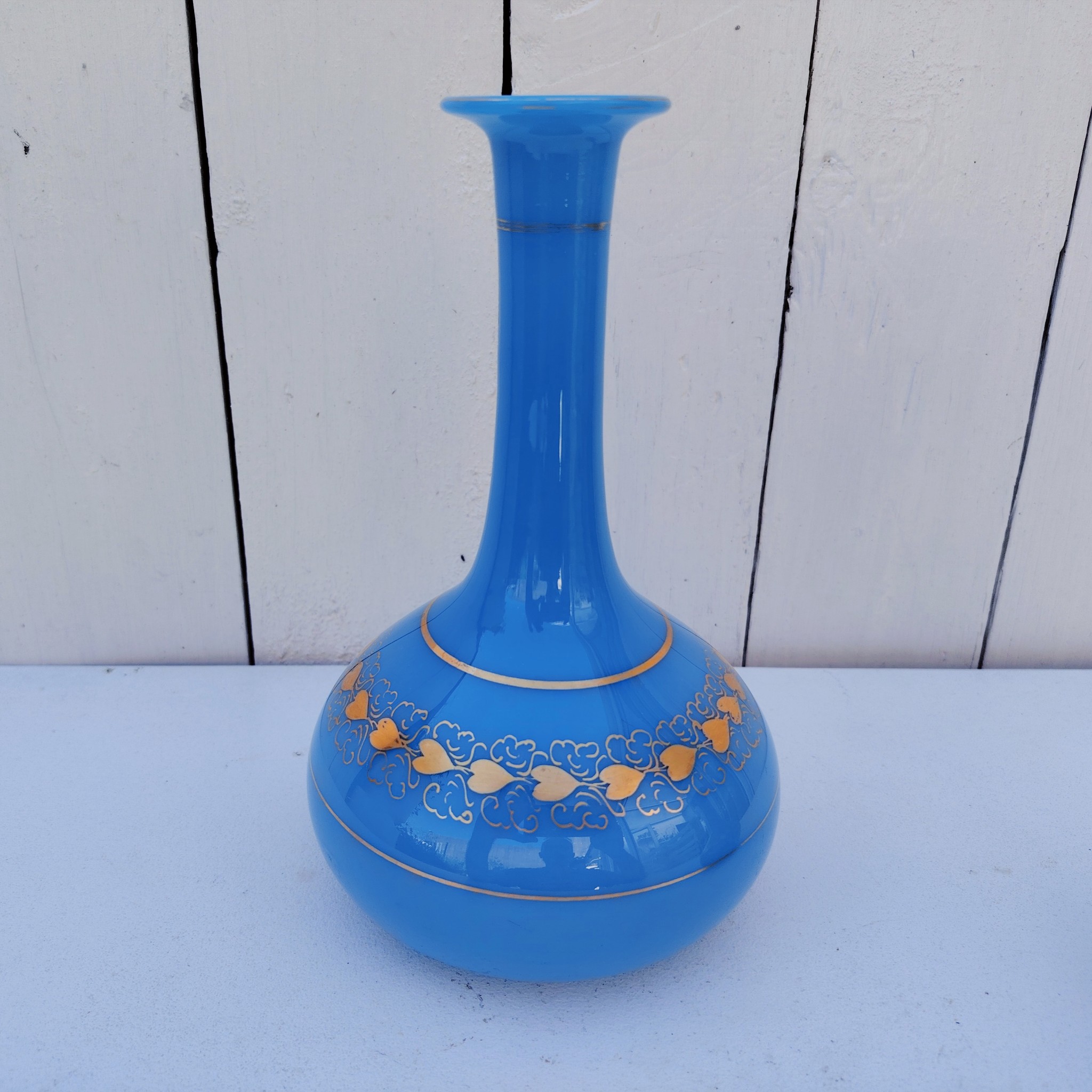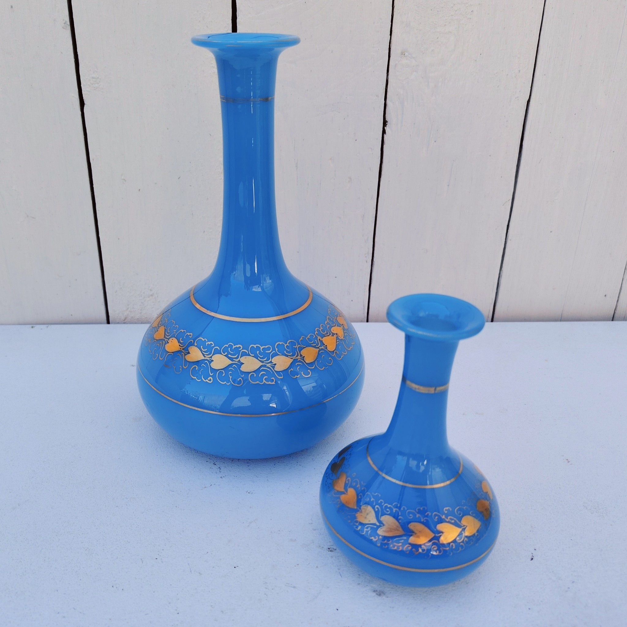 Paire de vases soliflores en opaline bleue turquoise et décor de coeurs dorés de la cristallerie de Baccarat. Epoque Napoléon III.