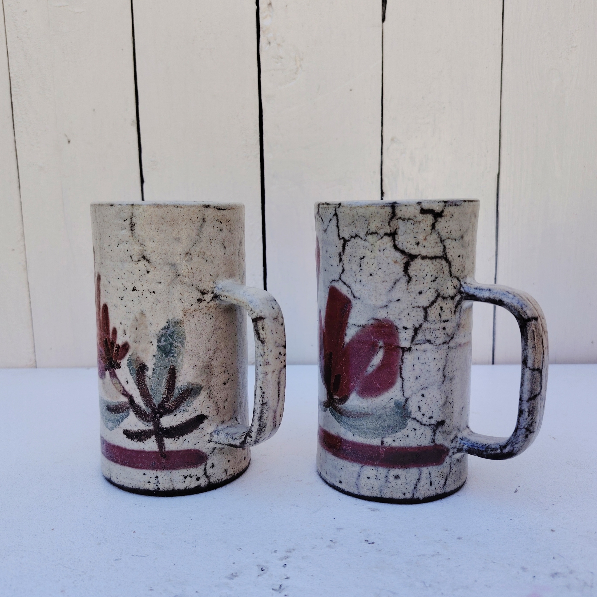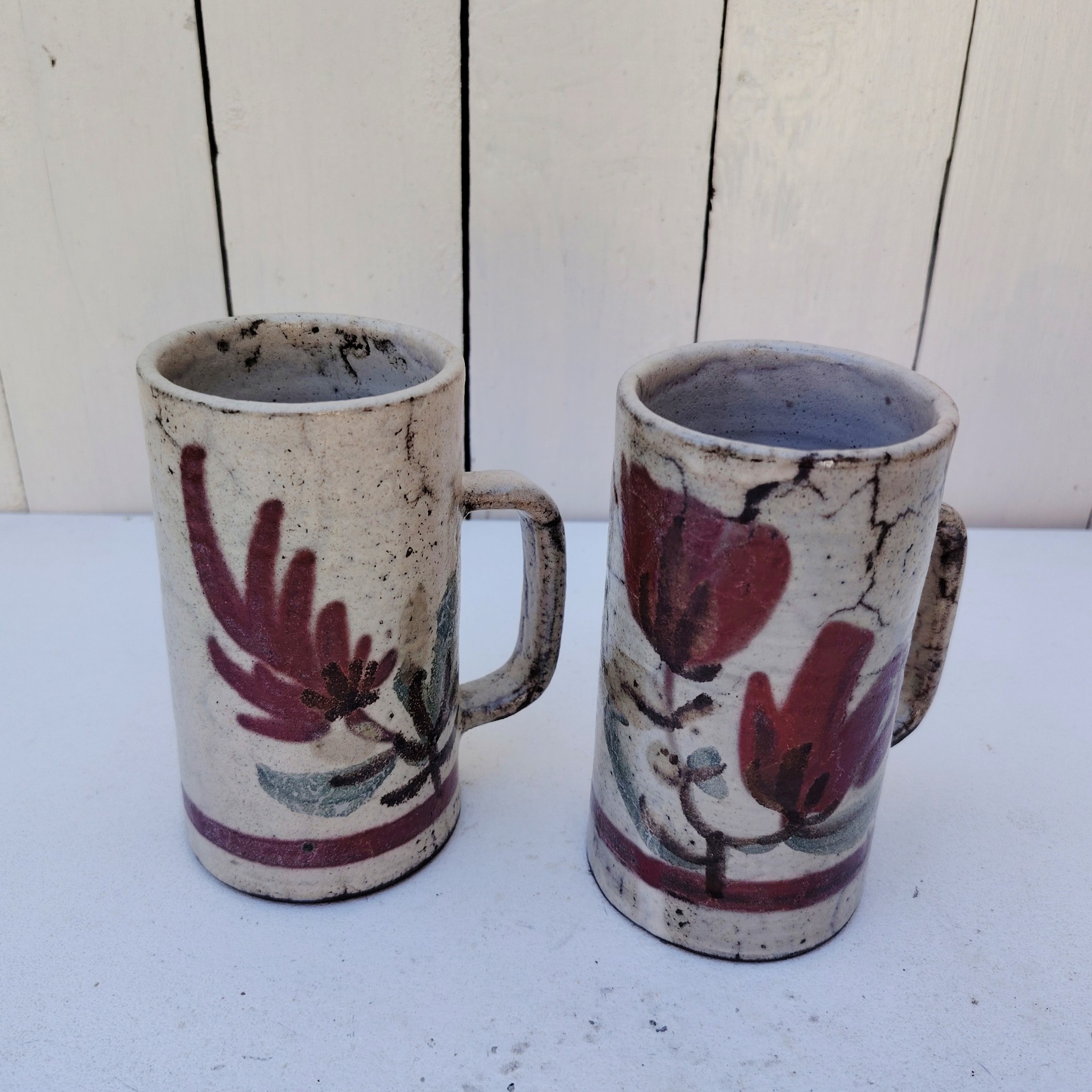 Paire de mugs à décor de fleurs en céramique, par Gustave Reynaud pour le mûrier à Vallauris.
