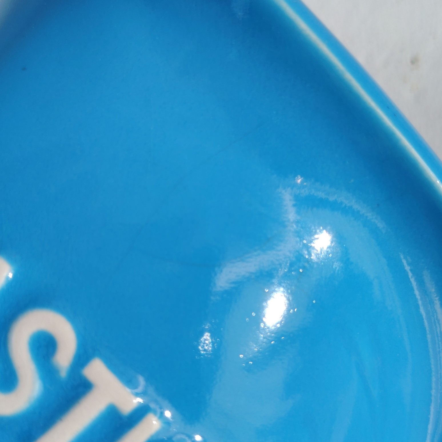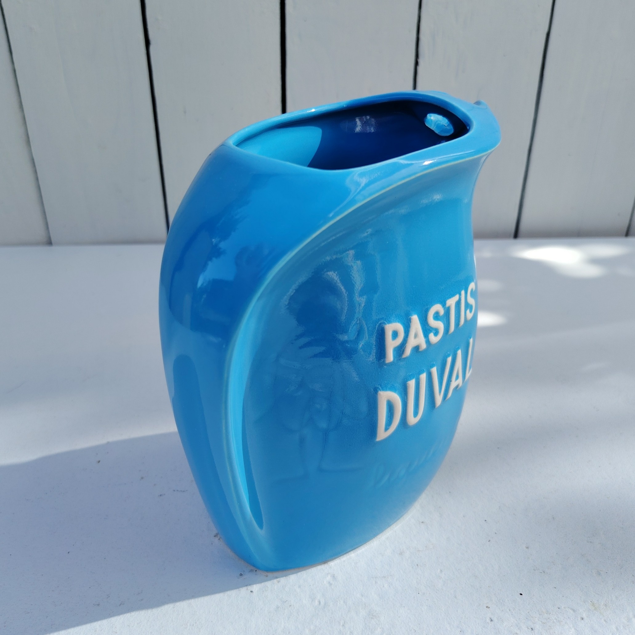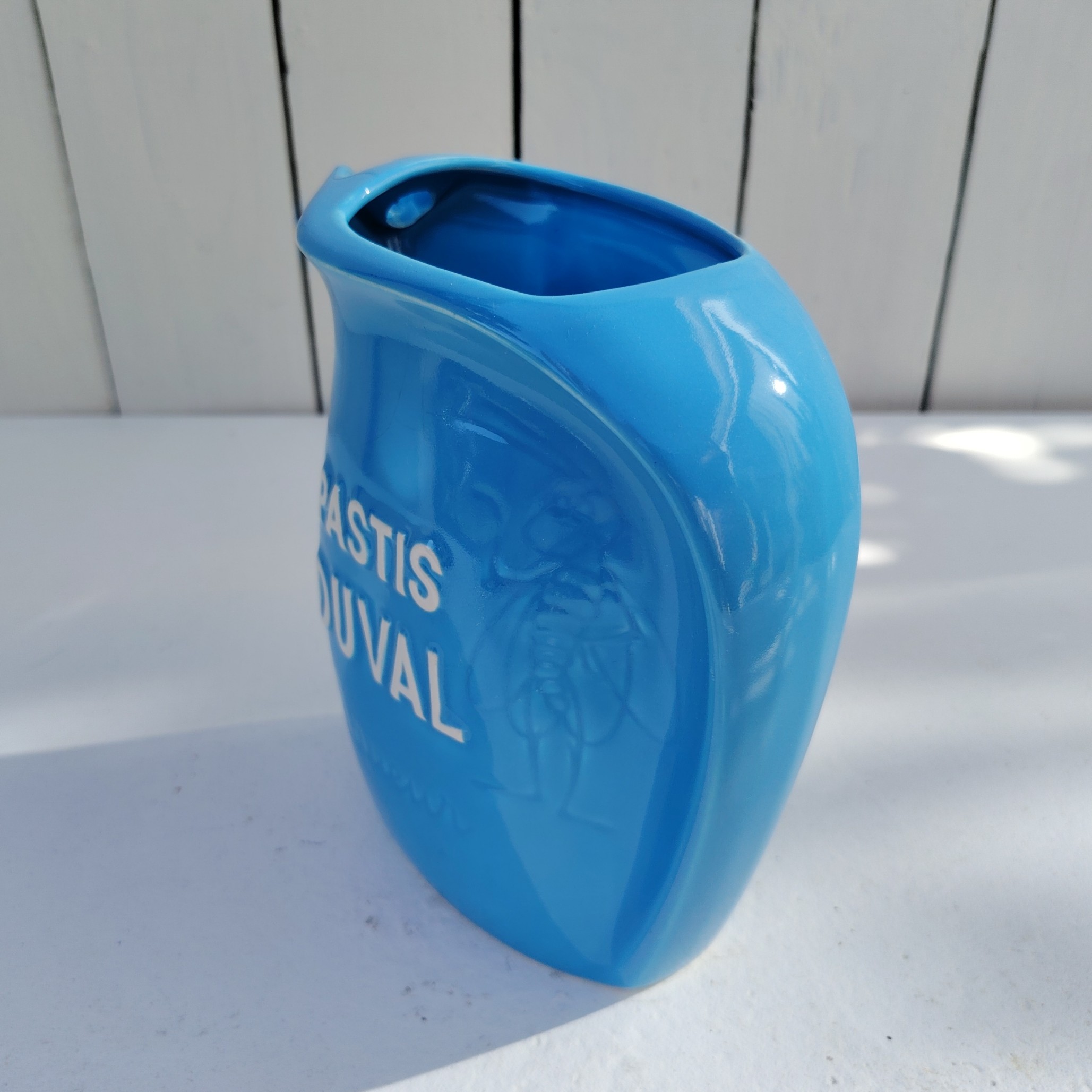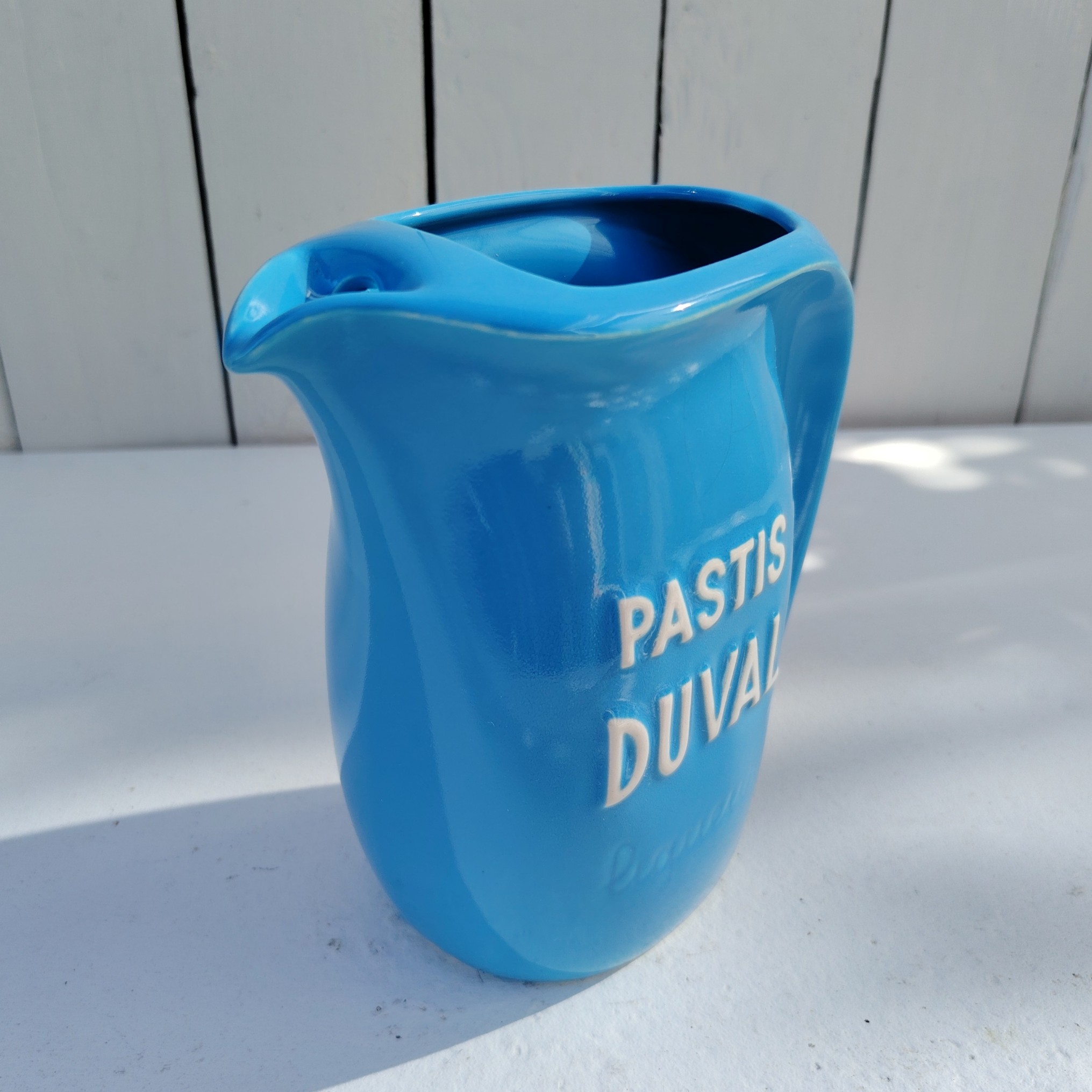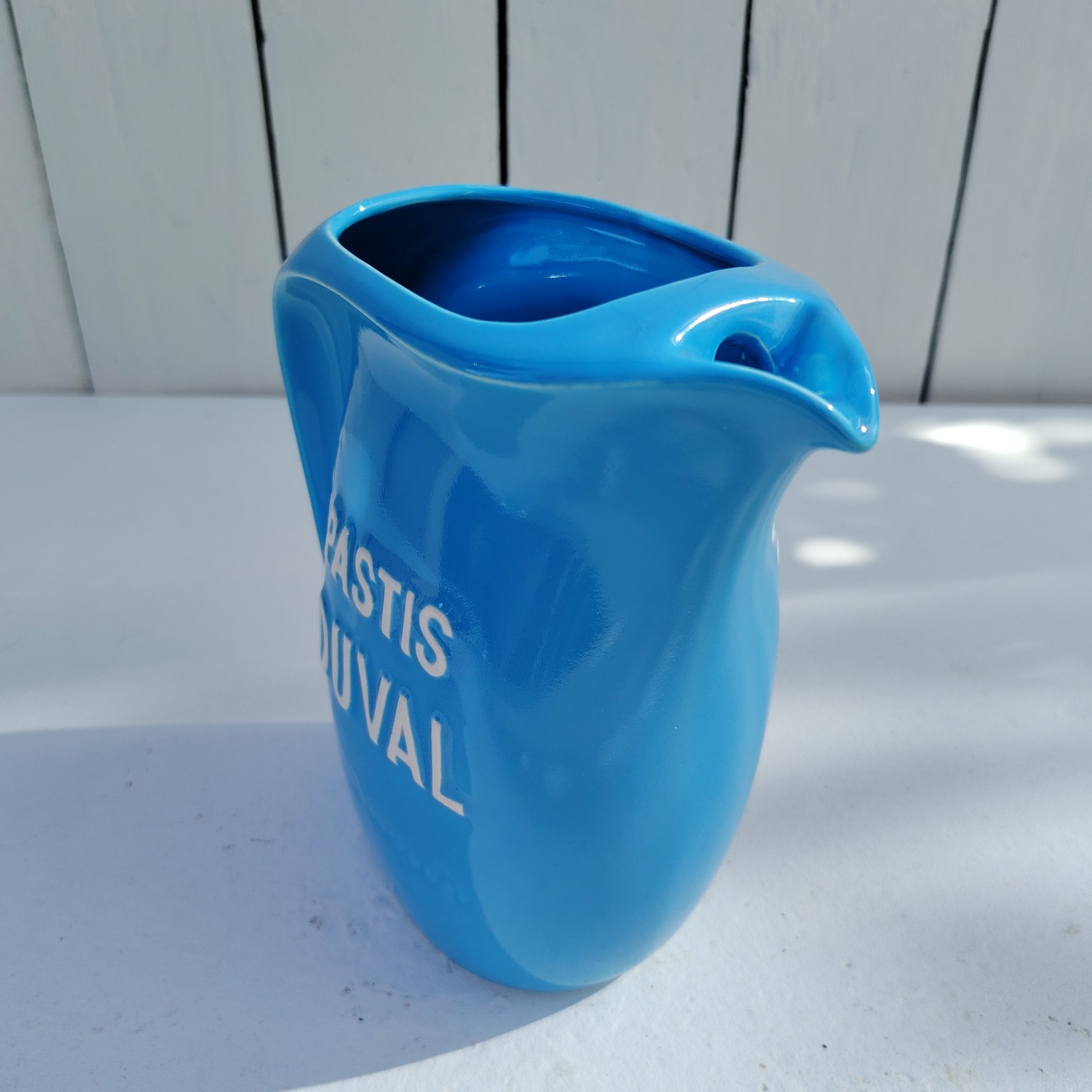 Pichet en céramique bleue publicitaire pour la marque d’anis Duval. Cigale en relief sur le coté de l’anse.