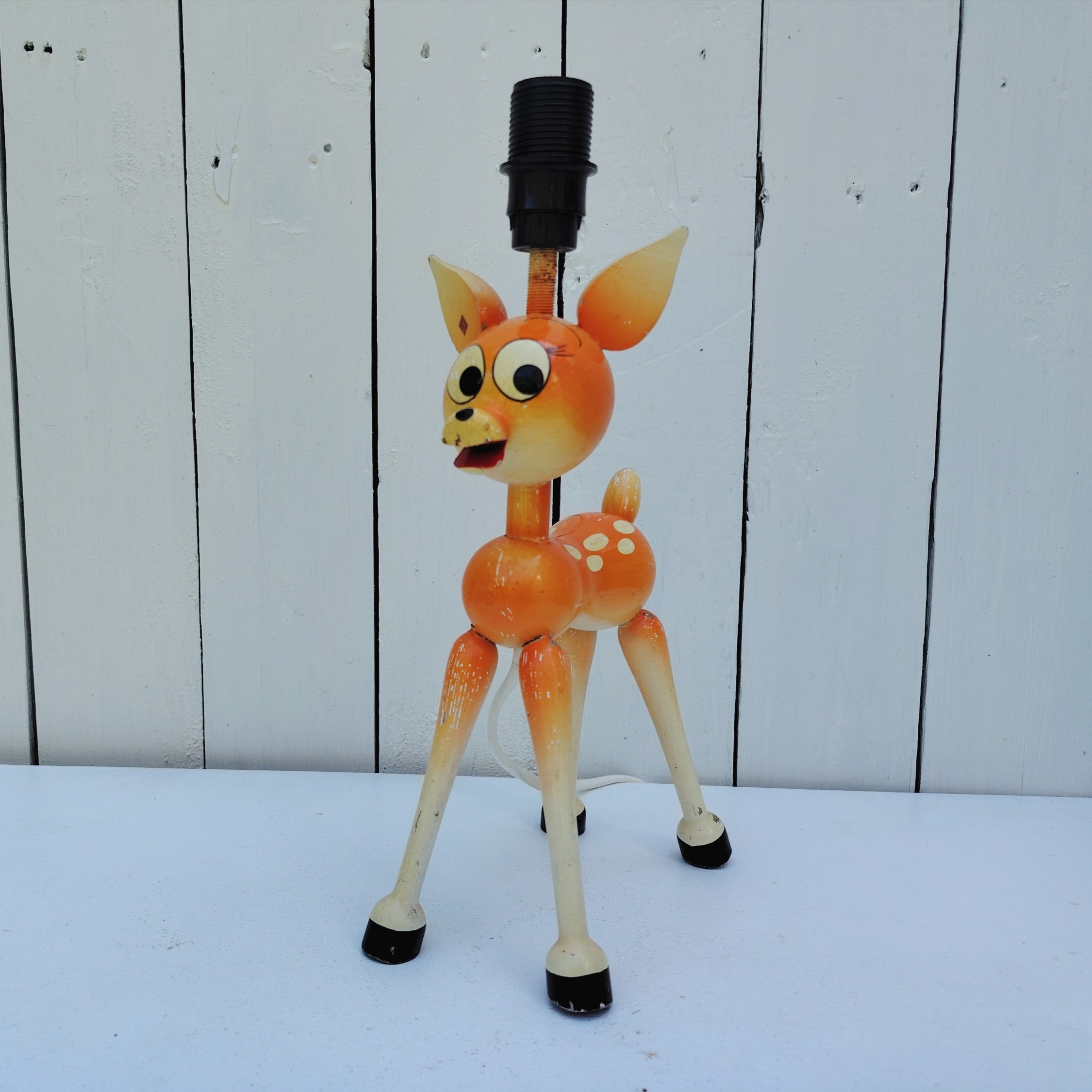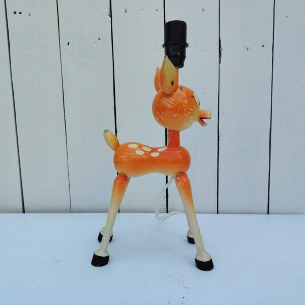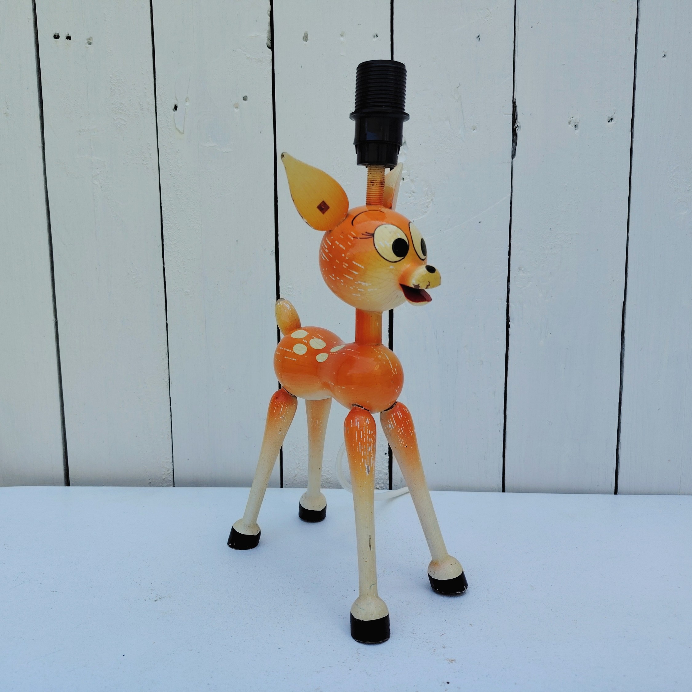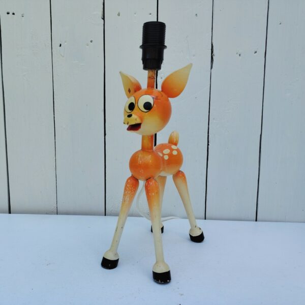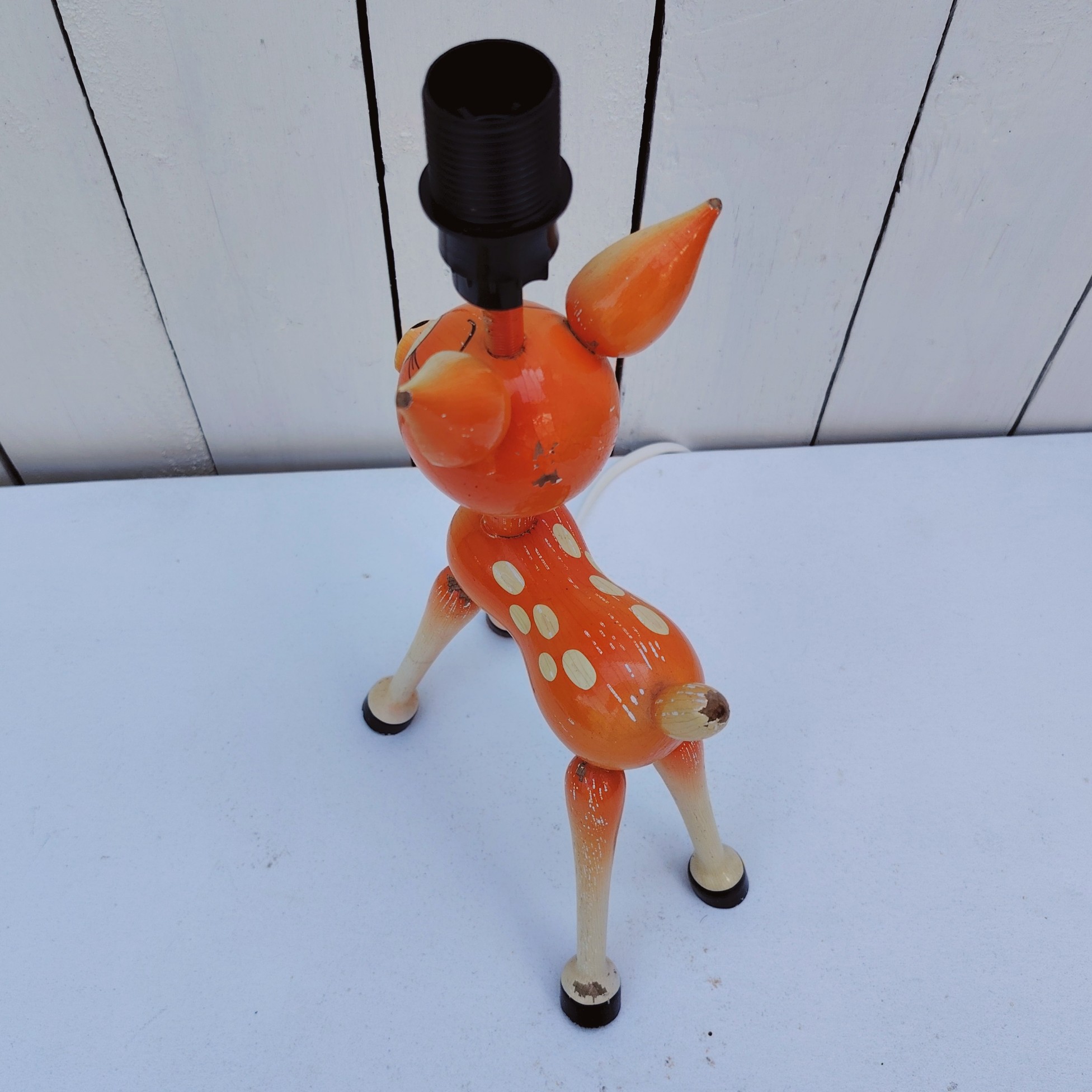 Pied de lampe datant des années 60, en bois peint à la forme de faon faisant penser à Bambi.