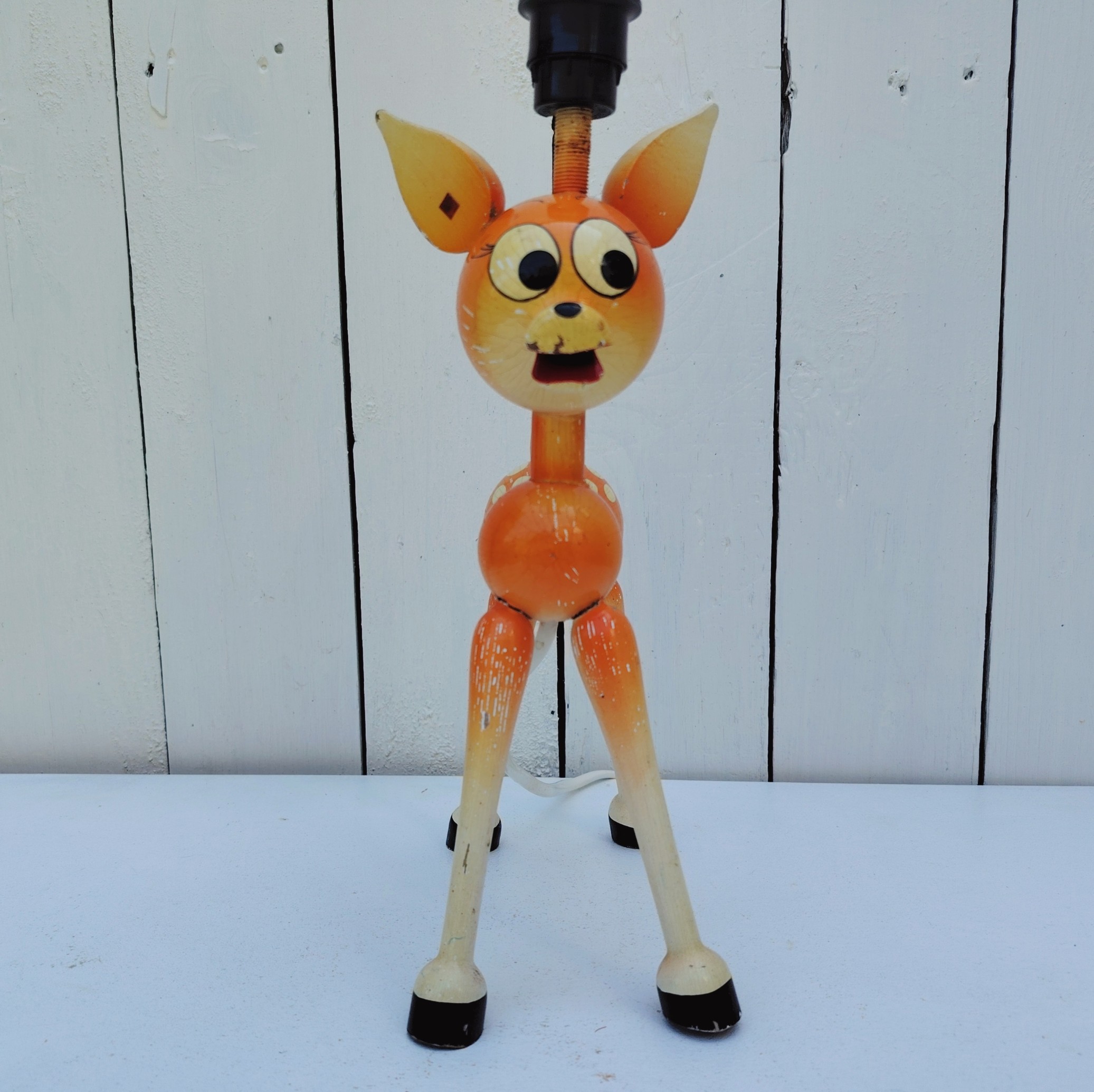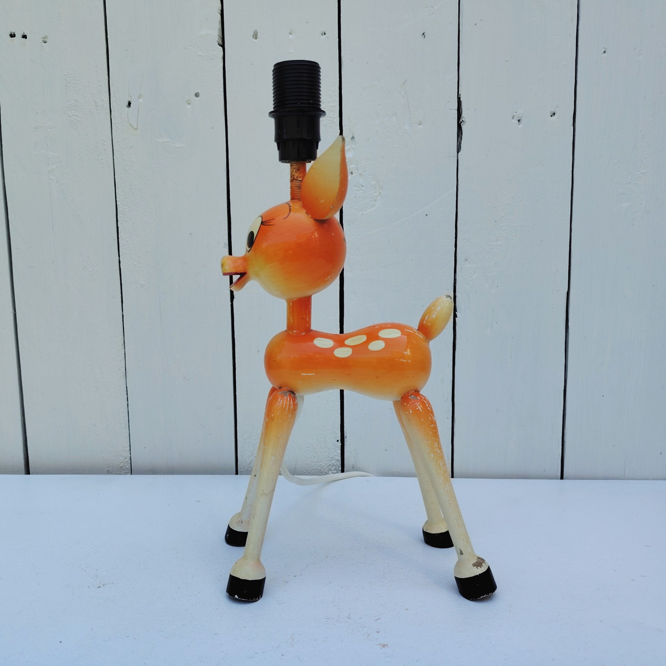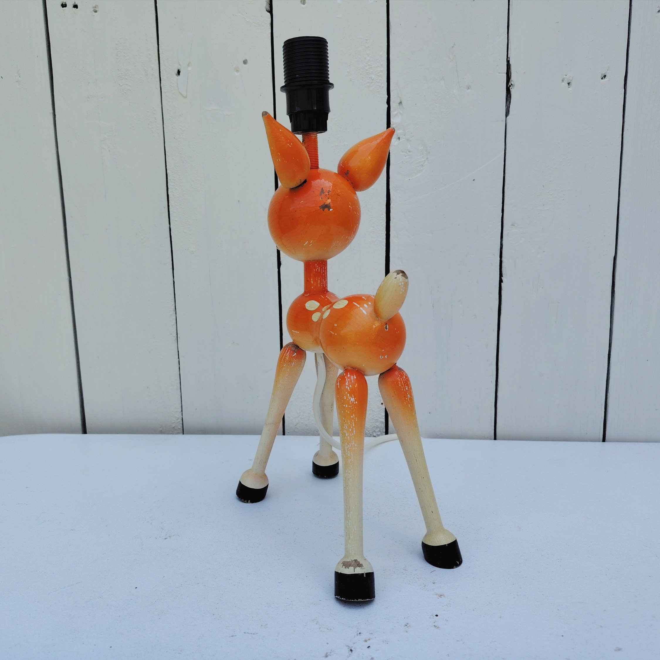 Pied de lampe datant des années 60, en bois peint à la forme de faon faisant penser à Bambi.