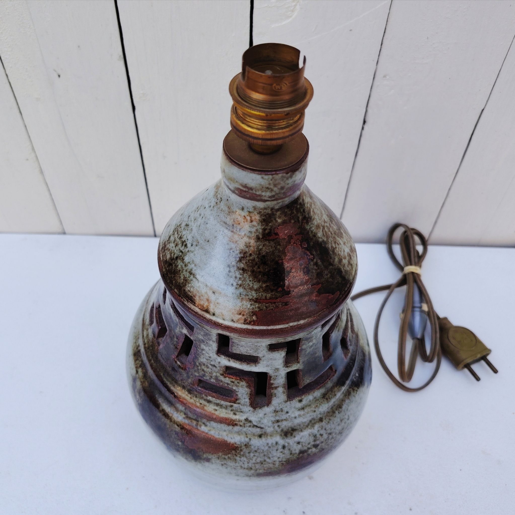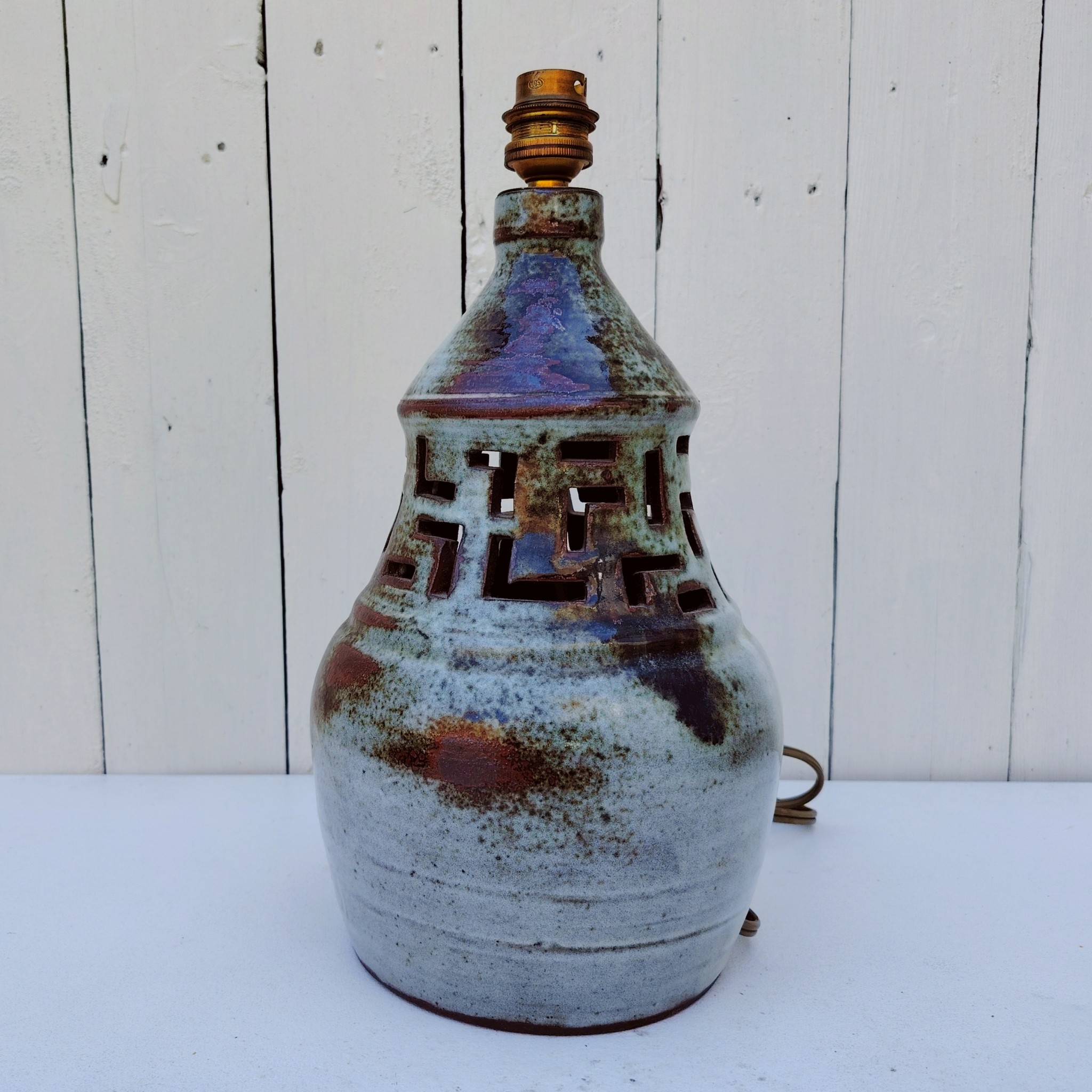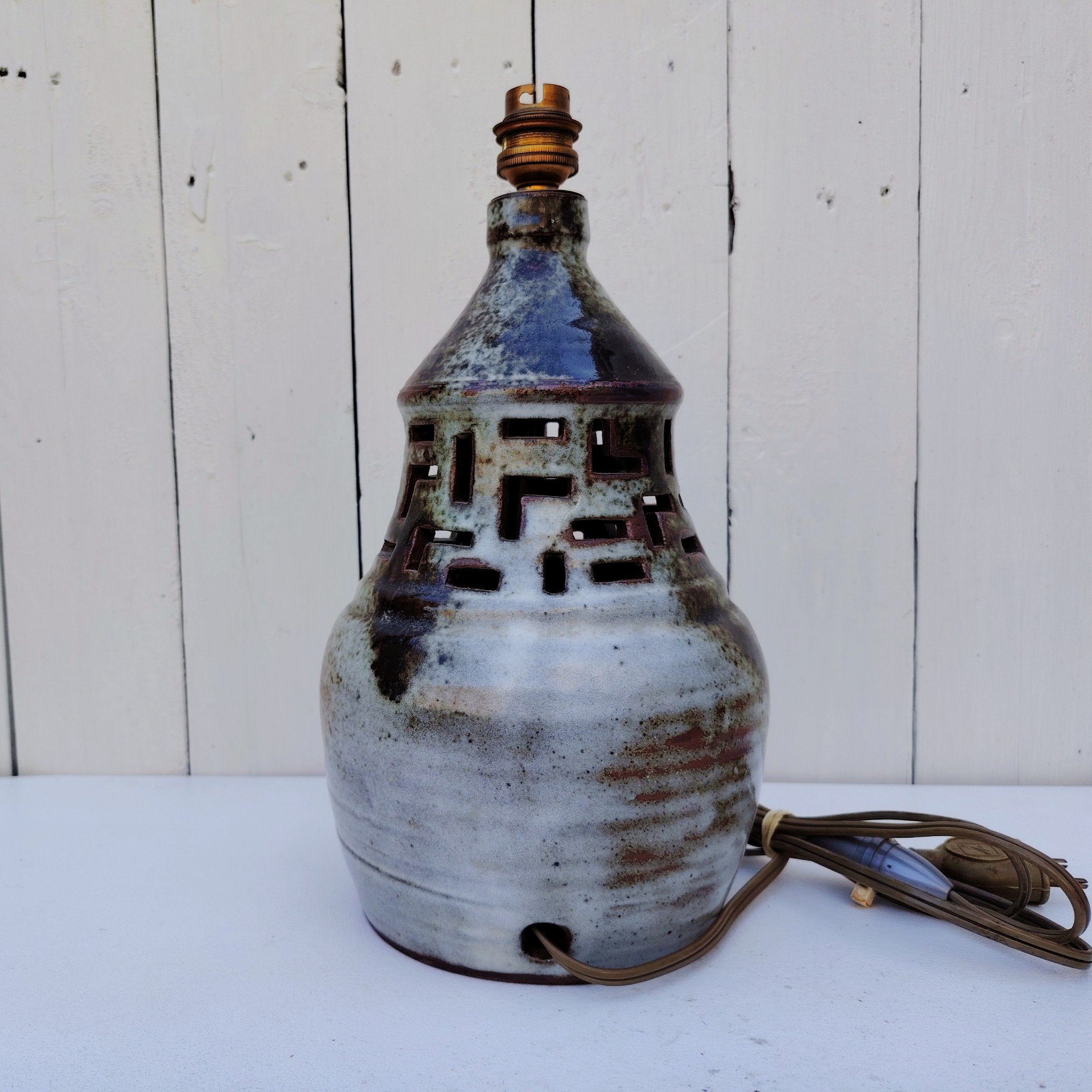 Pied de lampe en céramique ajourée par Chantal et Thierry Robert à Poncé sur Loire. signé sur le dessous.