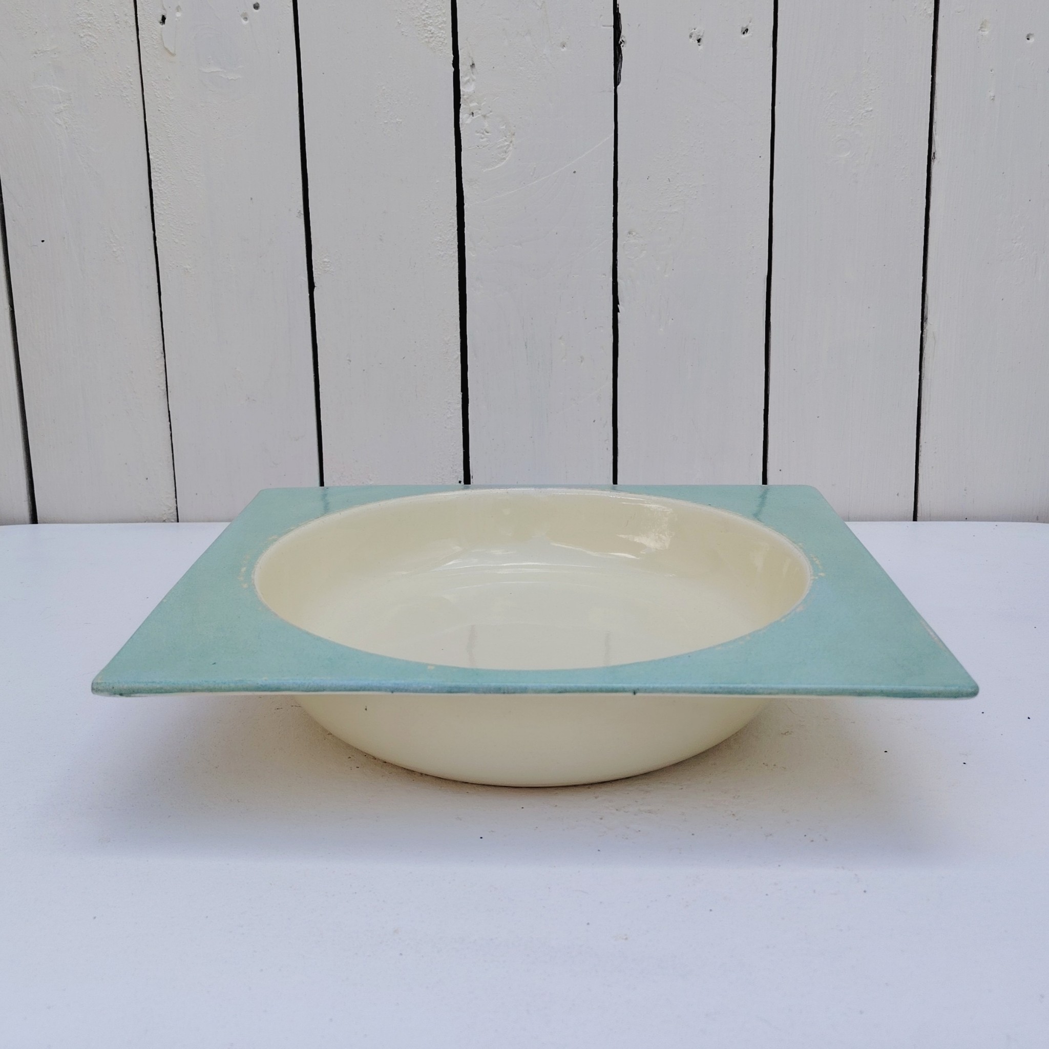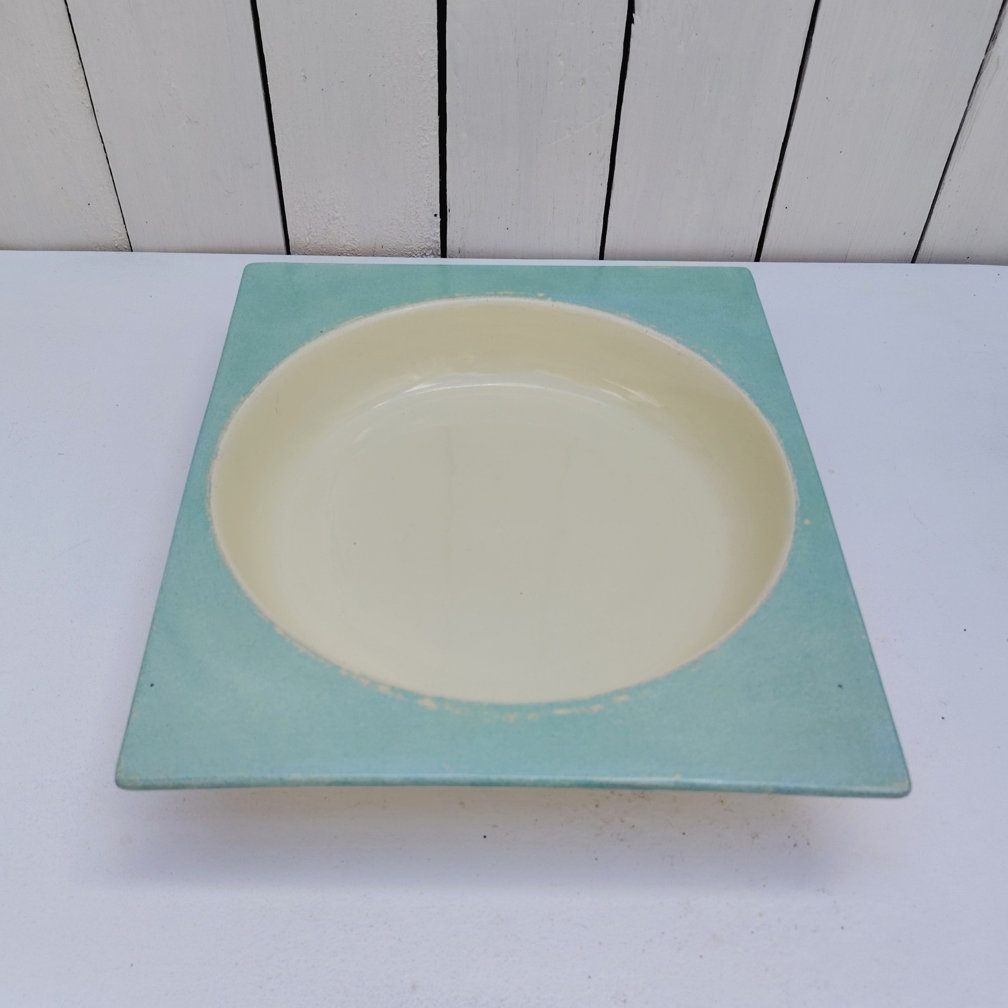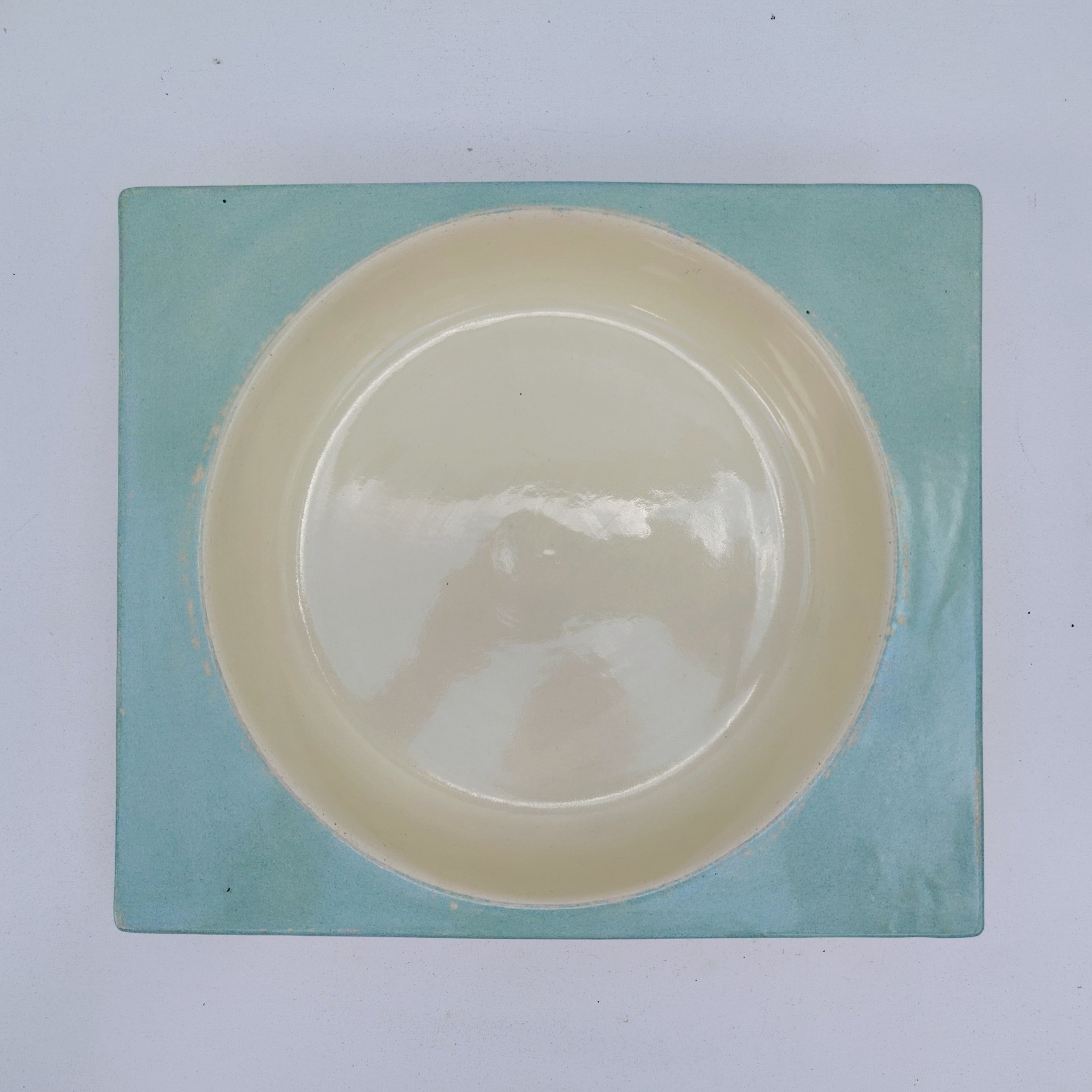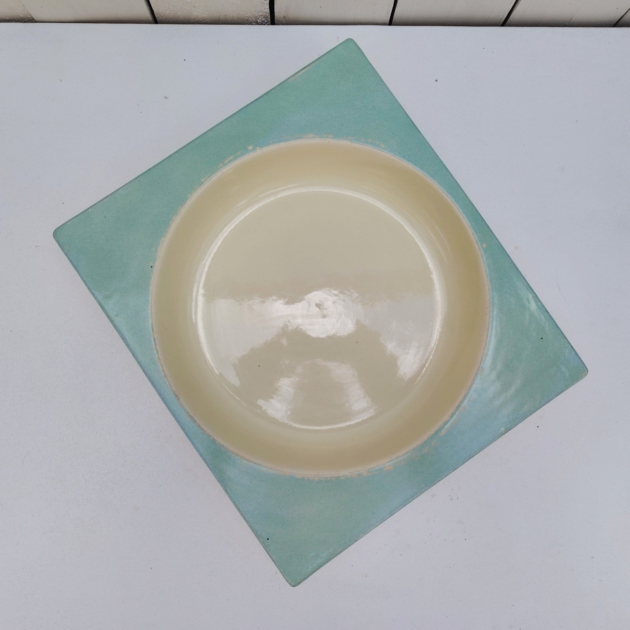 Plat creux ou légumier en faïence blanche et turquoise, Un rond dans un carré apporte une forme très élégante à ce plat. Créer par Jean Luce* .