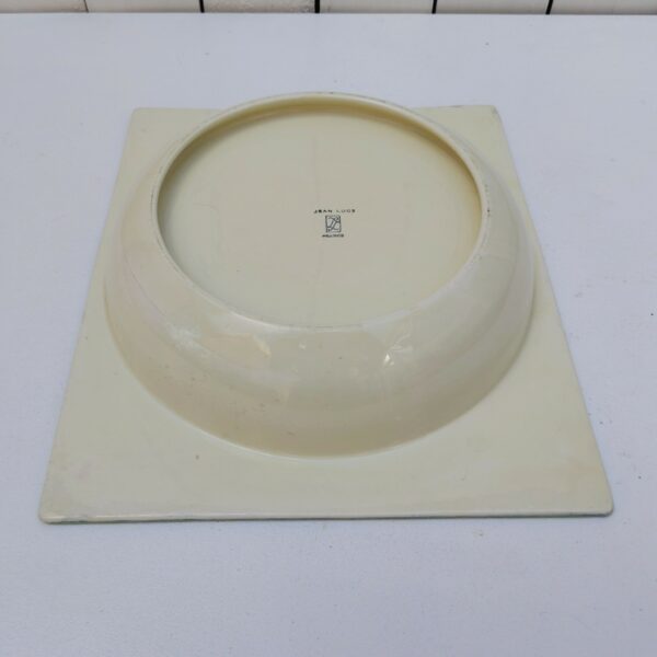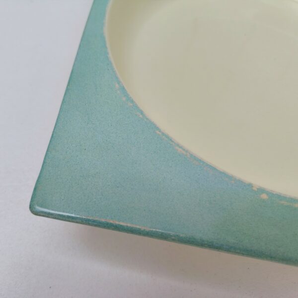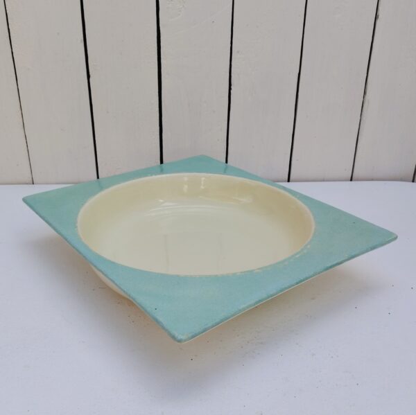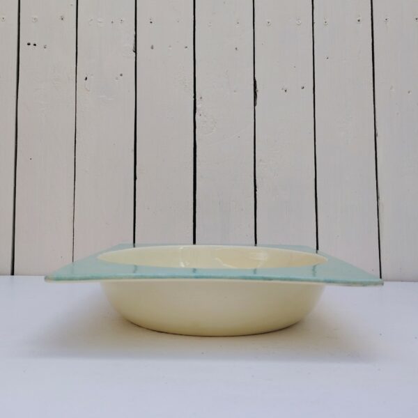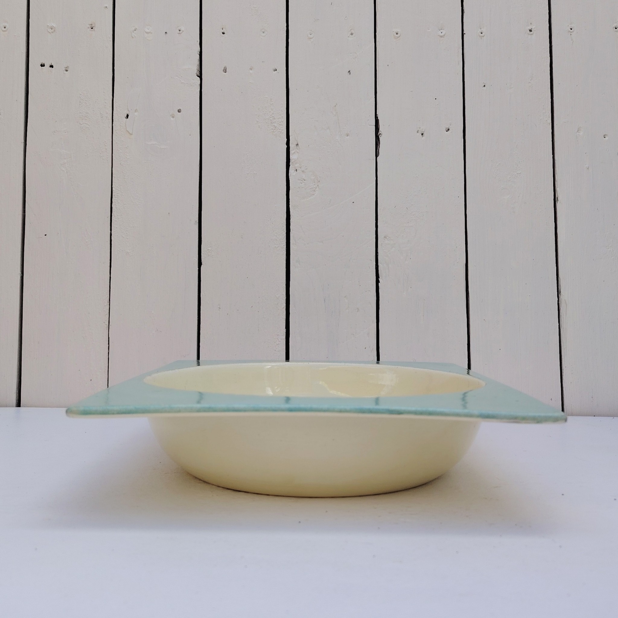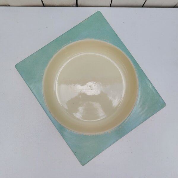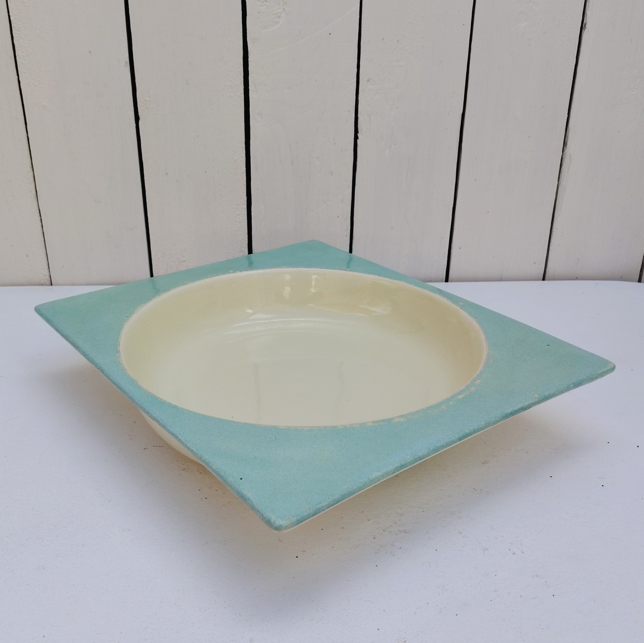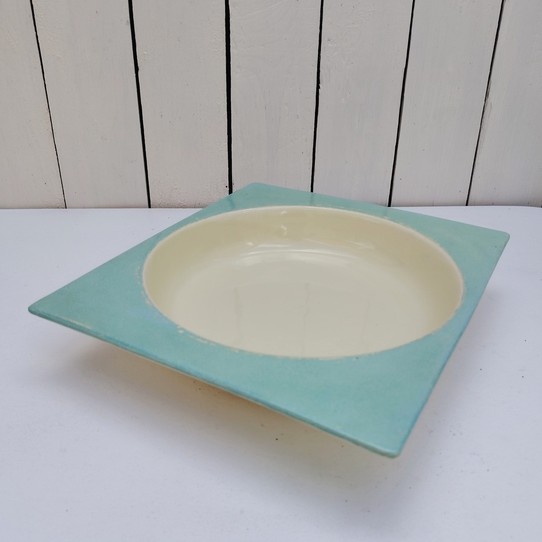 Plat creux ou légumier en faïence blanche et turquoise, Un rond dans un carré apporte une forme très élégante à ce plat. Créer par Jean Luce* .