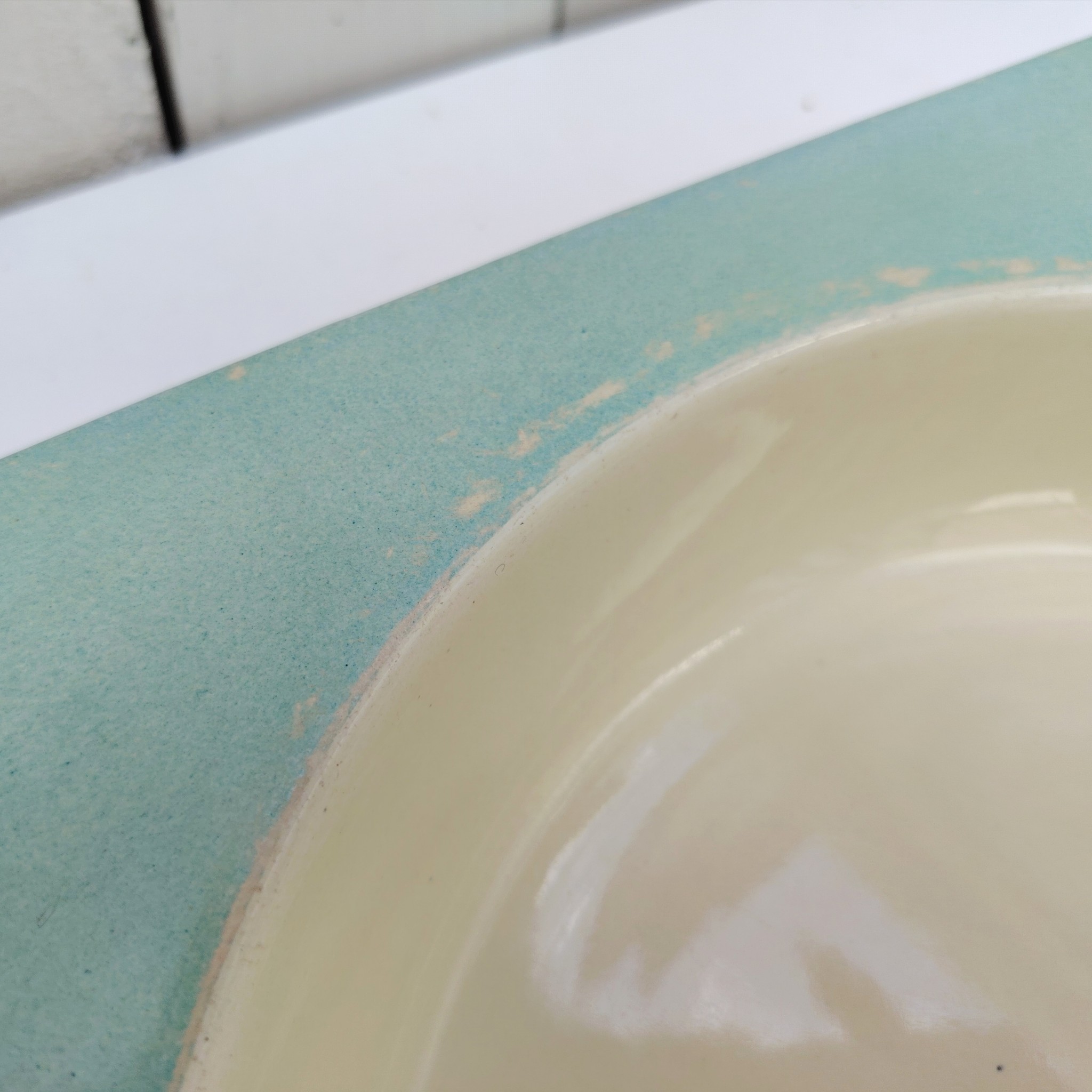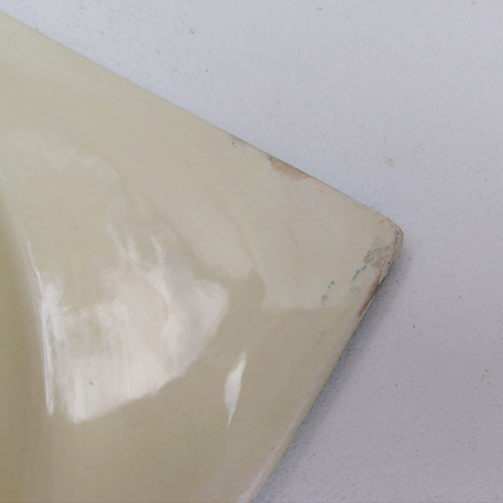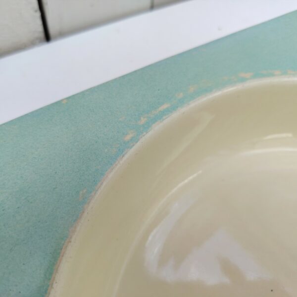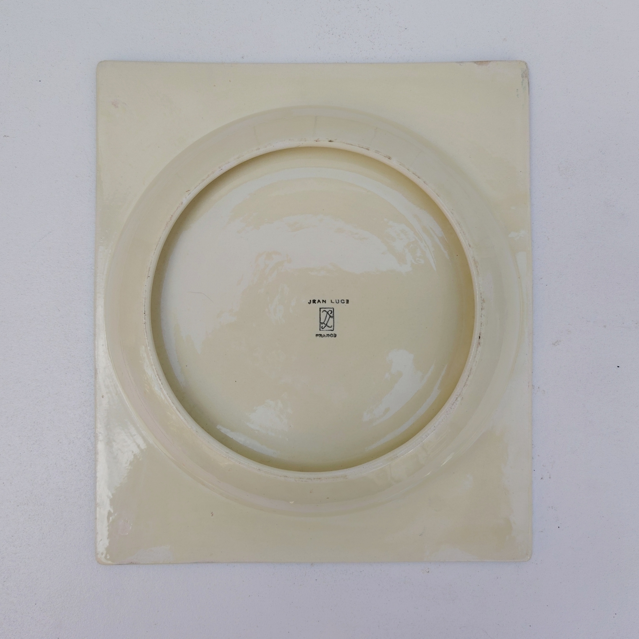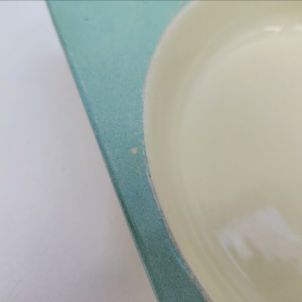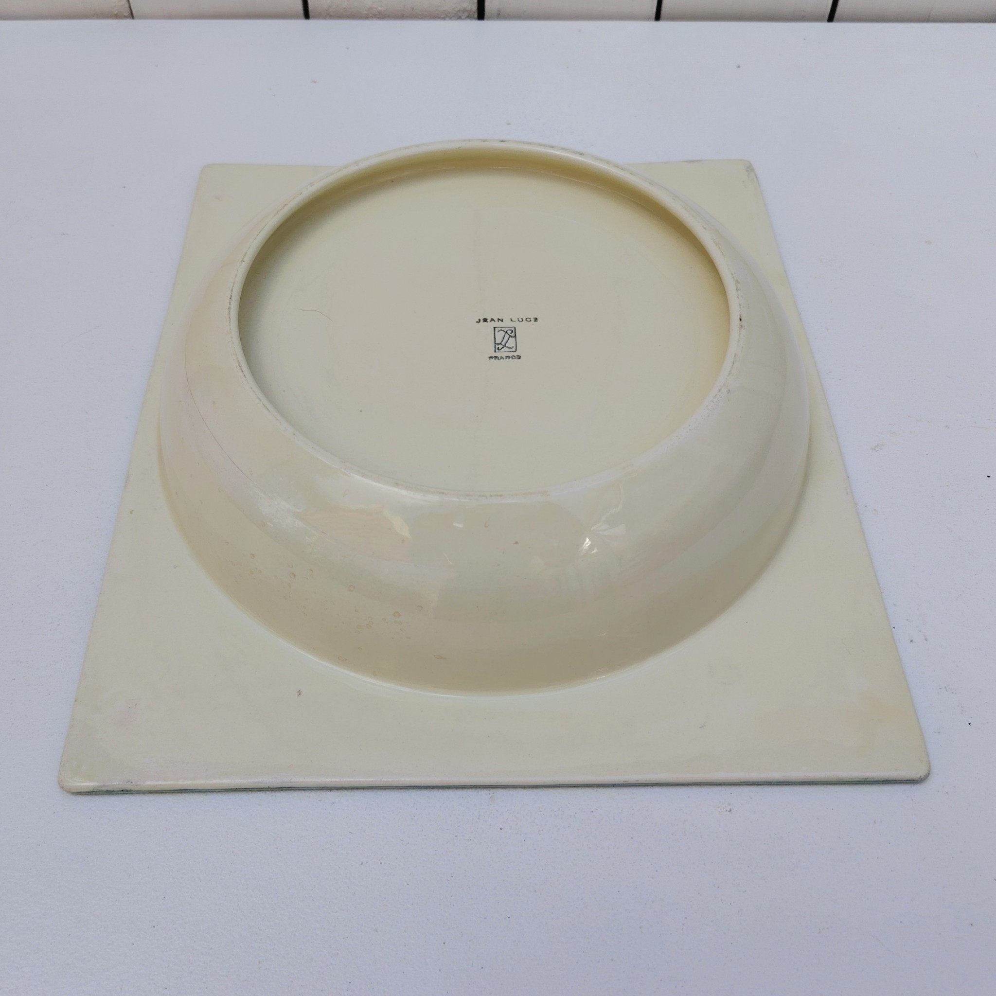 Plat creux ou légumier en faïence blanche et turquoise, Un rond dans un carré apporte une forme très élégante à ce plat. Créer par Jean Luce* .