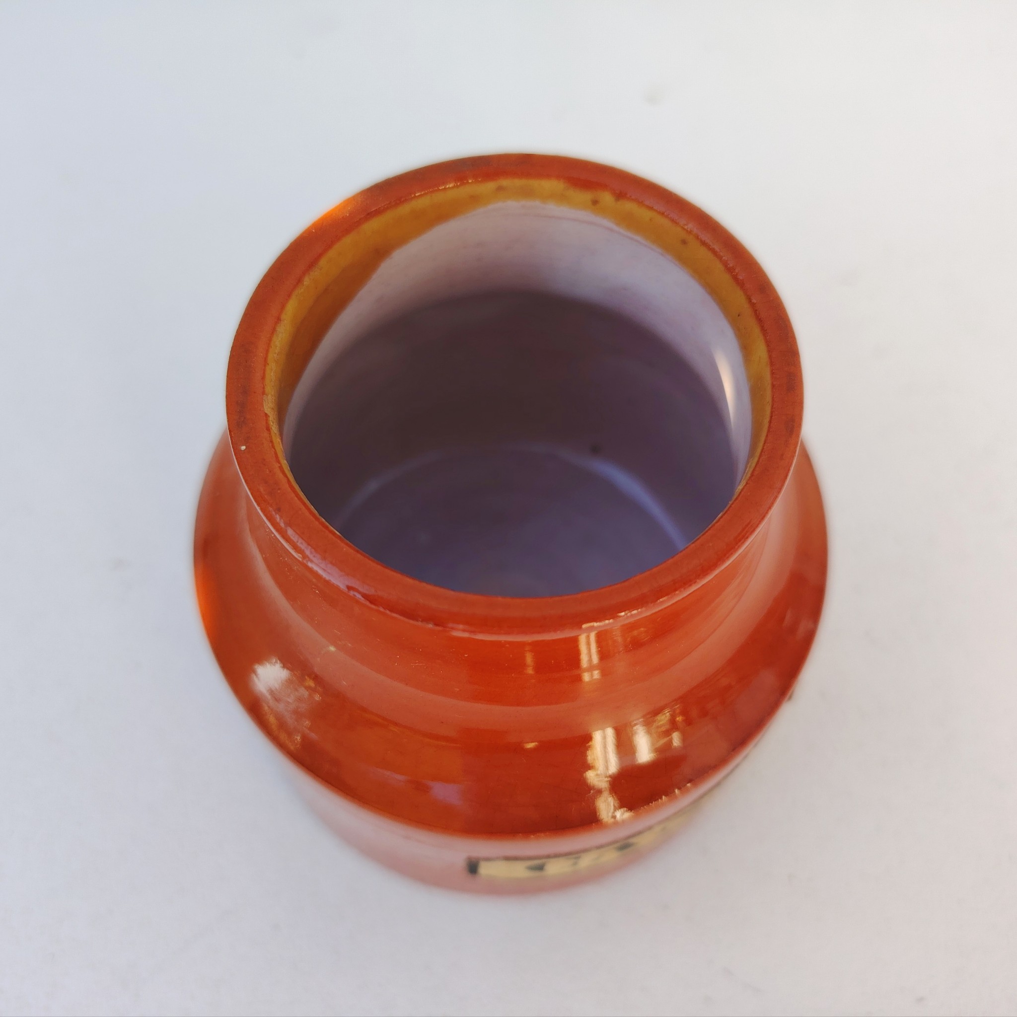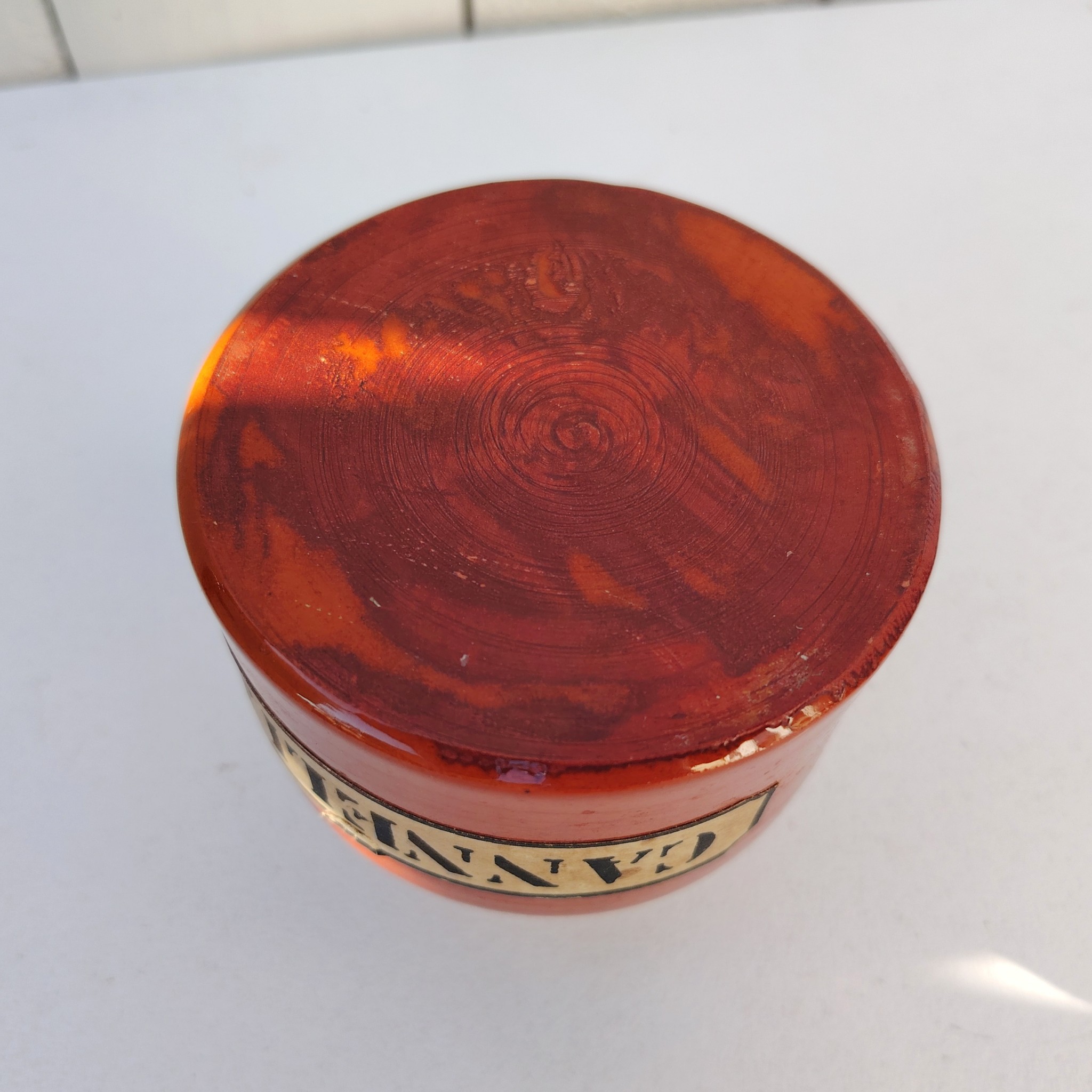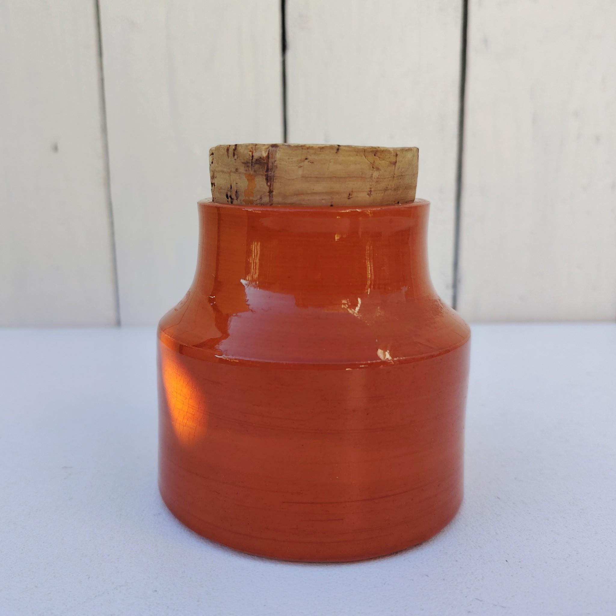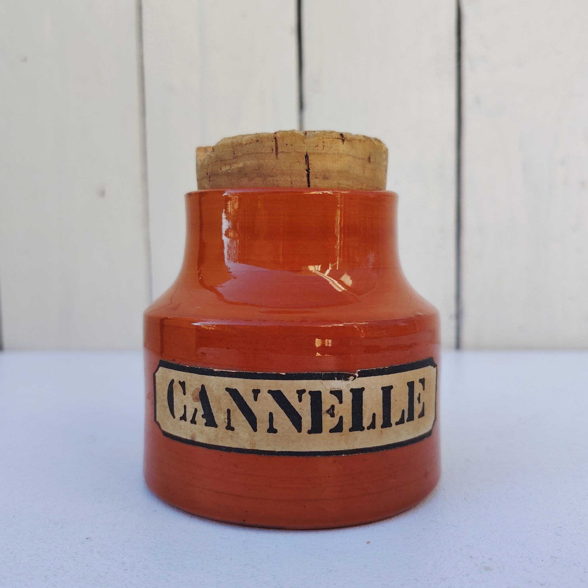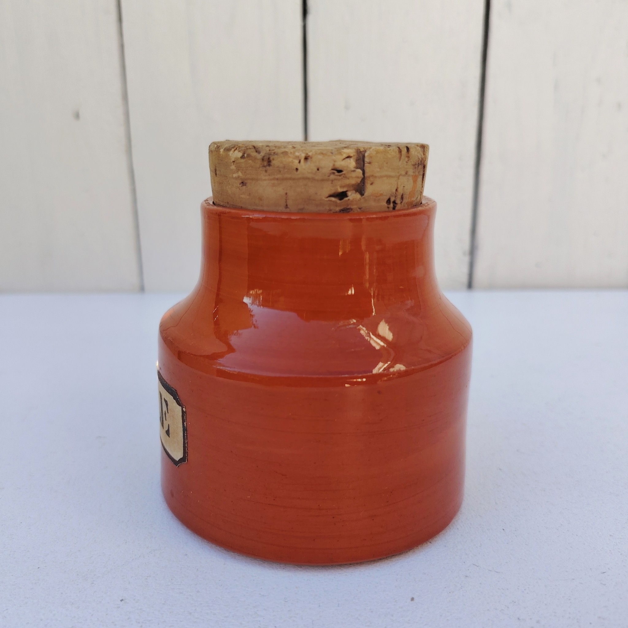 Pot en céramique par Mado Jolain , datant des années 50-60. Etiquette d’origine » Cannelle « . De couleur rouille. Un petit manque de liège sur le haut du bouchon.