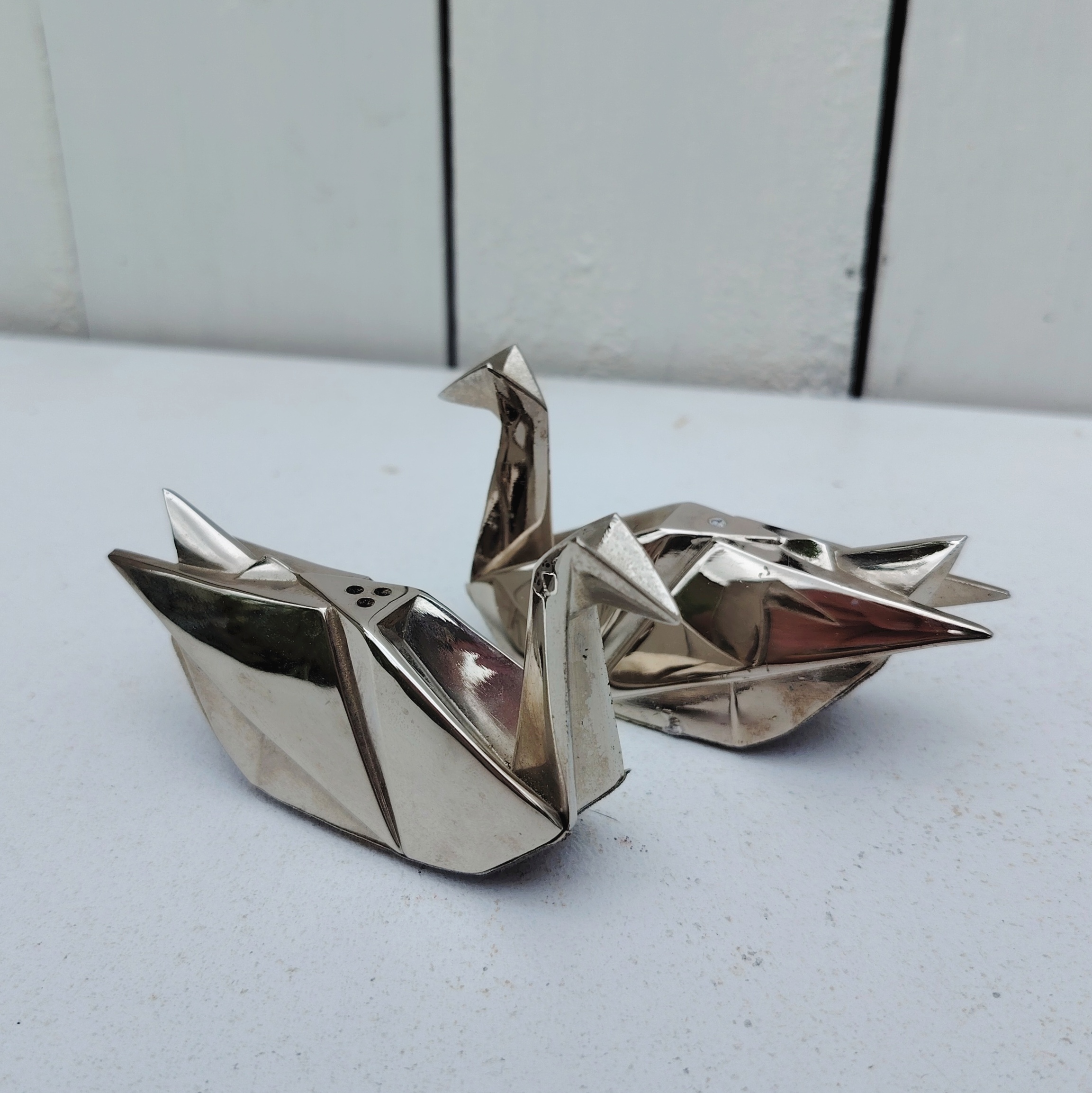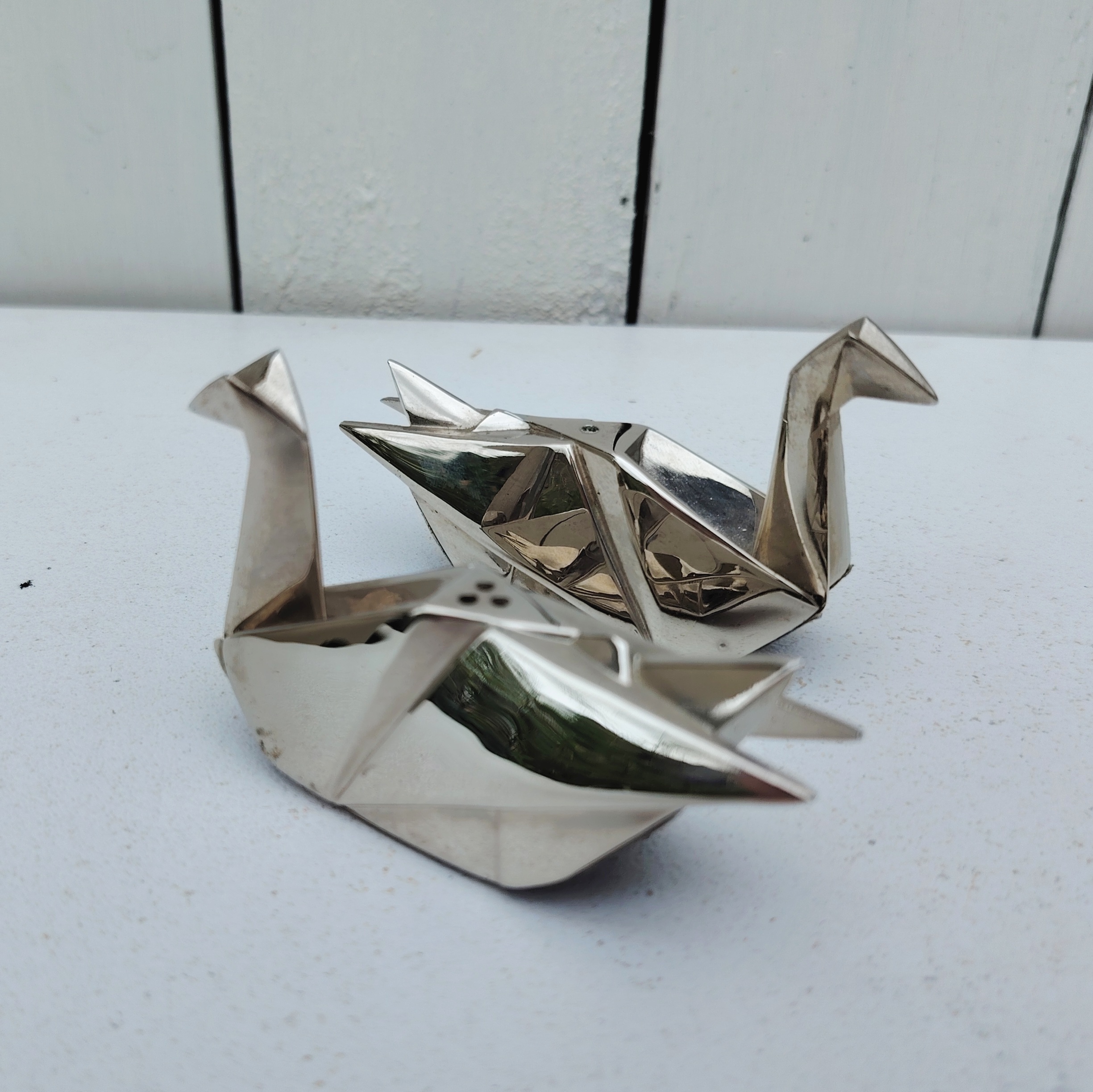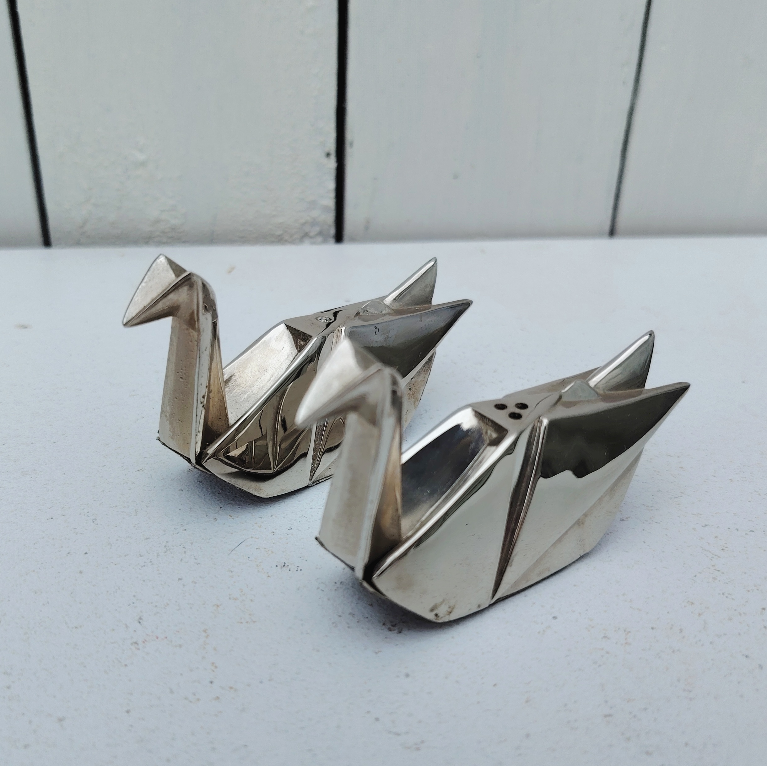 Salière et poivrière, cygnes, origami, métal argenté. Vintage.