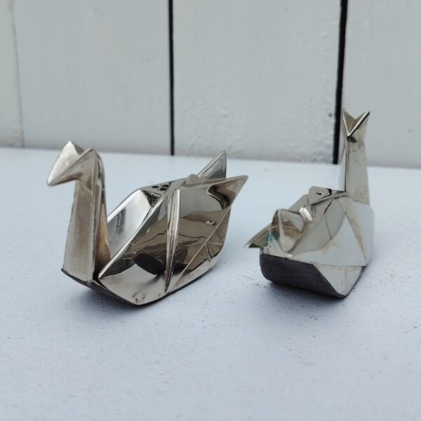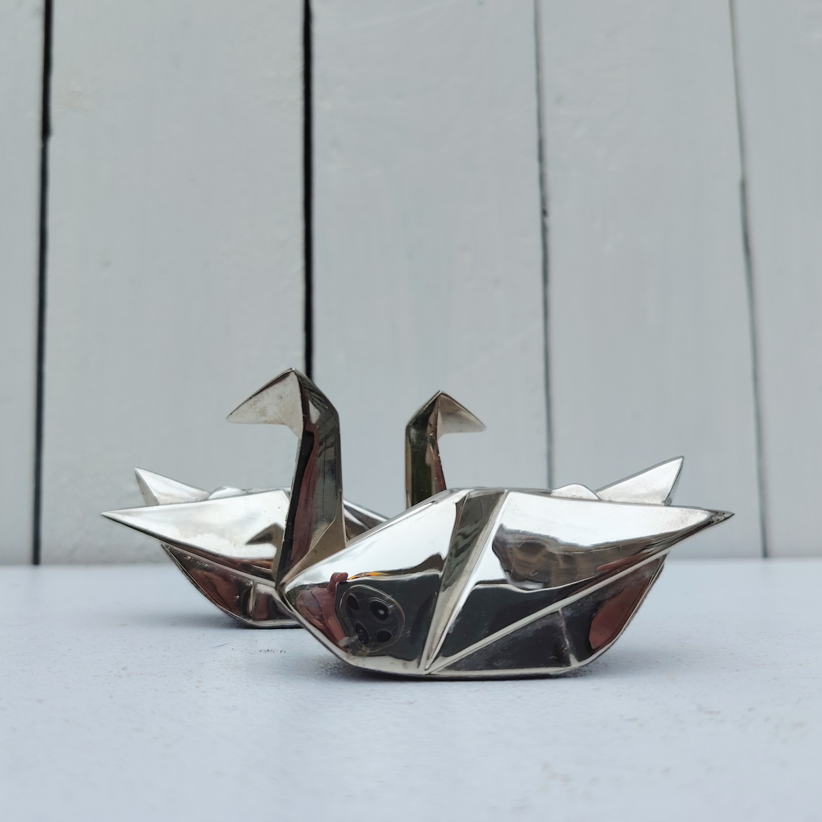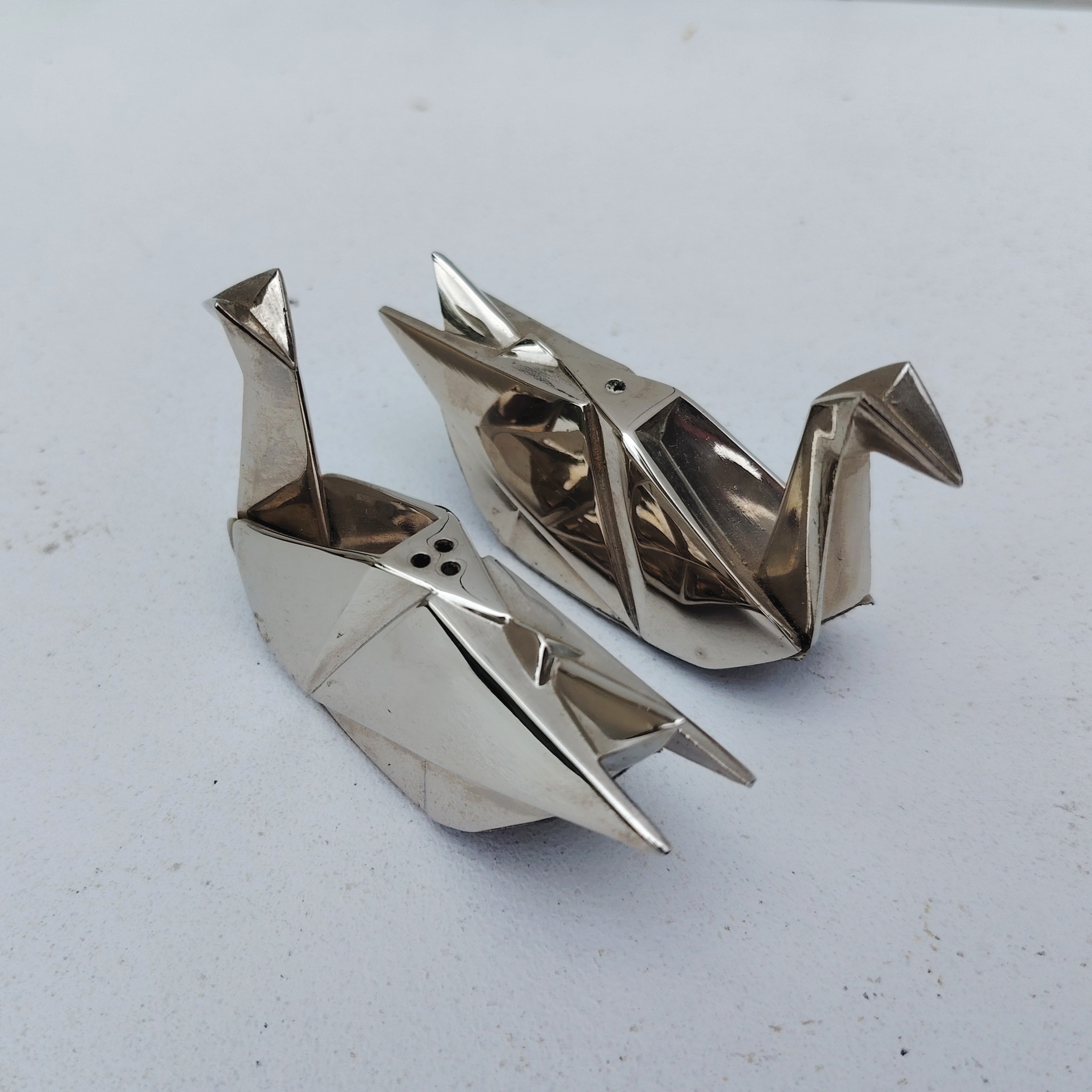 Salière et poivrière en métal argenté, à la forme de cygnes en origami.