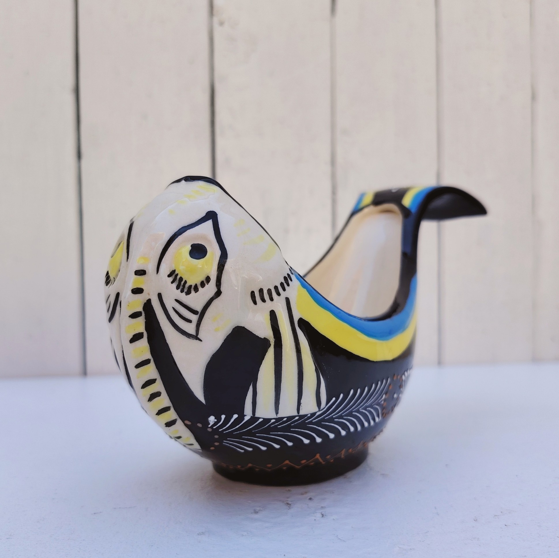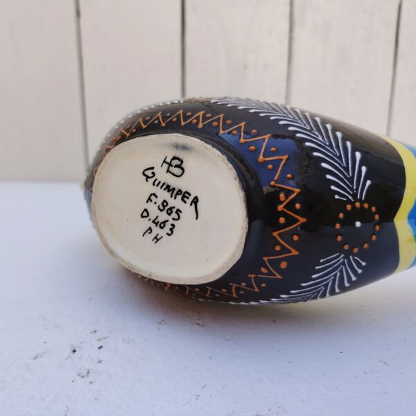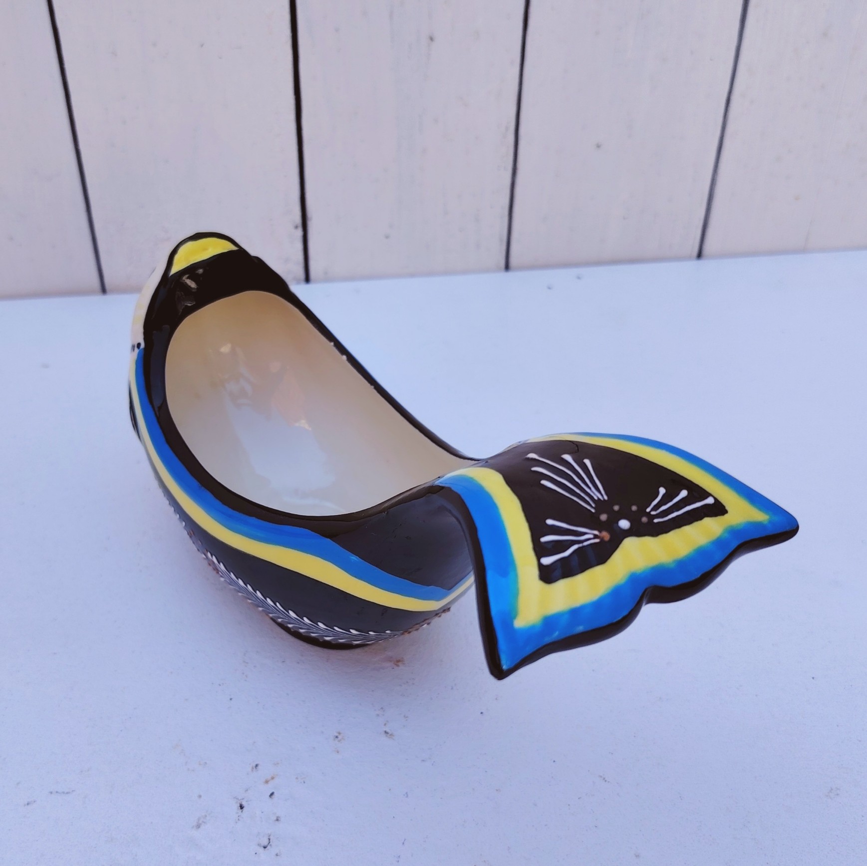 Saucière en faïence de Quimper à la forme de poisson, signée Henriot sur le dessous.