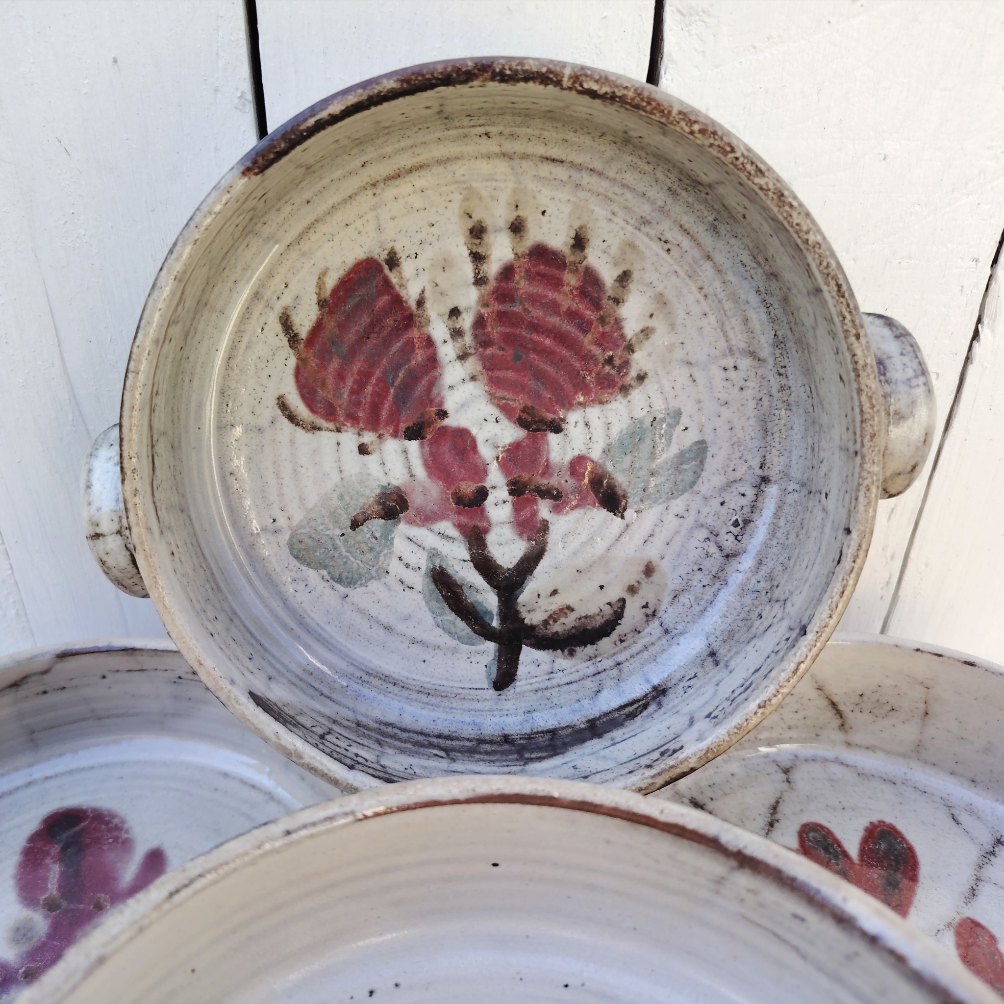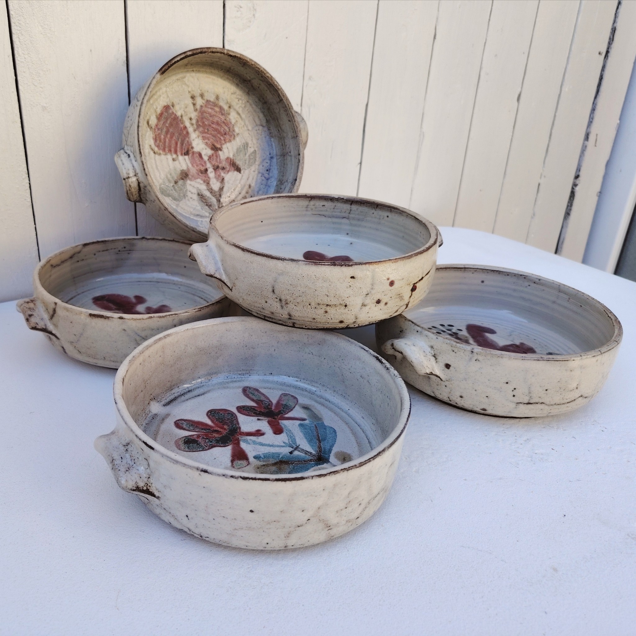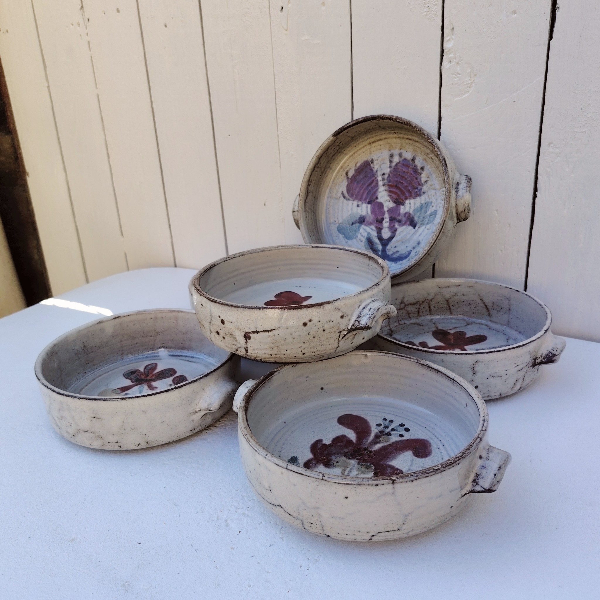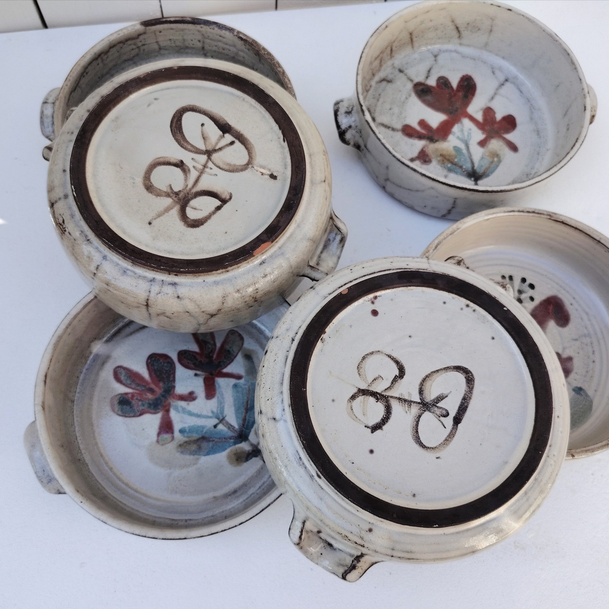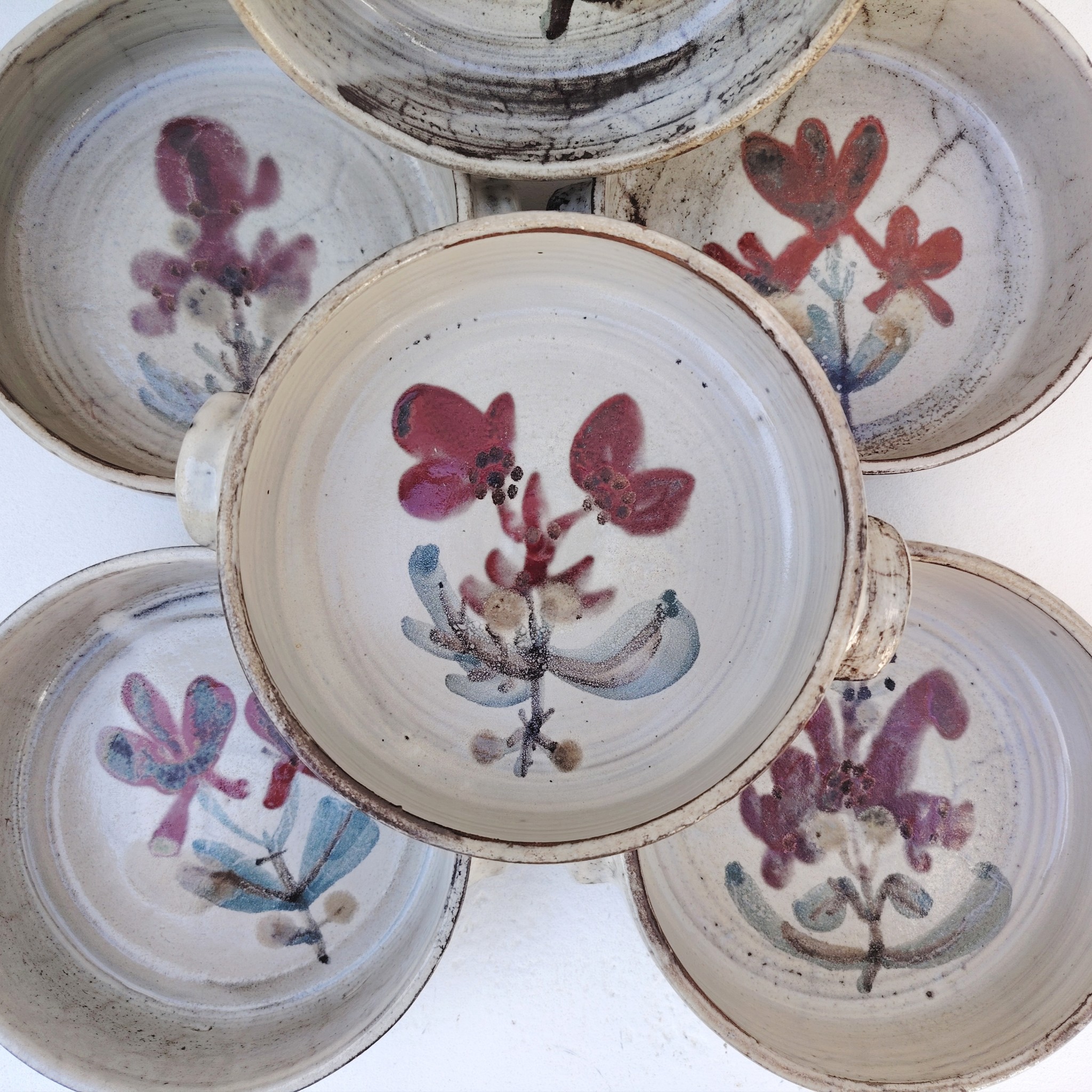 Six assiettes creuses en céramique, au décor de fleur, par Gustave Reynaud atelier le mûrier Vallauris. Elles ont toutes un décor différent et façonnées différemment. Des petits défauts de cuisson sans gravité. Deux poignées sur les cotés . Un petit éclat sur le rebord d’une assiette.