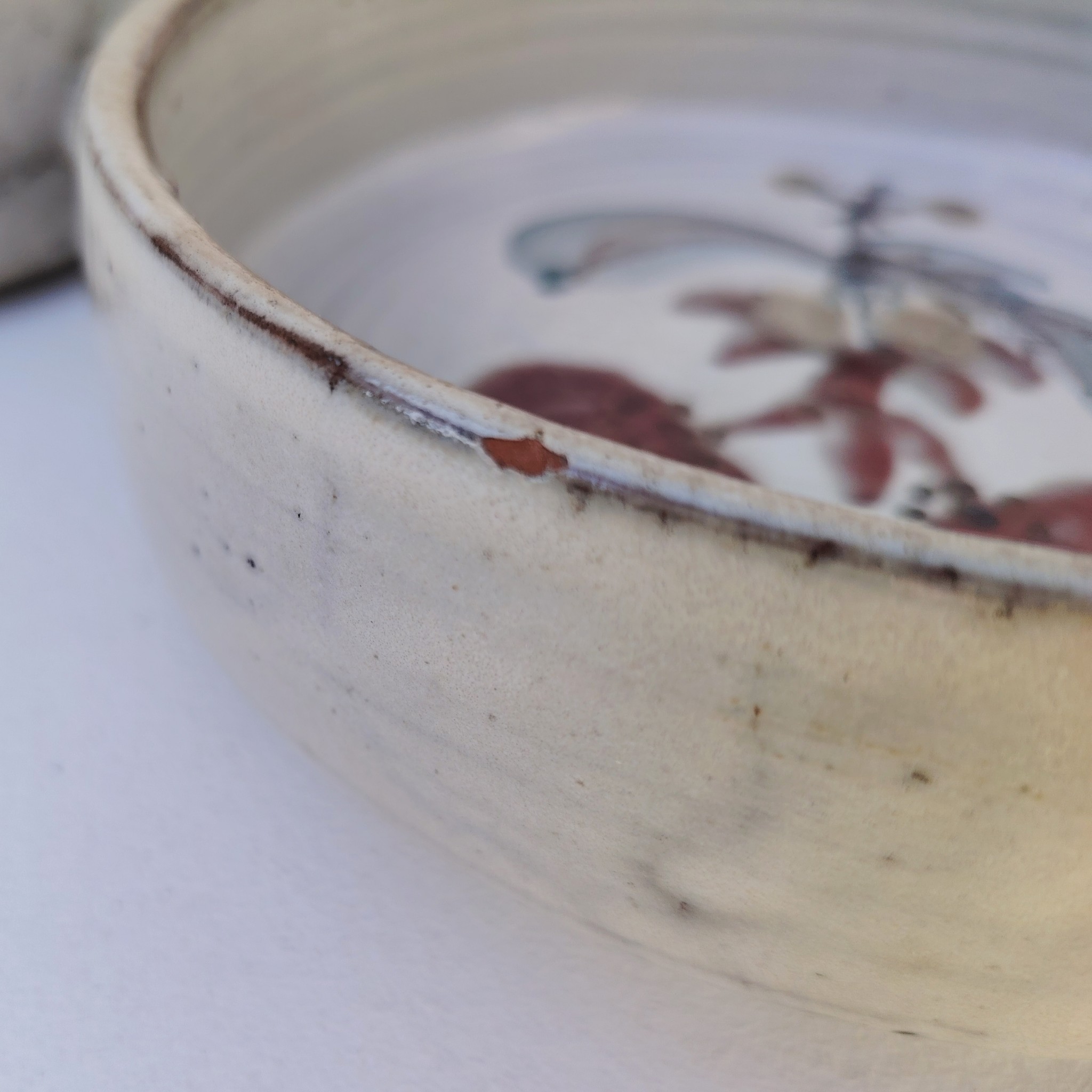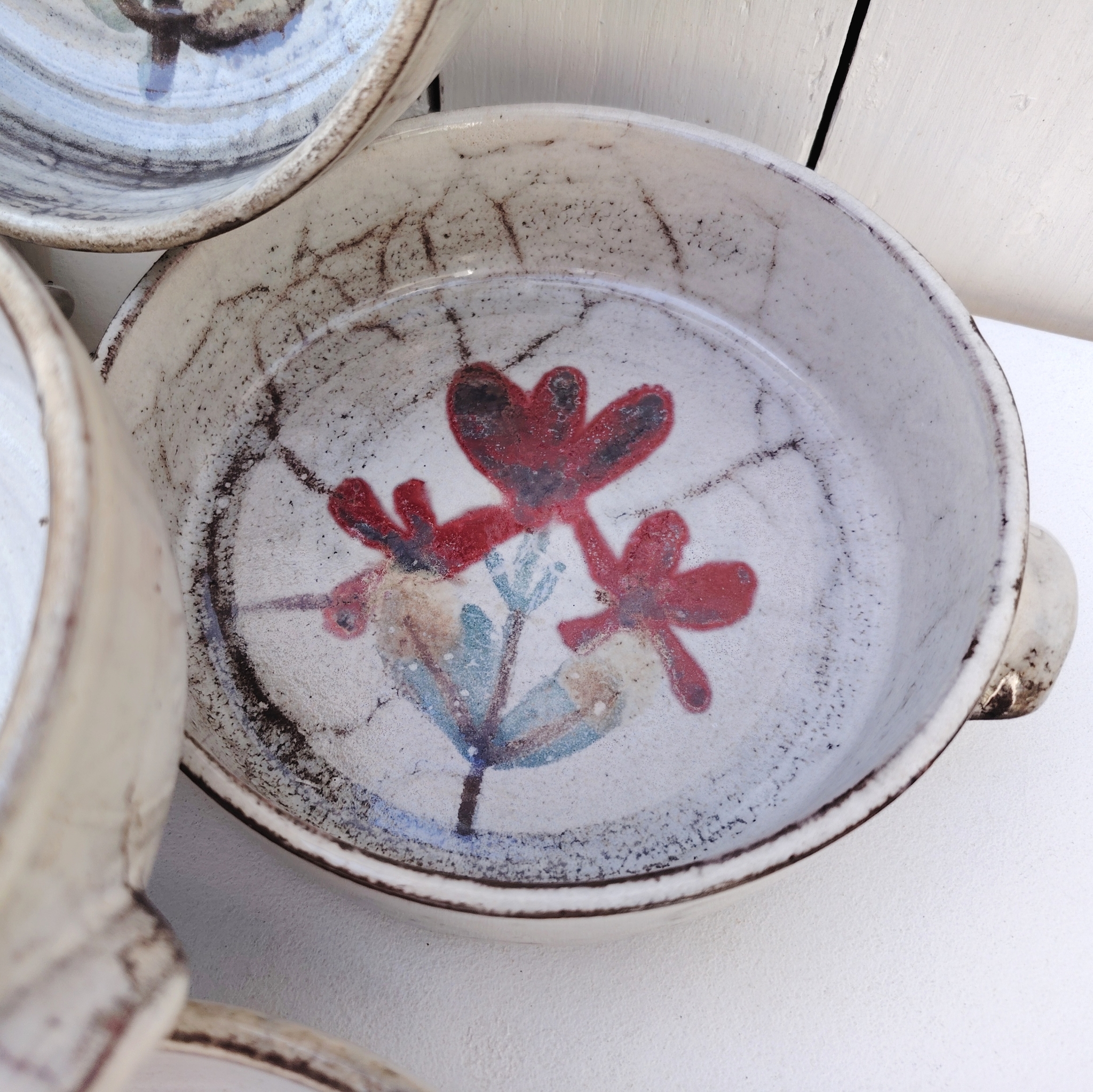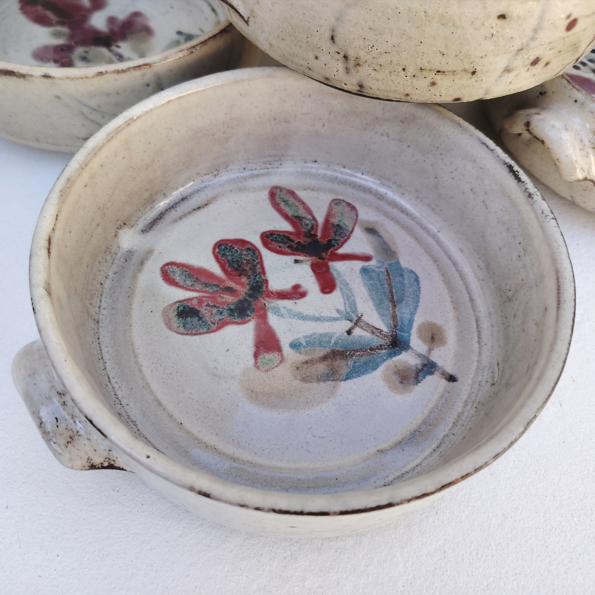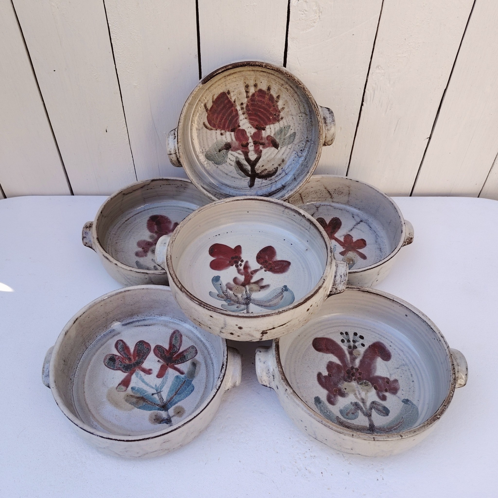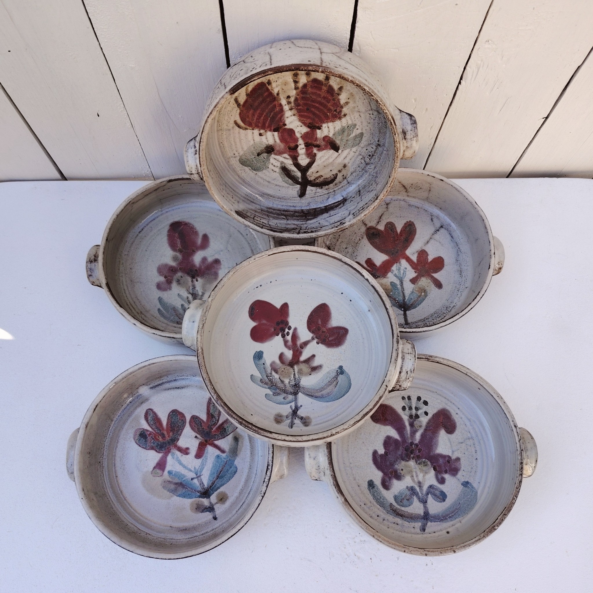 Six assiettes creuses en céramique, au décor de fleur, par Gustave Reynaud atelier le mûrier Vallauris. Elles ont toutes un décor différent et façonnées différemment. Des petits défauts de cuisson sans gravité. Deux poignées sur les cotés . Un petit éclat sur le rebord d’une assiette.