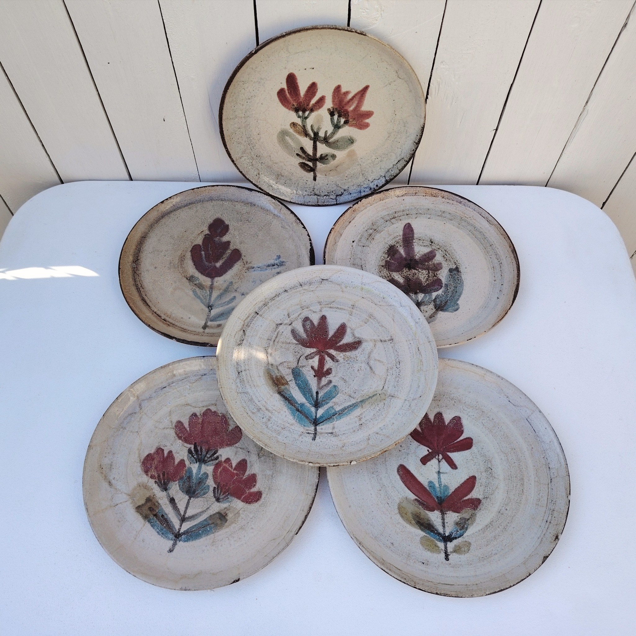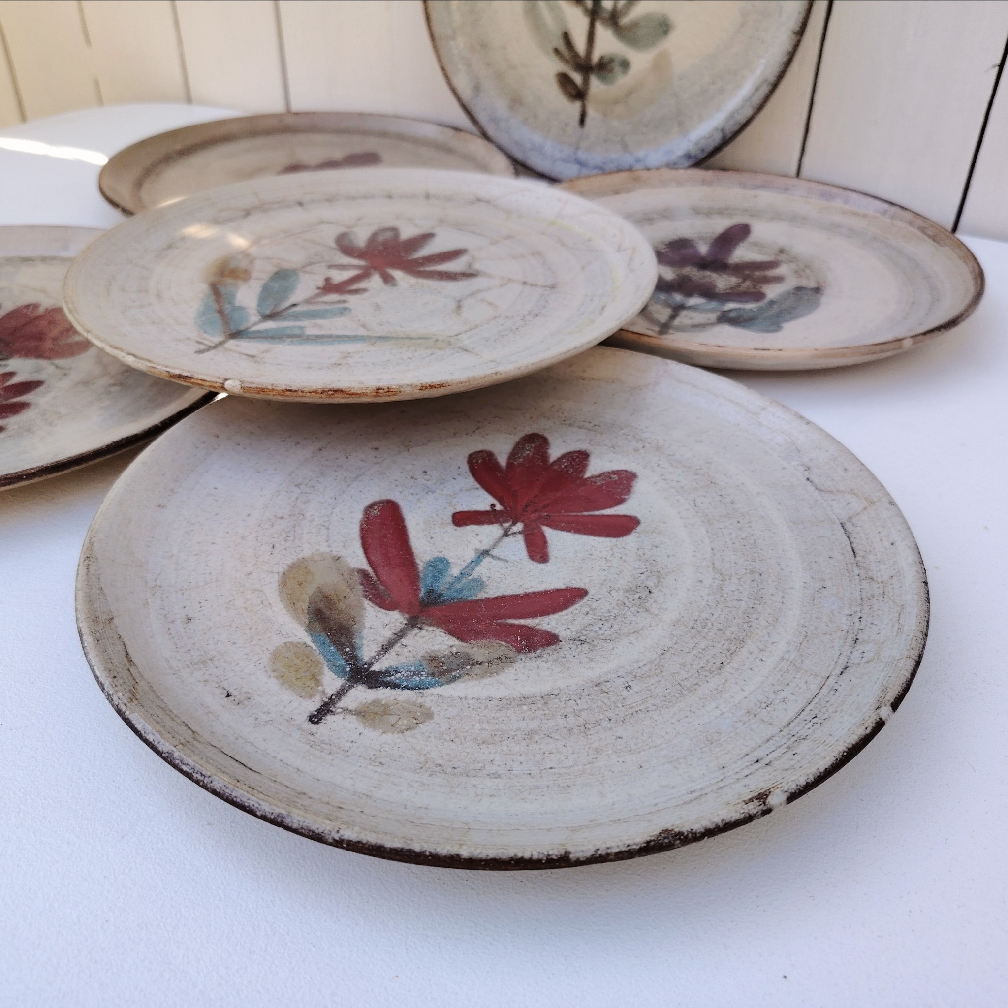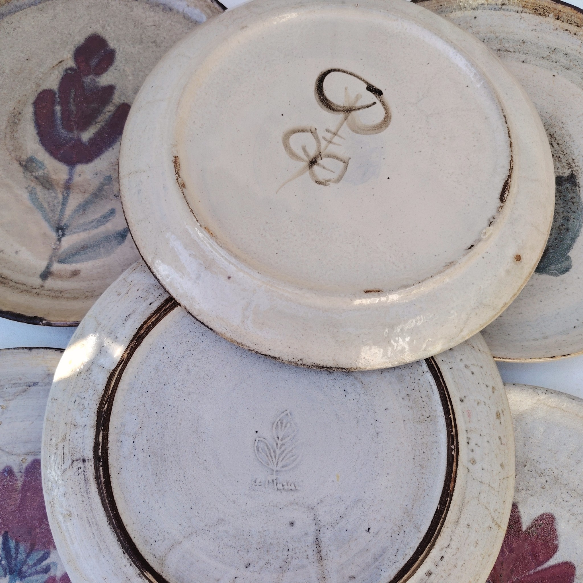 Six assiettes  plates en céramique, au décor de fleur, par Gustave Reynaud atelier le mûrier Vallauris. Elles ont toutes un décor différent et façonnées différemment. Des petits défauts de cuisson sans gravité