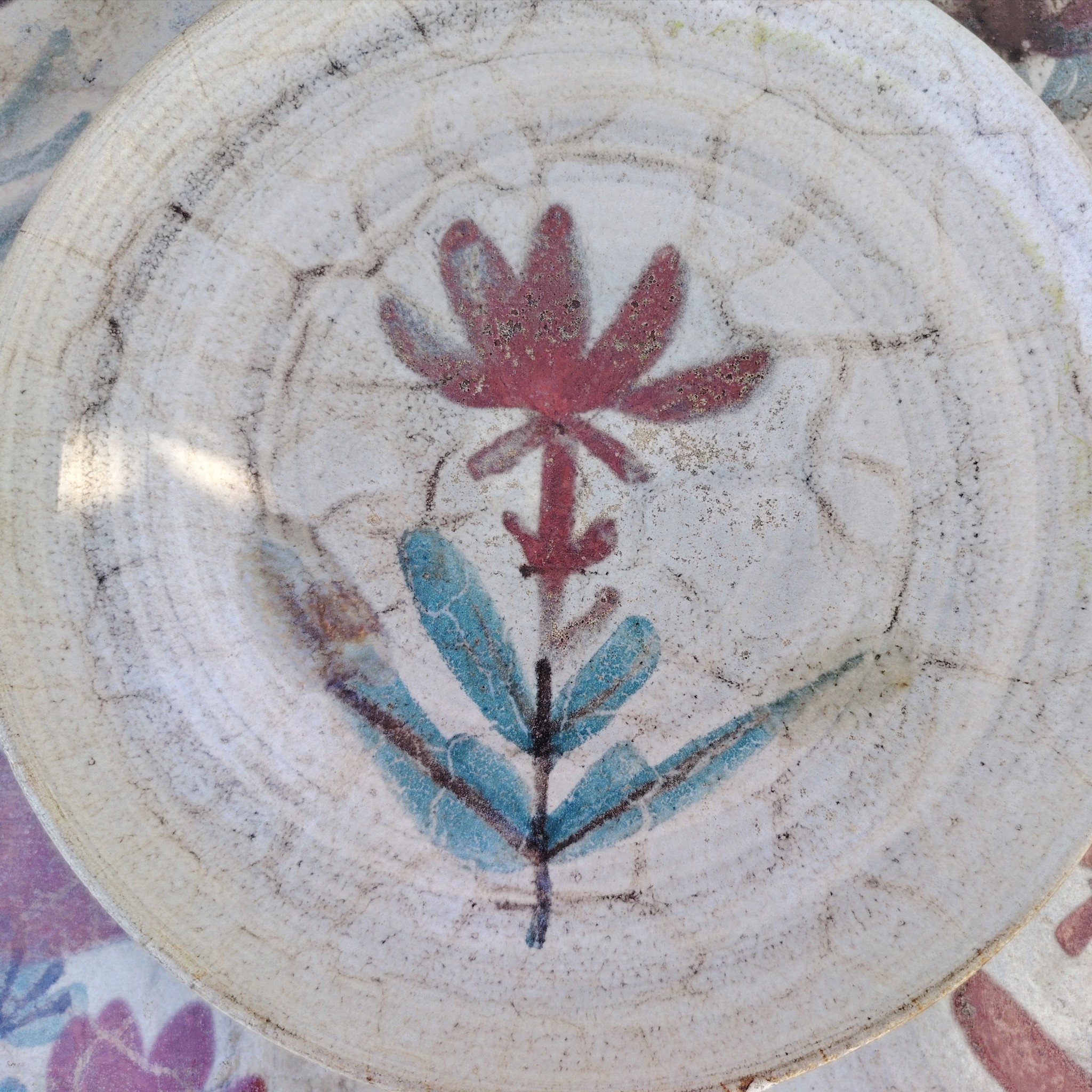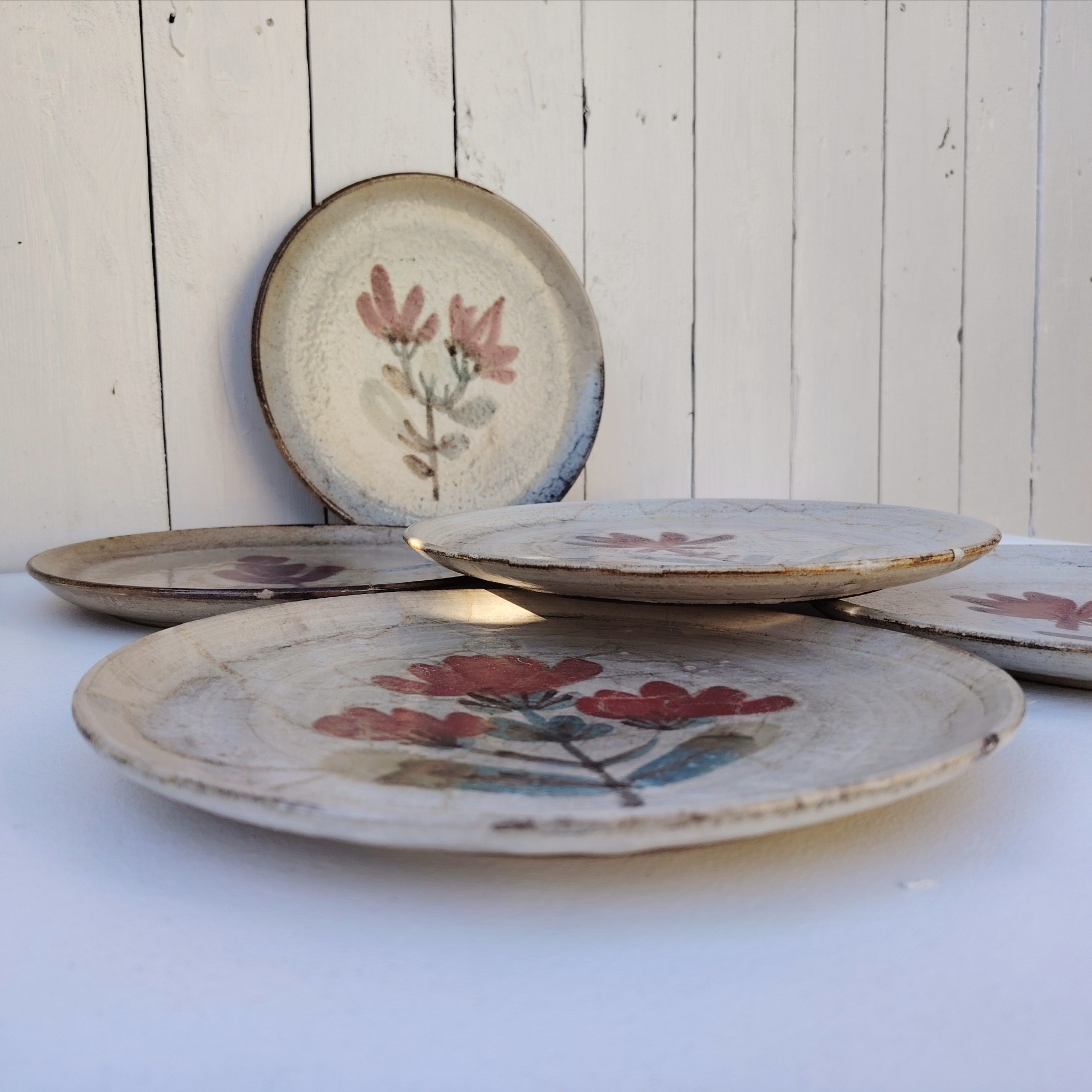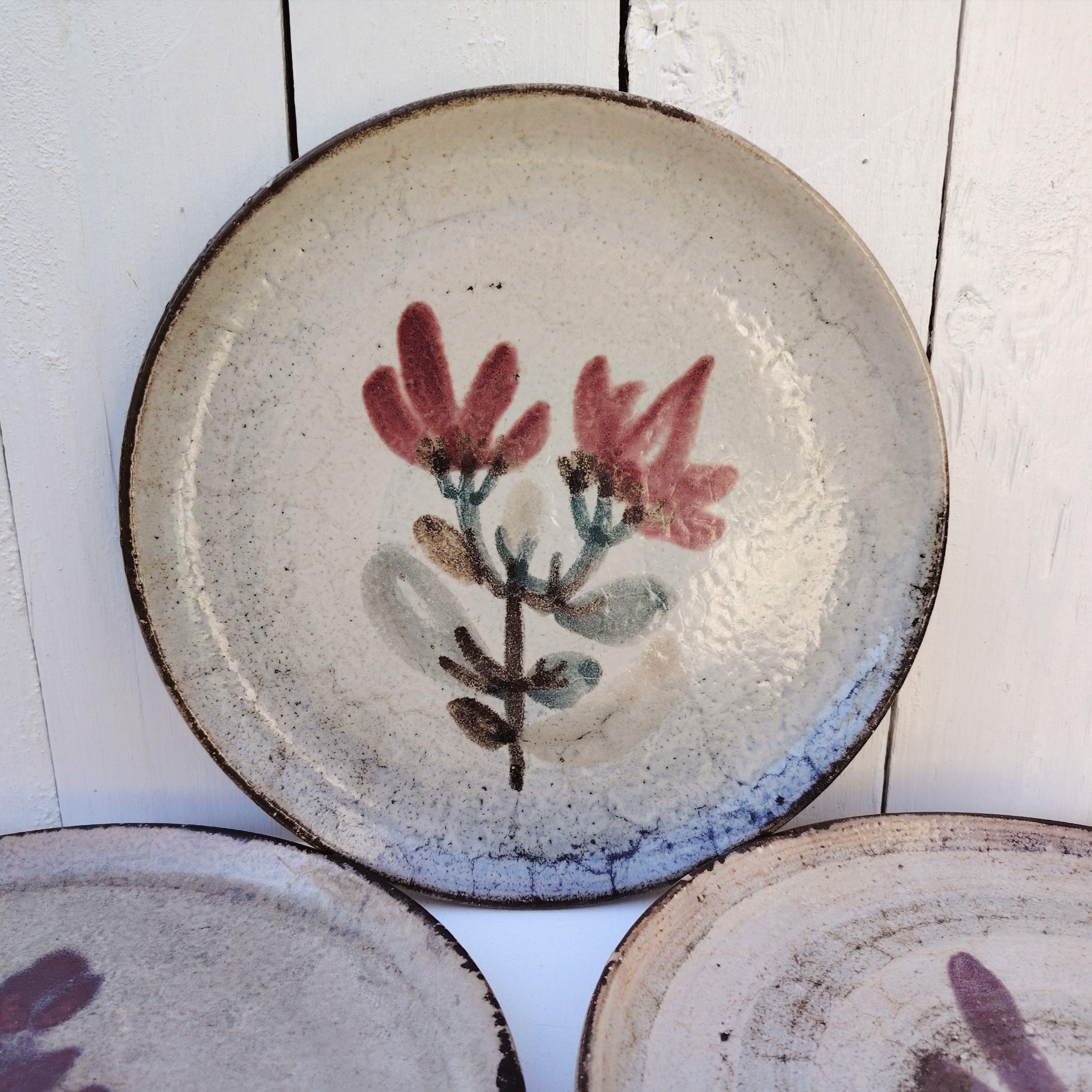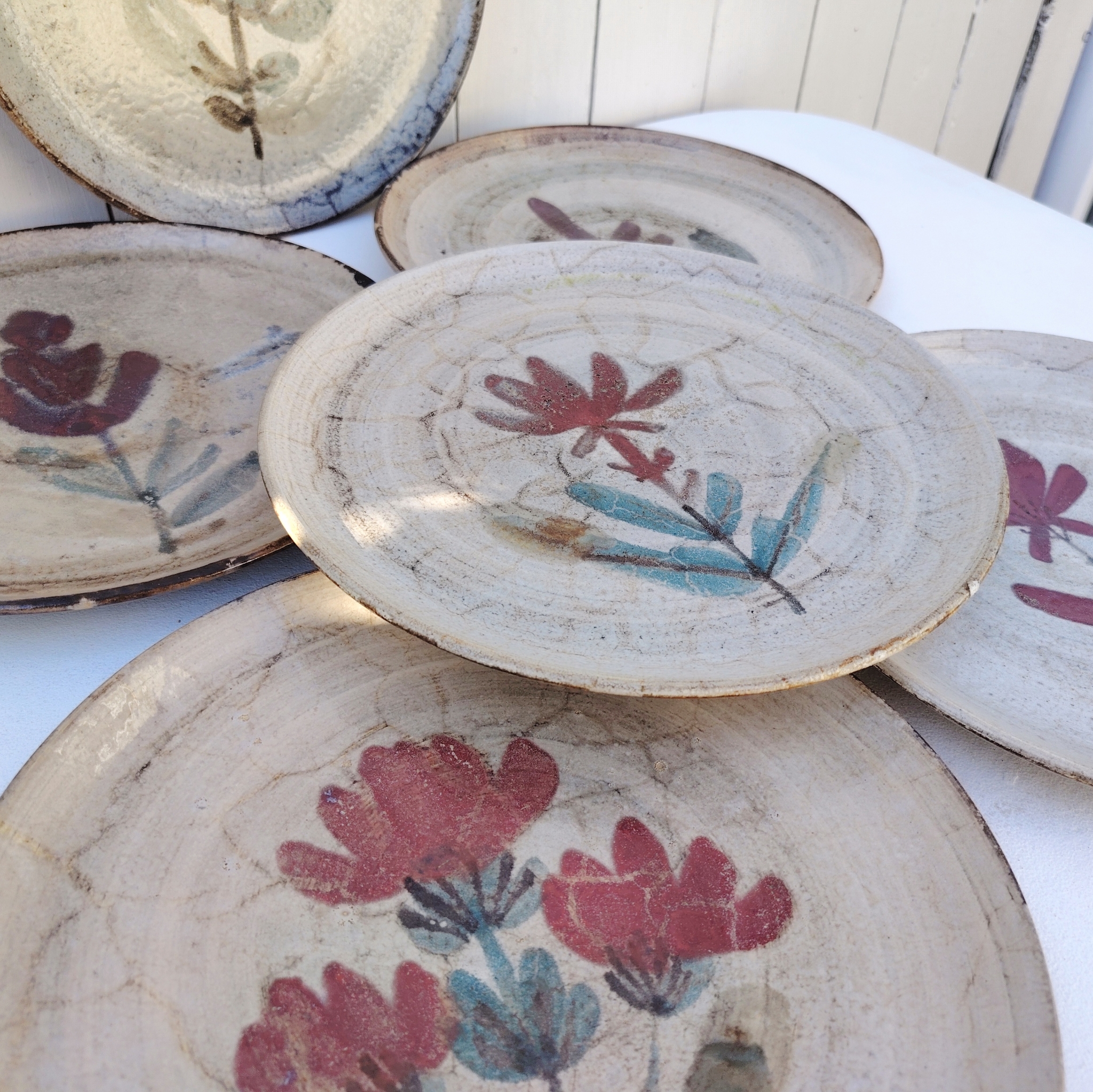 Six assiettes  plates en céramique, au décor de fleur, par Gustave Reynaud atelier le mûrier Vallauris. Elles ont toutes un décor différent et façonnées différemment. Des petits défauts de cuisson sans gravité