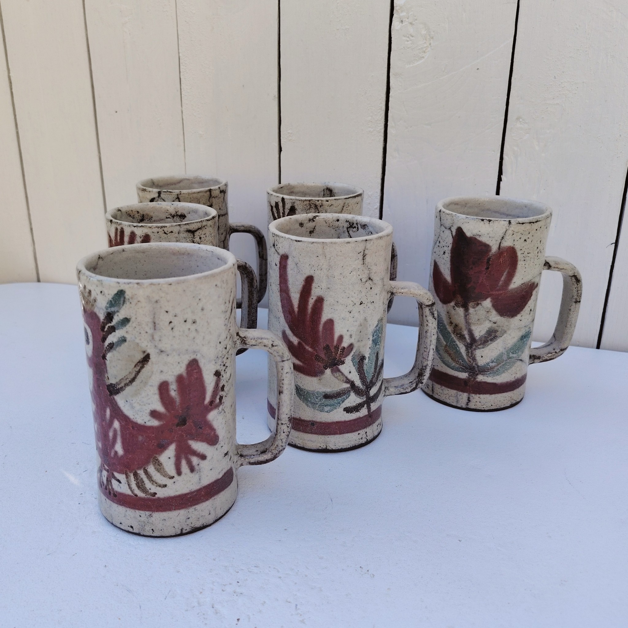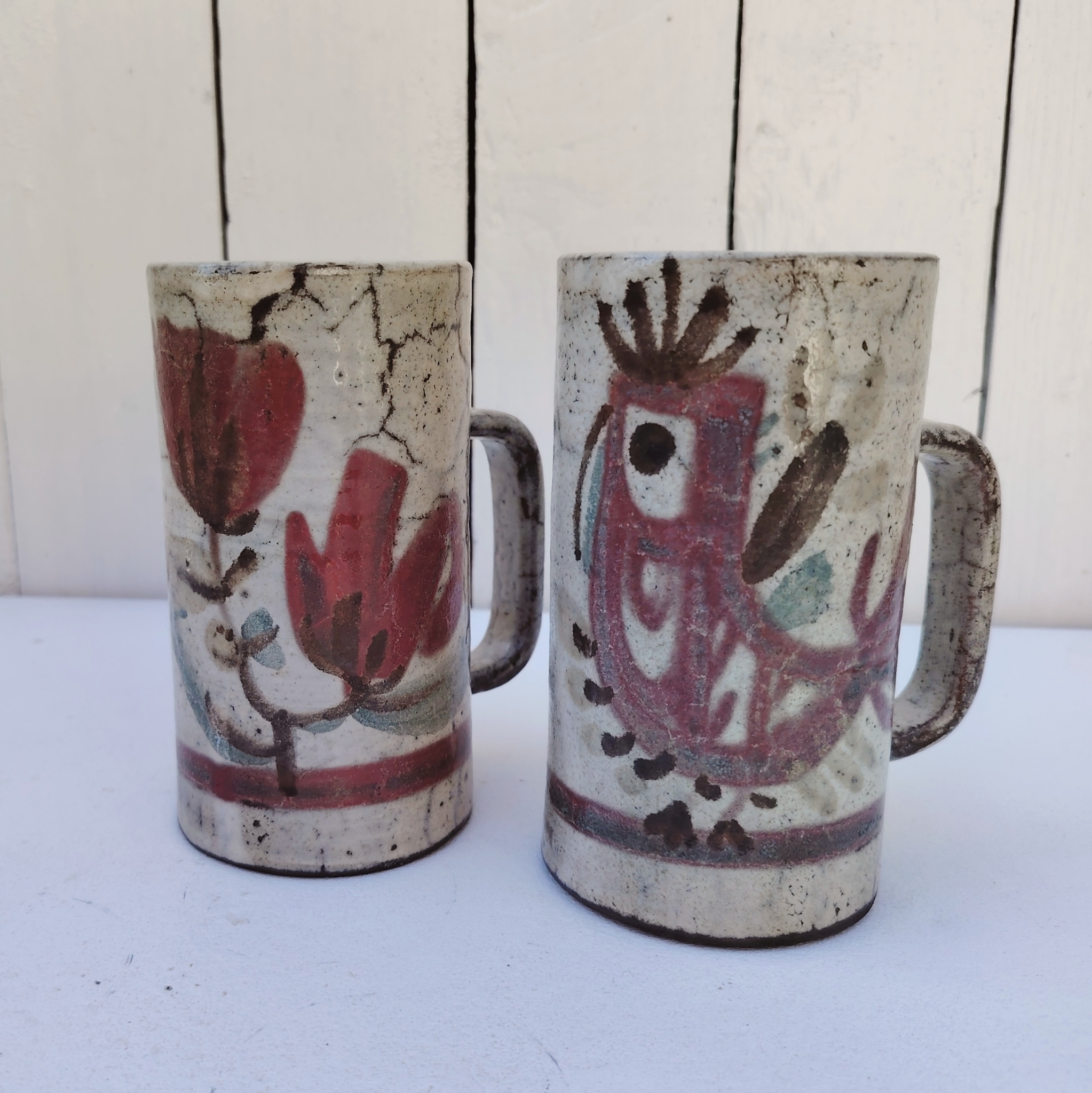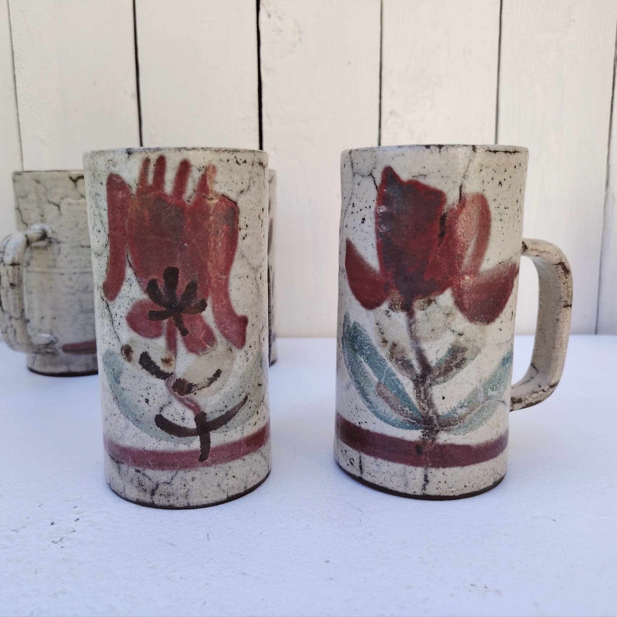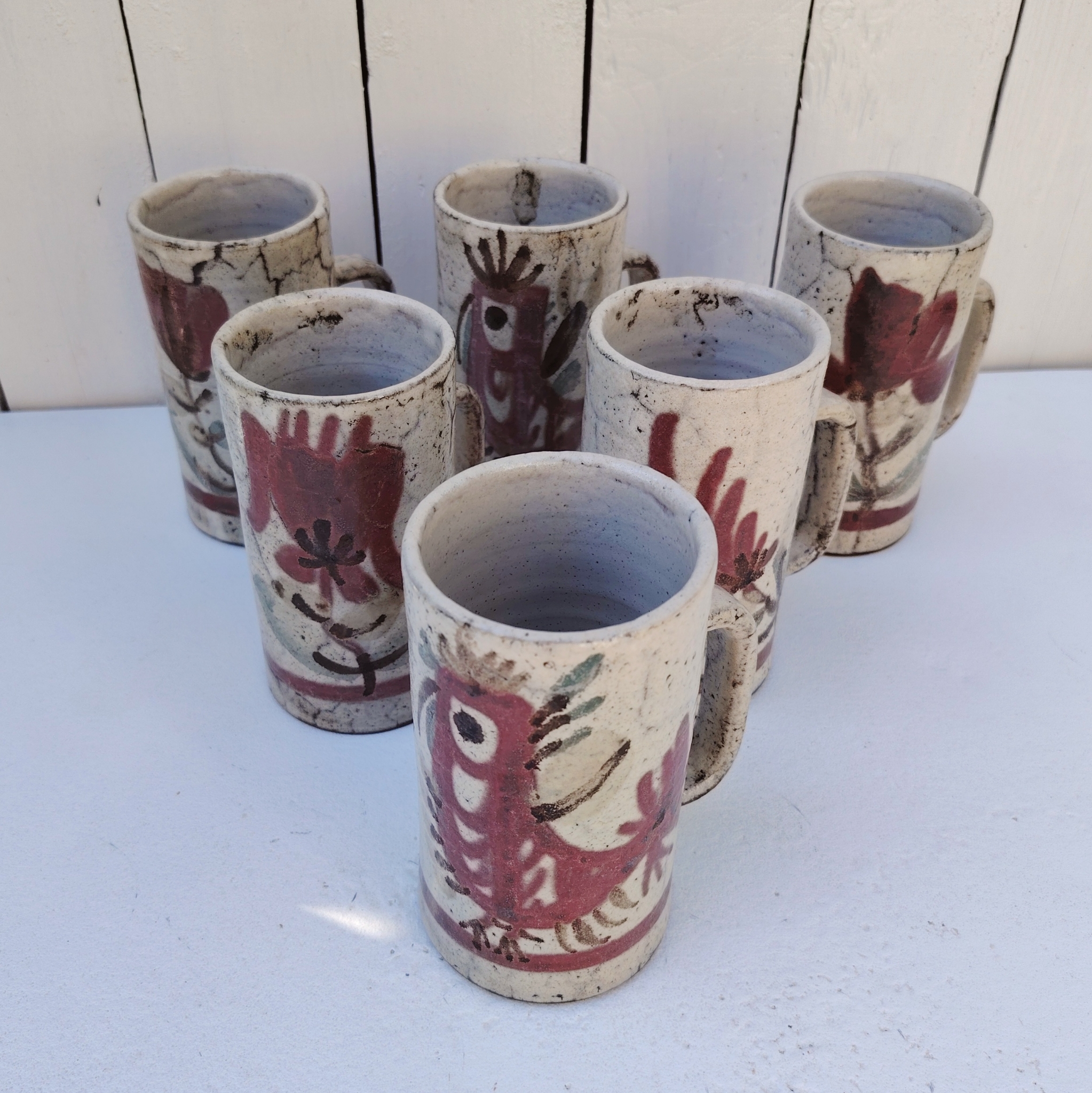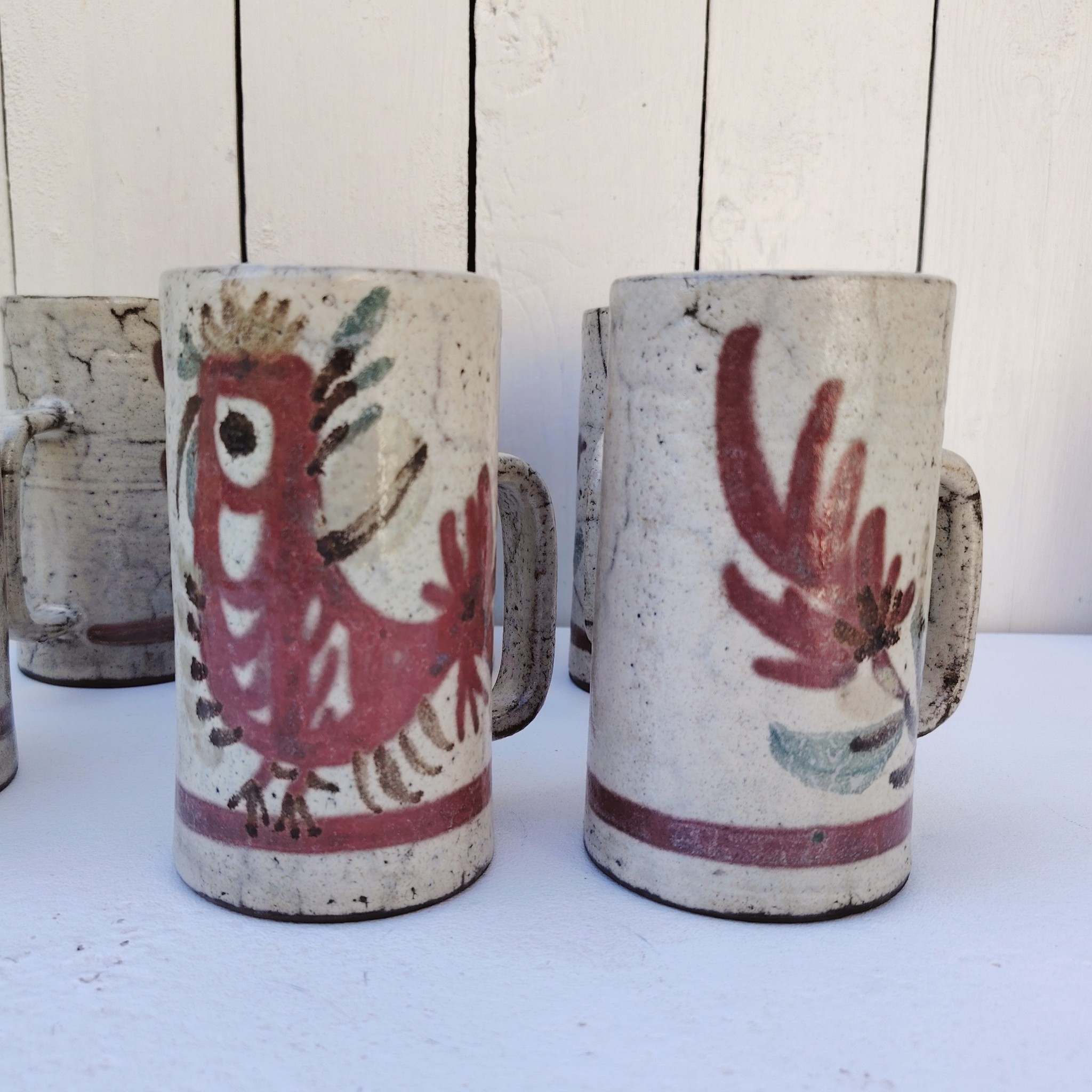 Six mugs dont deux à l’oiseau et quatre à décor de fleurs en céramique, par Gustave Reynaud pour le mûrier à Vallauris.