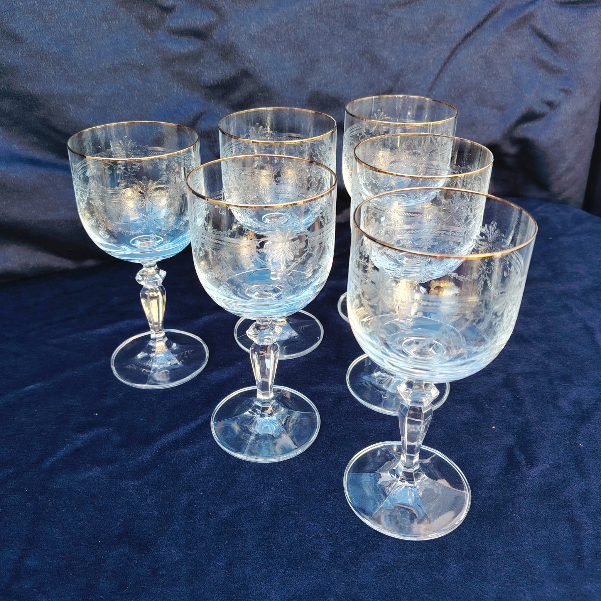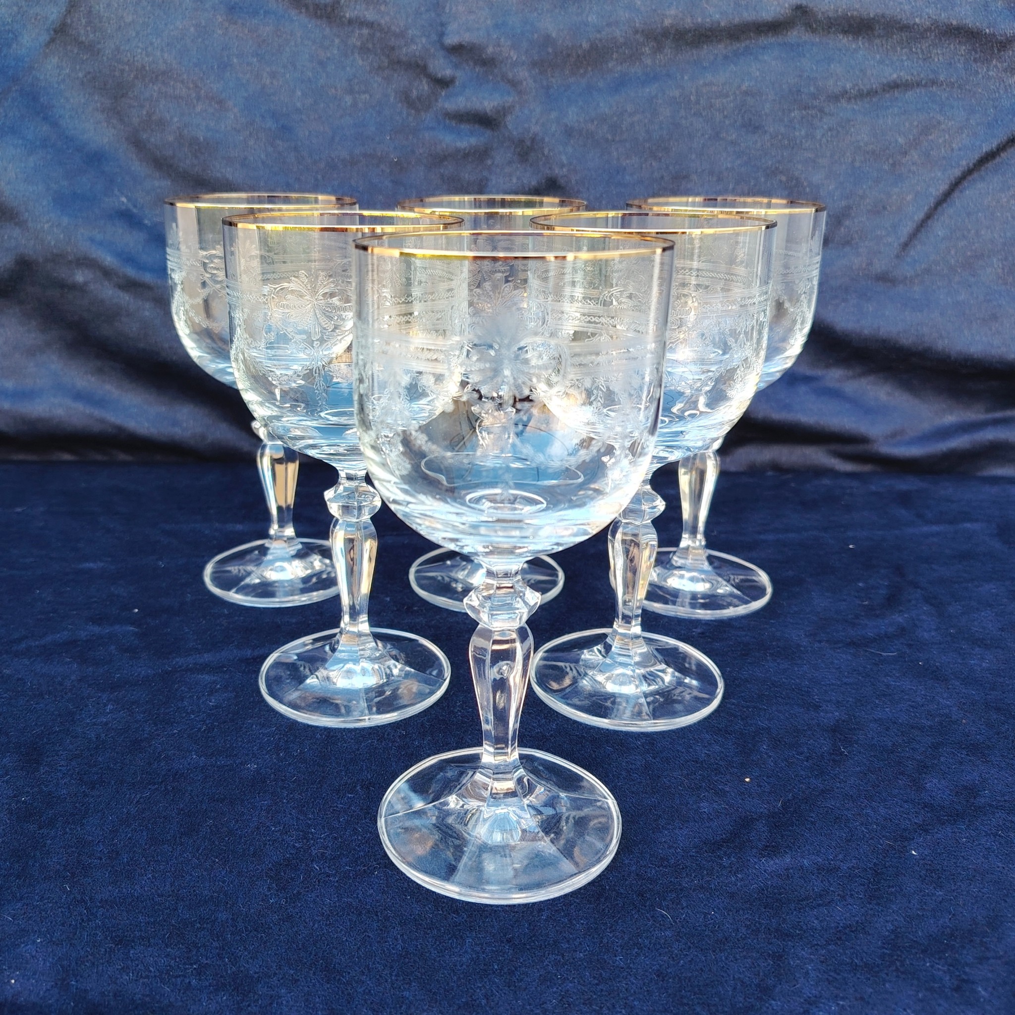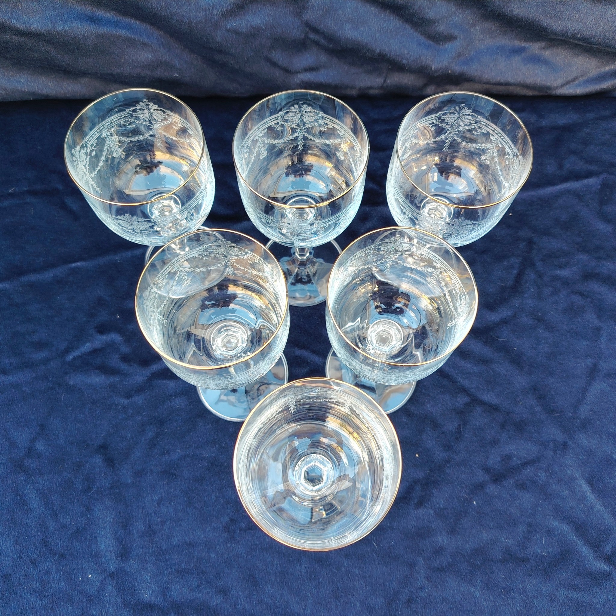 Six verres à eau, cristal ciselé, liseré or, vintage