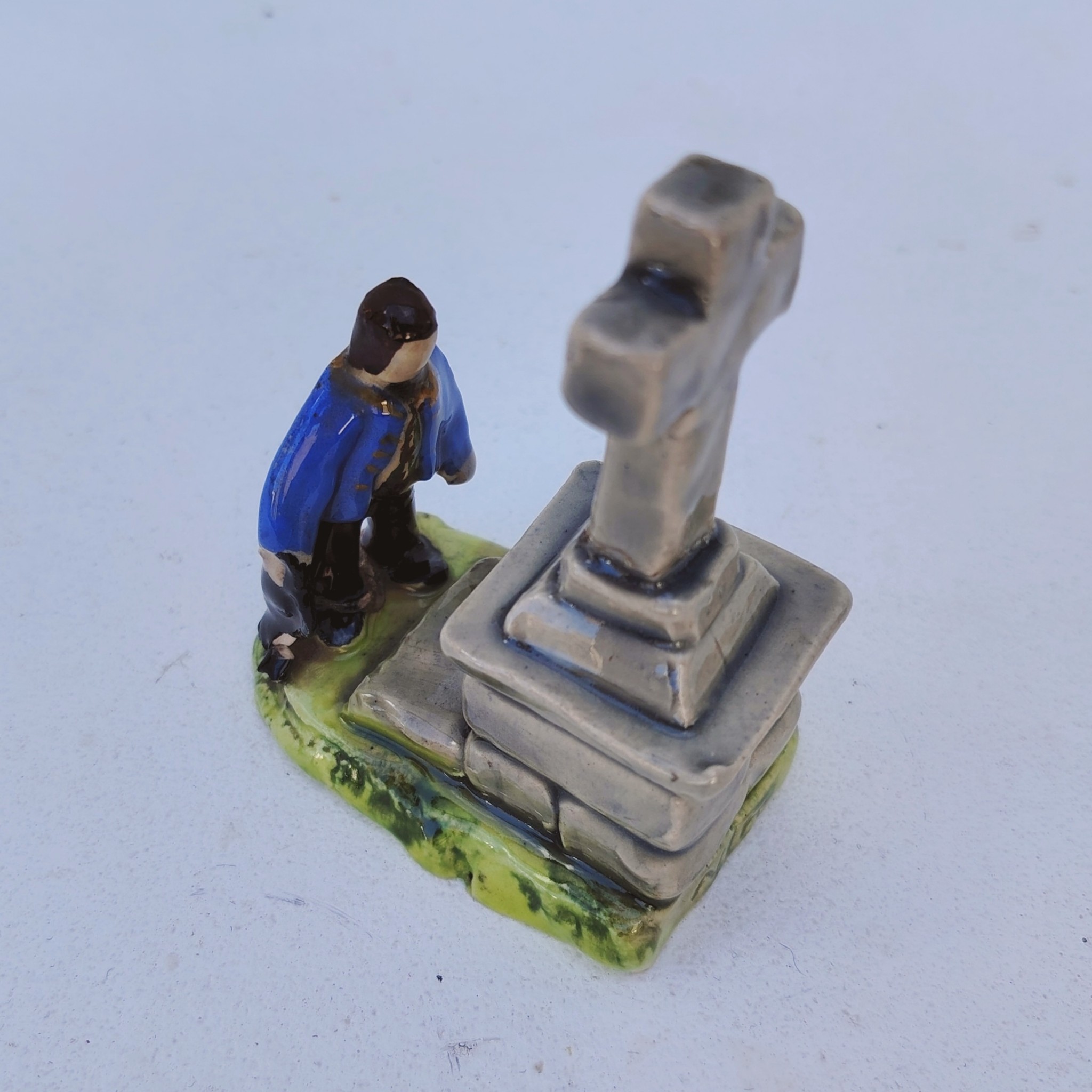 Sujet en céramique de Quimper représentant un breton devant un calvaire, signé Nik.