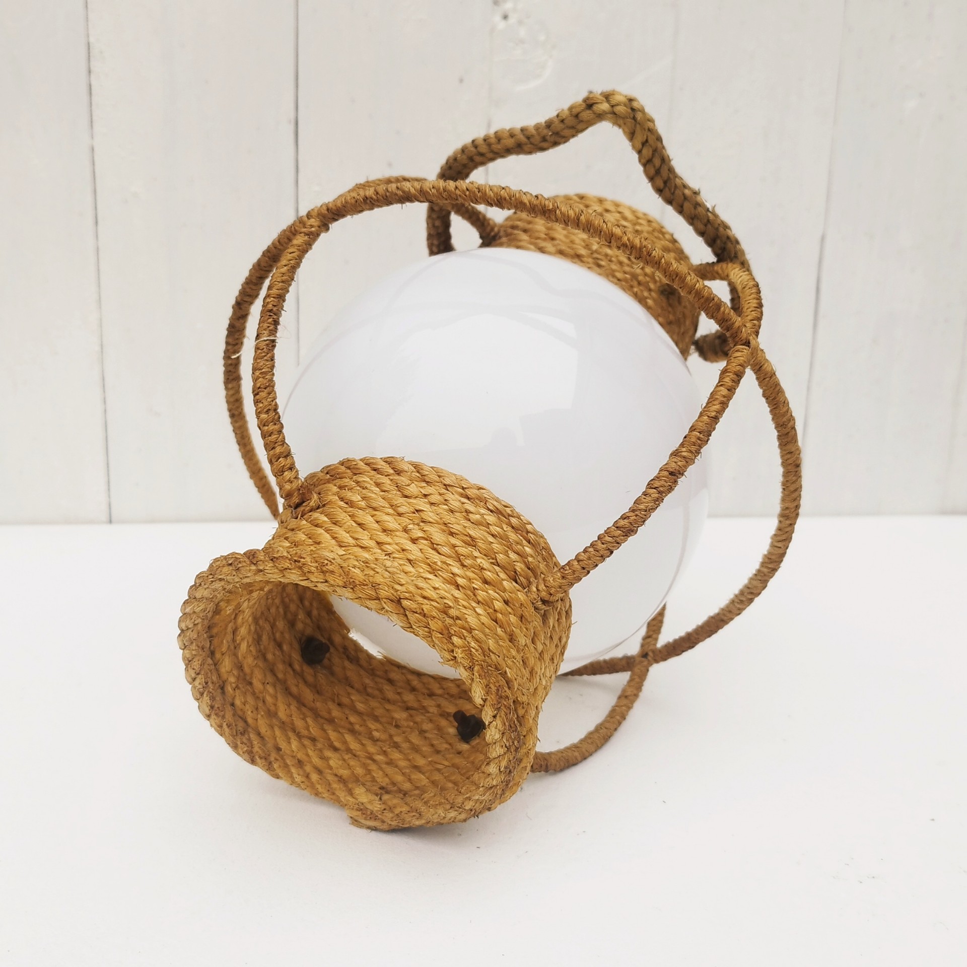 Suspension datant des années 50, à la forme d’une lanterne/lampe tempête créée par Audoux Minet. Structure en fil d’acier et métal recouvert de cordage tressé. Globe en opaline blanche.