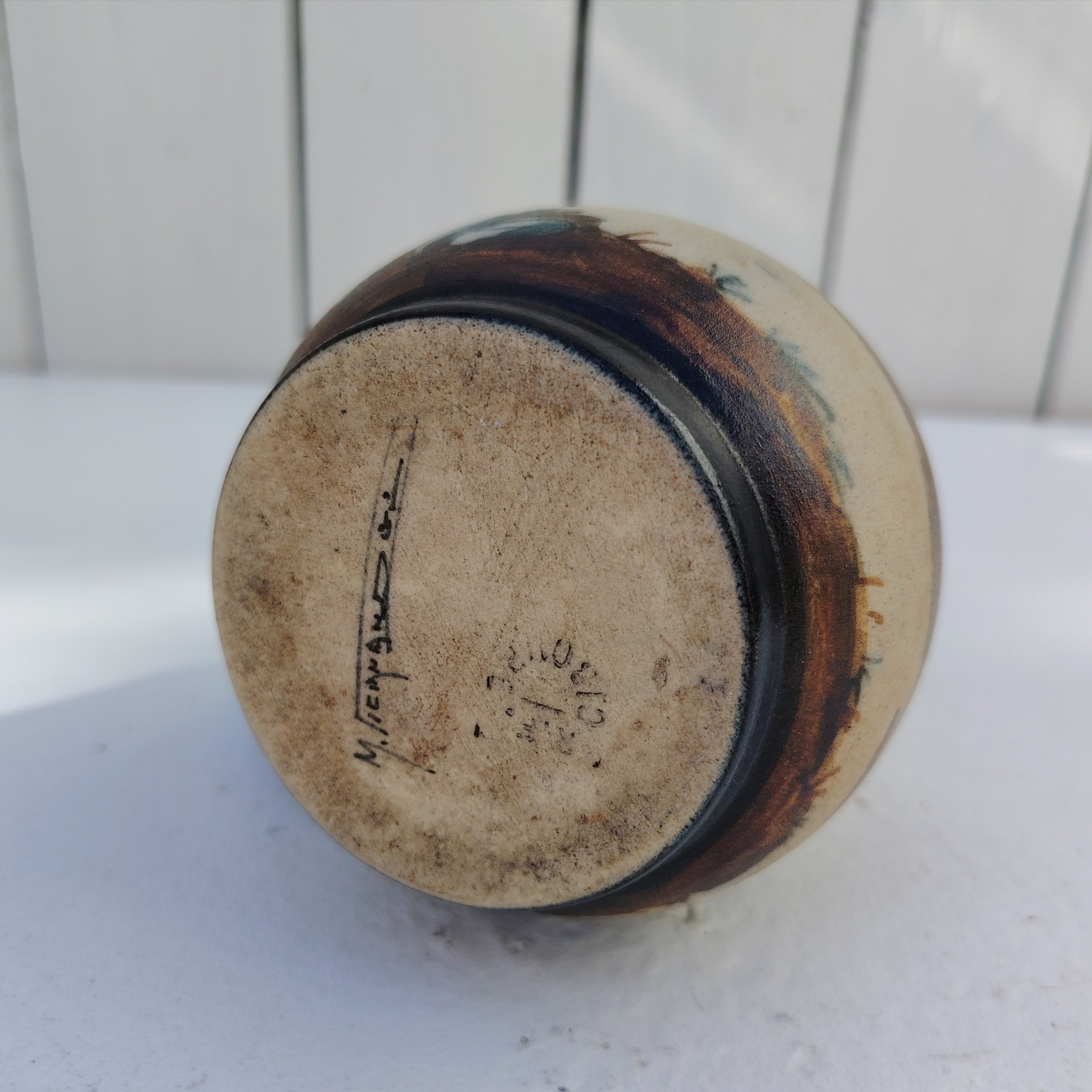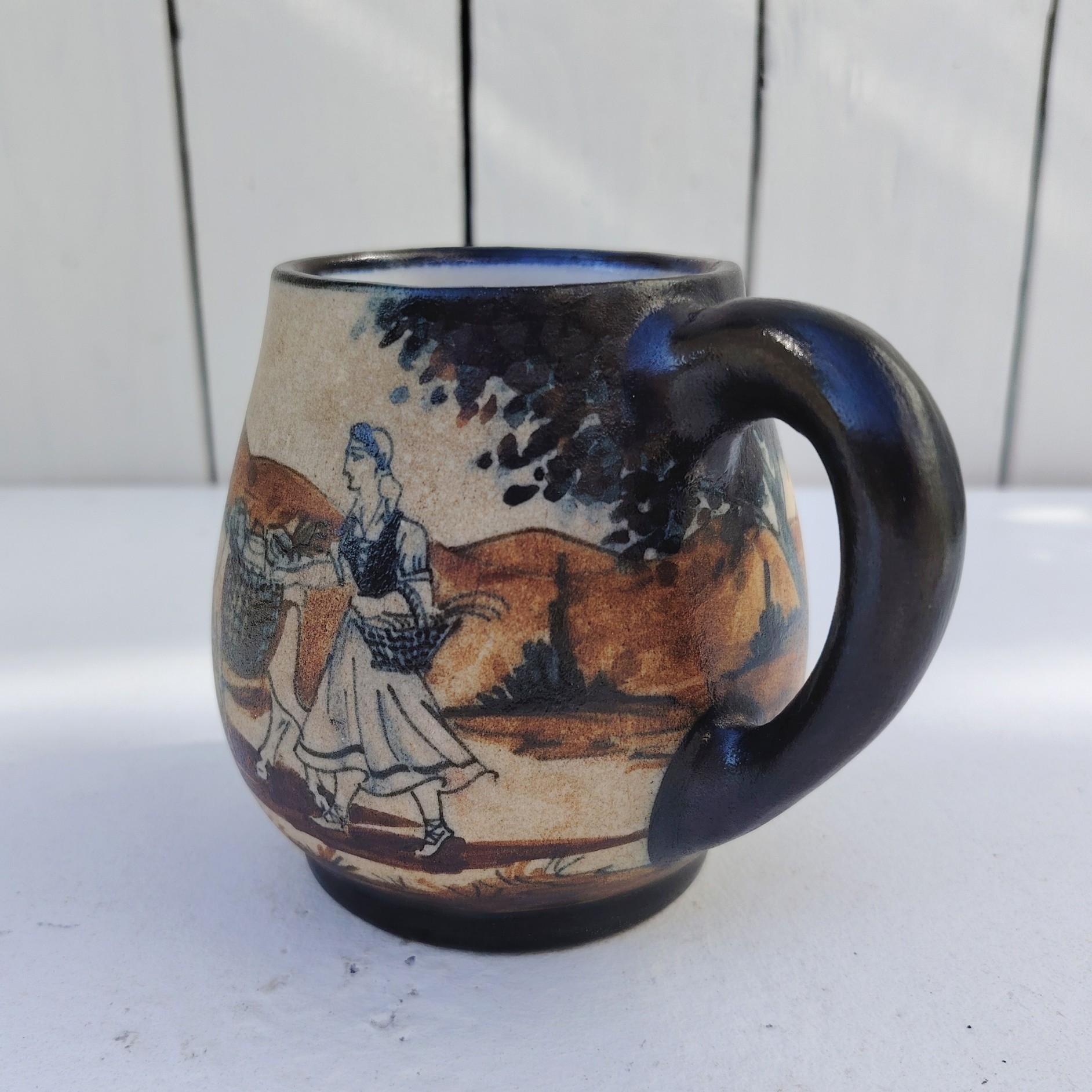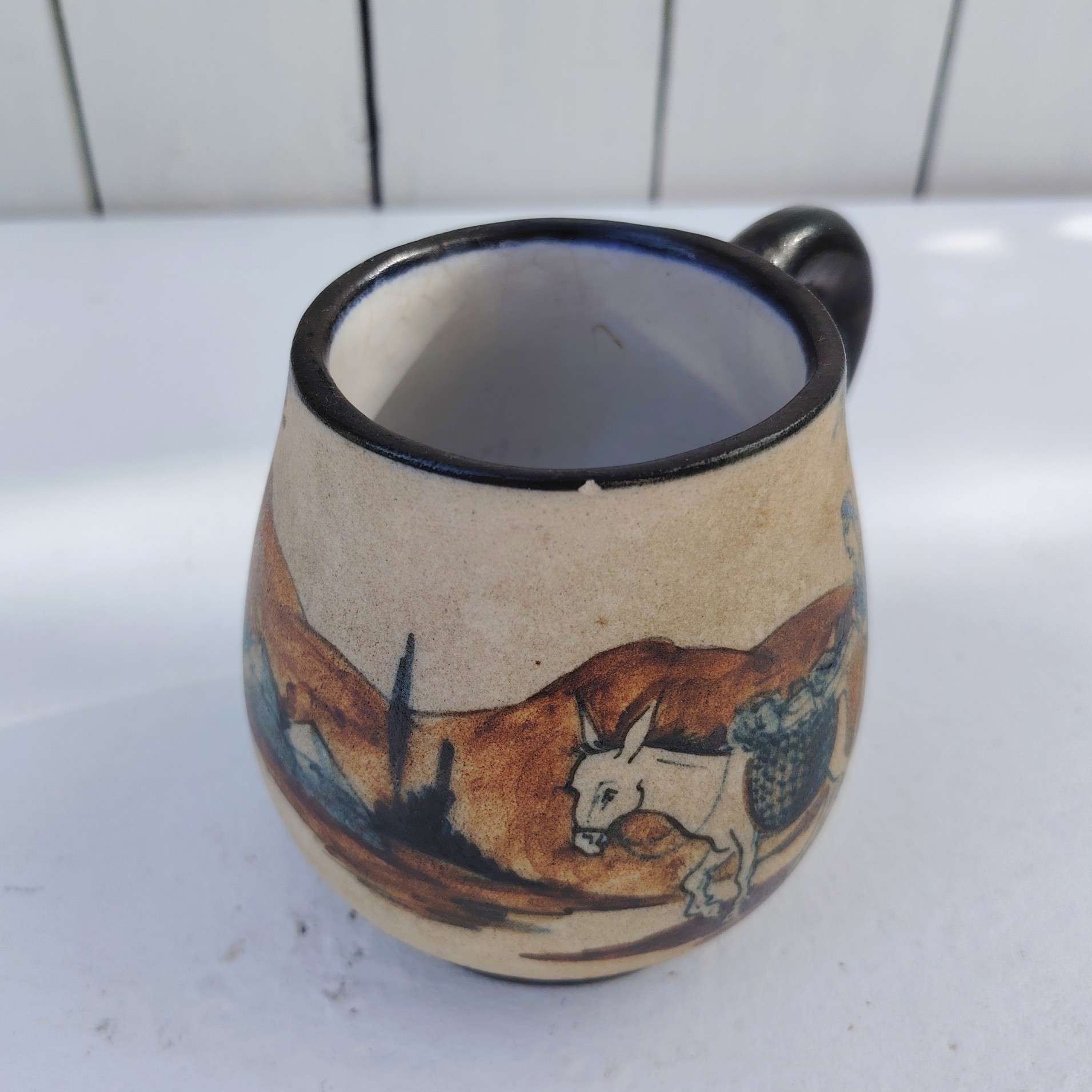 Tasse ou mug  provenant de la célèbre poterie de Ciboure, à décor d’une femme basque revenant du marché avec son ane. Signé sur le dessous M Fernandez pour Maria Fernandez.