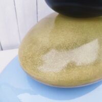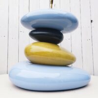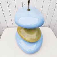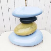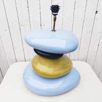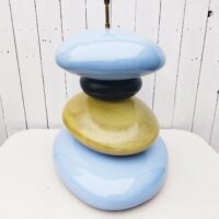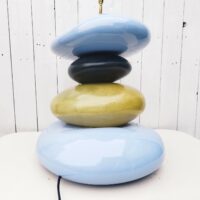 Très grande et élégante lampe en galets de céramique et un galet en fibre de verre par François Chatain. Dans les tons de verts et bleus. Douille montée sur rotule permettant de diriger l’ampoule. Etiquette d’origine.