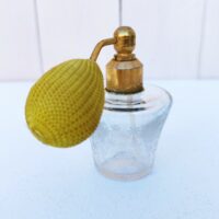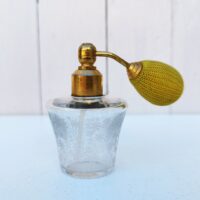 Petit et élégant vaporisateur en cristal de Baccarat. Décor d’entrelacs ciselé. Poire de couleur dorée.