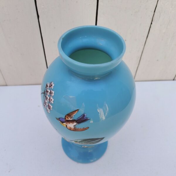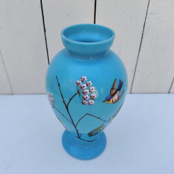 Petit vase balustre sur piédouche en opaline style Napoléon III, à décor de bouquet de fleurs émaillée et un oiseau en relief.